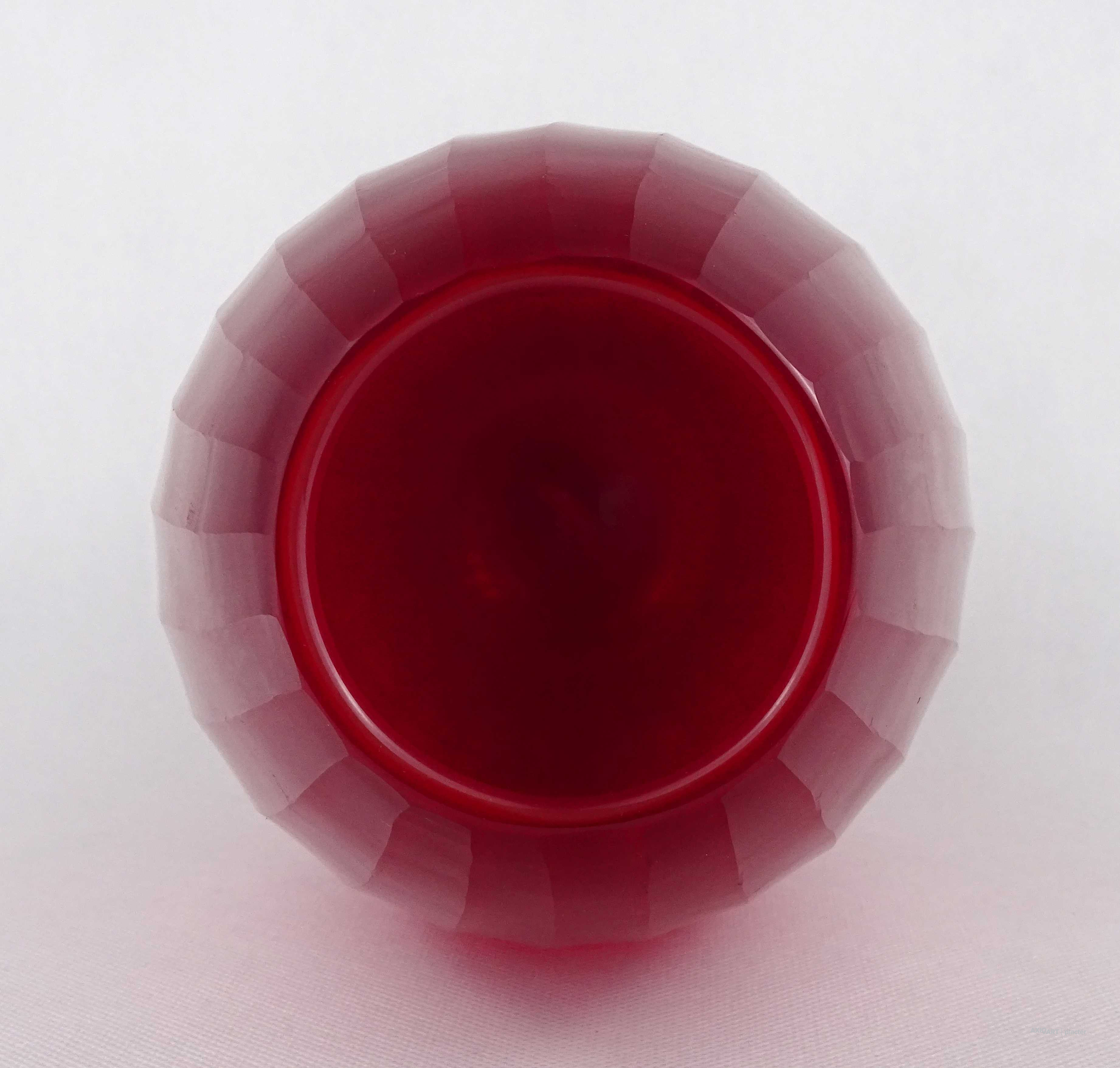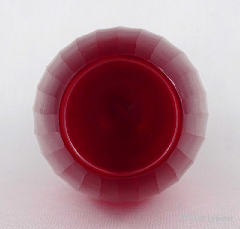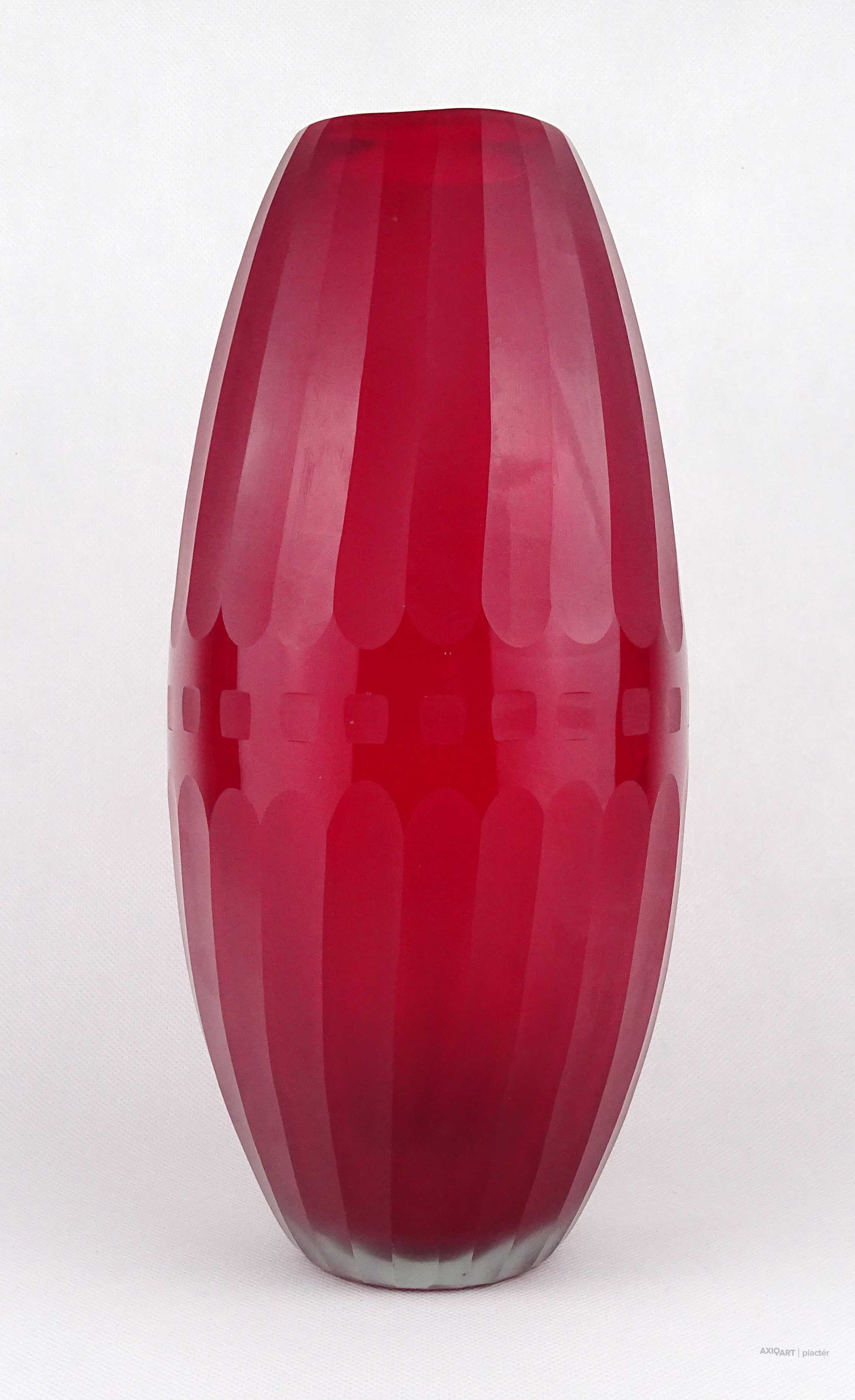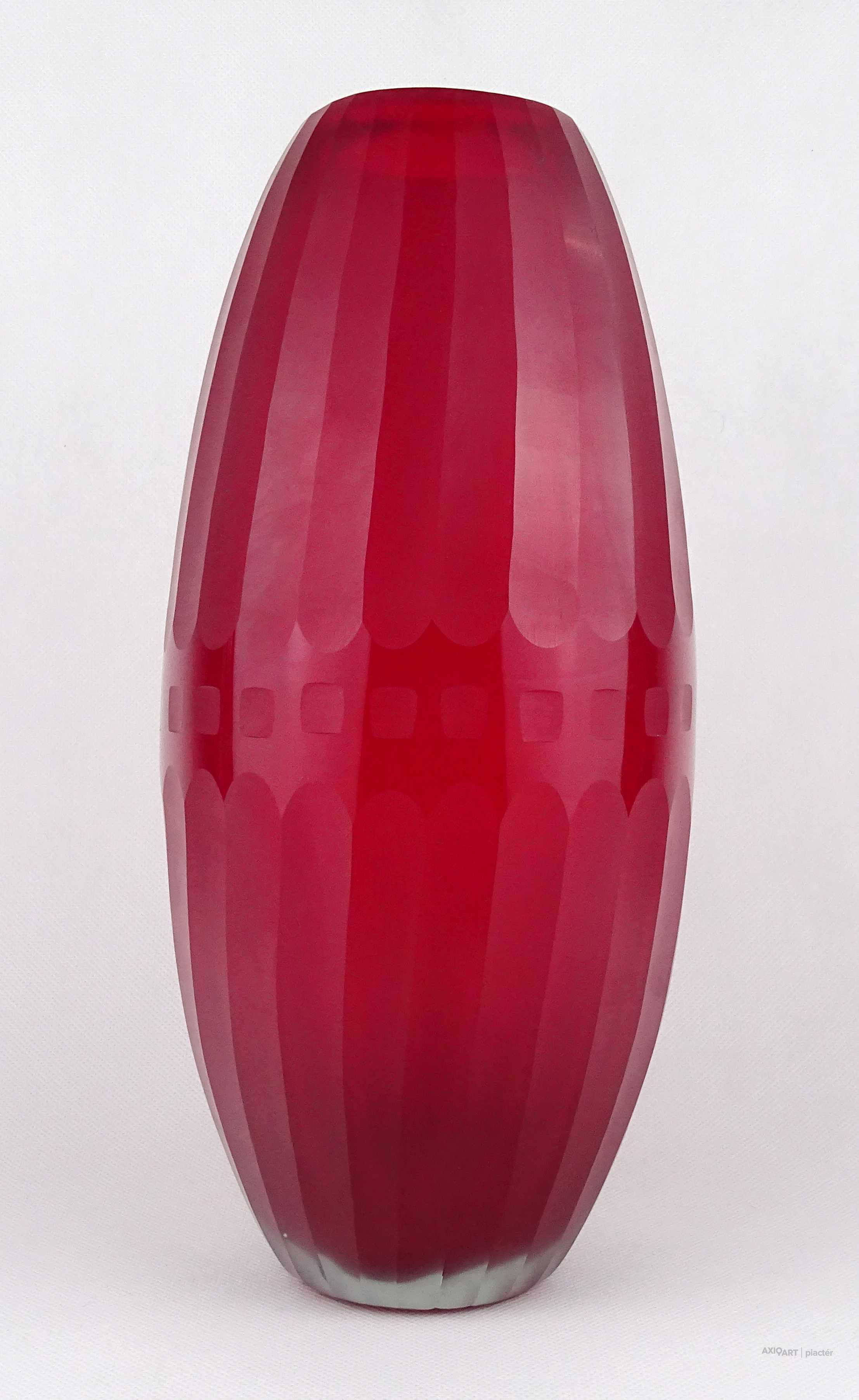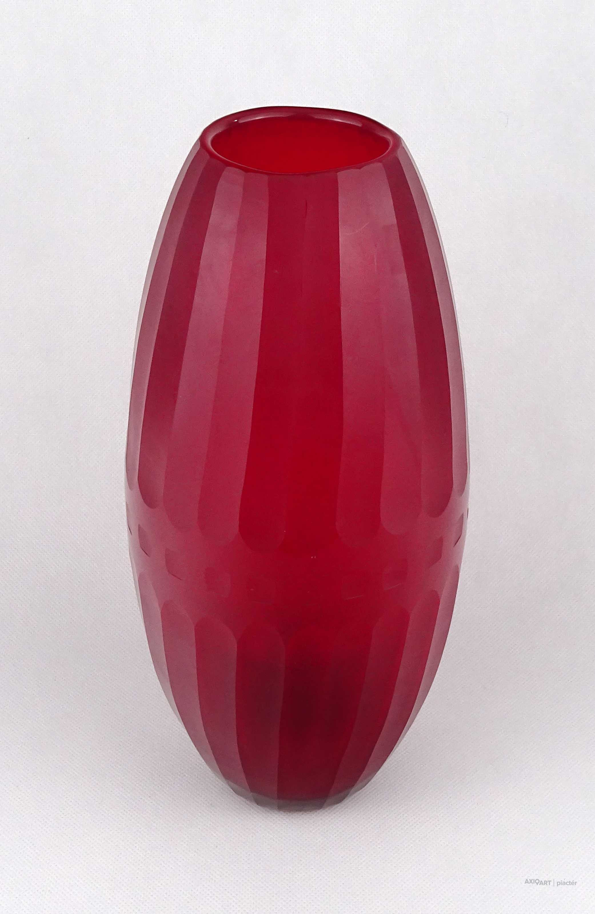 Hibátlan állapotú, nagyméretű, bordóra színezett, bordásra csiszolt és geometrikus mintákkal díszített, vastagfalú, art deco fújtüveg design váza, díszváza. Alján a fújás és szakítás nyoma szépen csiszolással lett eltüntetve. Látványos, gyűjteménybe illő darab.