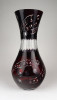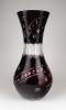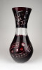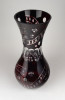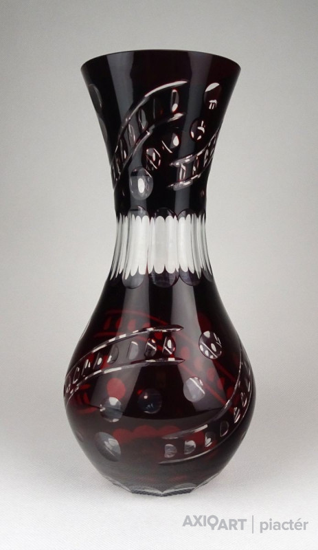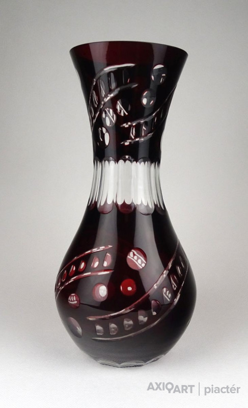 [1B479/X212] Hibátlan állapotú, nagy méretű, bordóra színezett, csiszolt, gazdagon díszített kristály váza. Magasság: 28 cm Szélesség: 13.5 cm Súly: 0.93 kg   Magassága 37 cm, átmérője 17 cm. Súlya: 1668 g