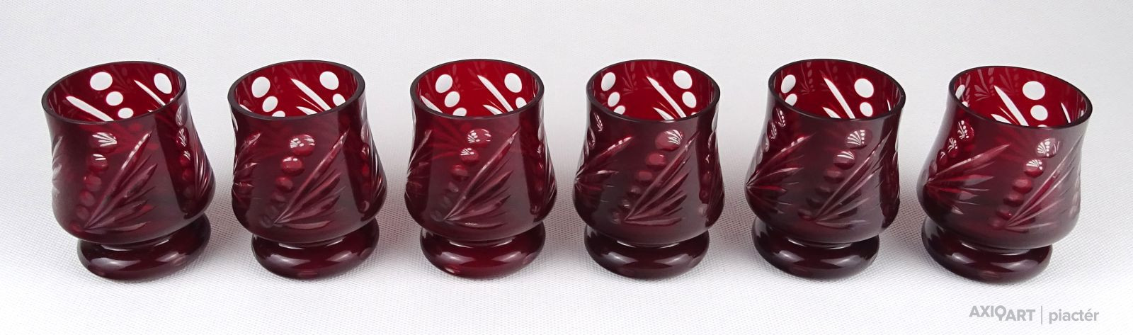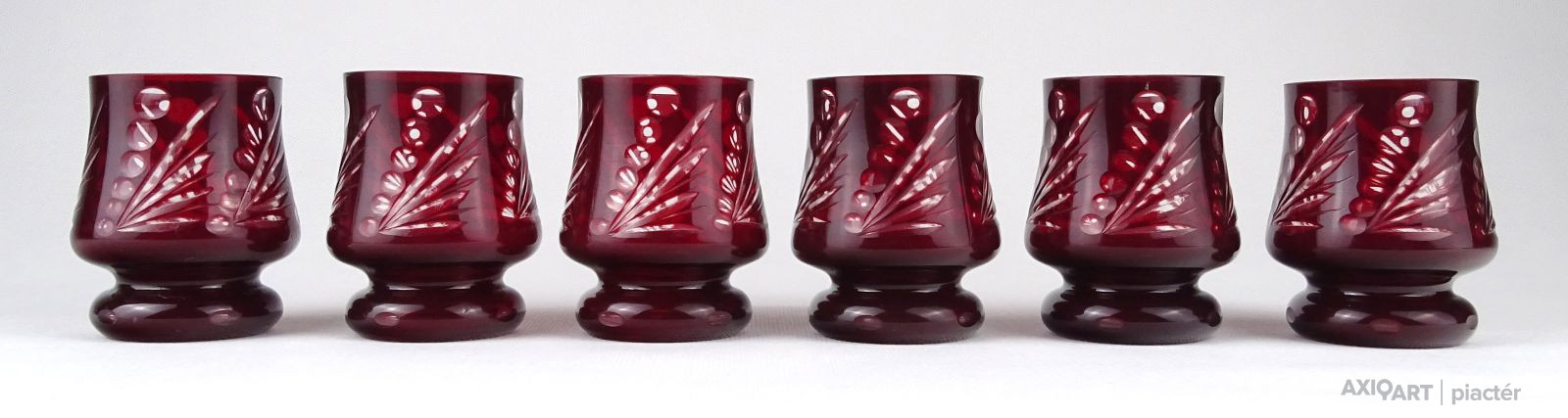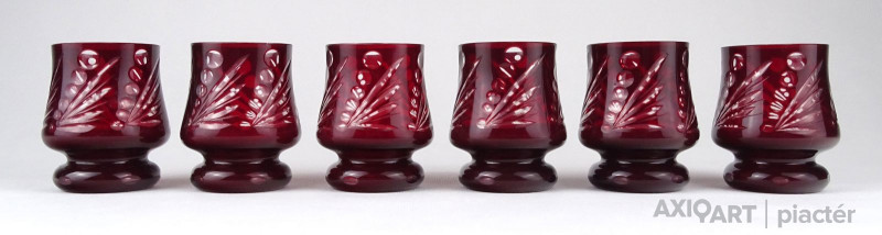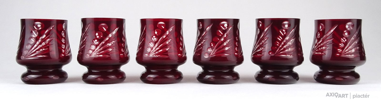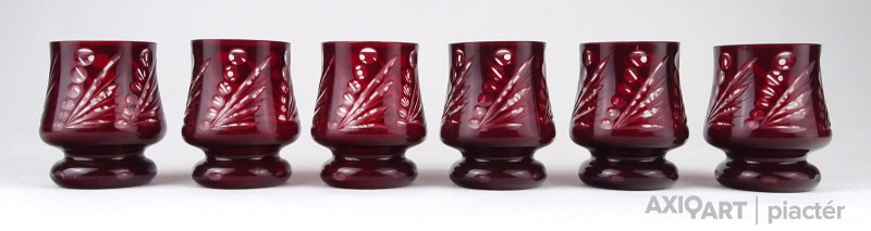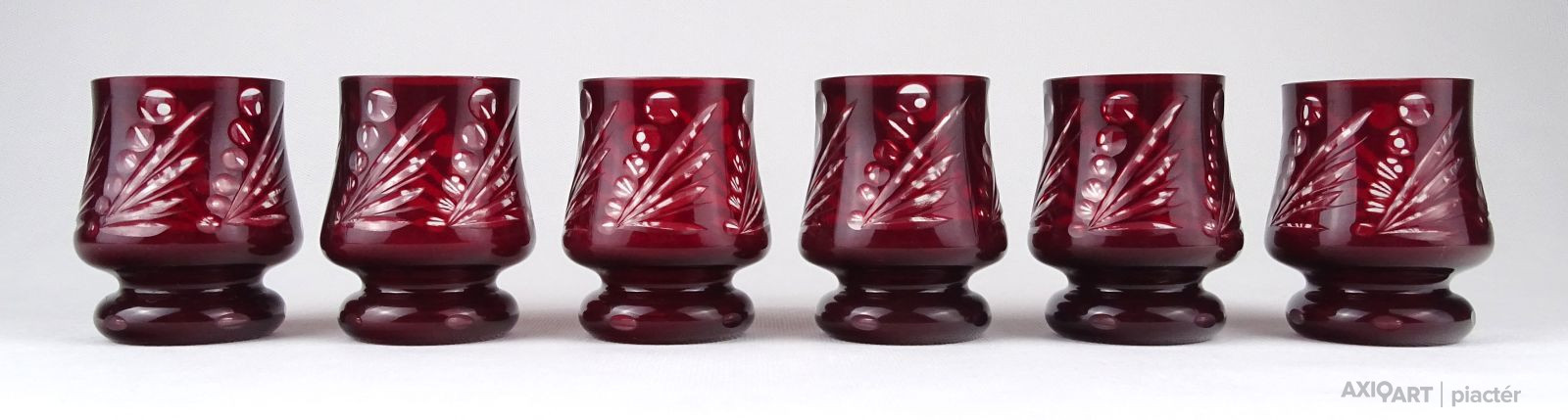 Régi, szép állapotú anyagában bordóra színezett, csiszolatokkal gazdagon díszített 6 darabos likőrös üveg pohár készlet.