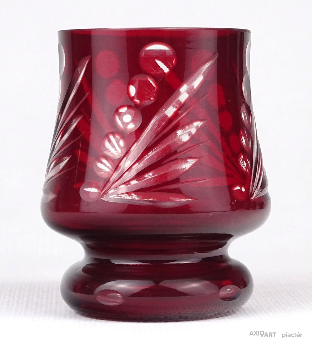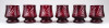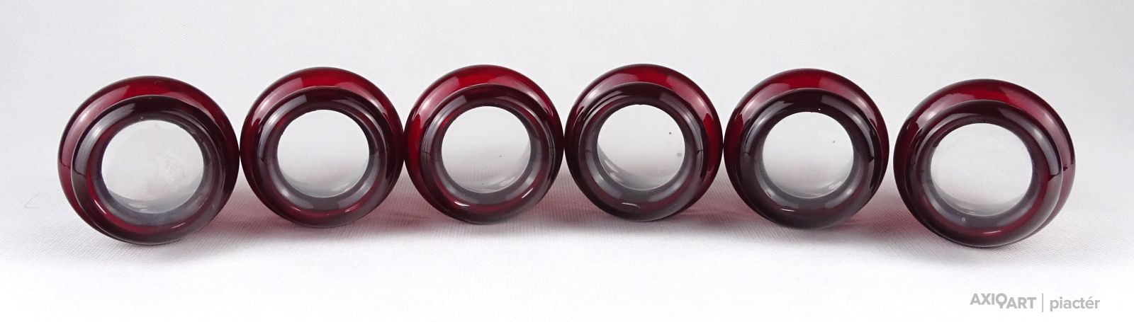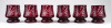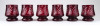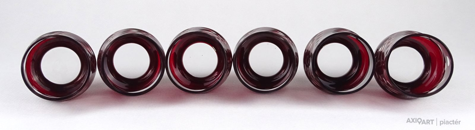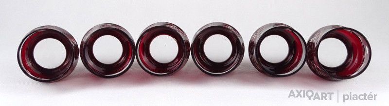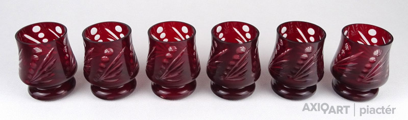 Régi, szép állapotú anyagában bordóra színezett, csiszolatokkal gazdagon díszített 6 darabos likőrös üveg pohár készlet.