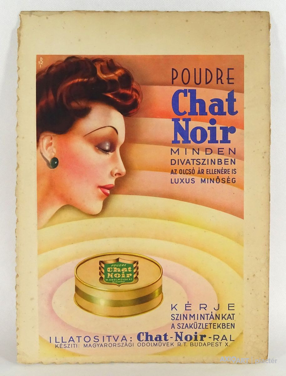 [1G851/073] Régi Chat Noir púder reklám kartonra nyomtatva. Korabeli reklám plakát, reklám relikvia. Feliratok: POUDRE CHAT NOIR MINDEN DIVATSZINBEN AZ OLCSÓ ÁR ELLENÉRE IS LUXUS MINŐSÉG KÉRJE SZINMINTÁNKAT A SZAKÜZLETEKBEN ILLATOSITVA: CHAT-NOIR-RAL KÉSZITI: MAGYARORSZÁGI ODOLMŰVEK R.T. BUDAPEST X. Magasság: 43 cm Szélesség: 31 cm Súly: 0.1 kg