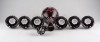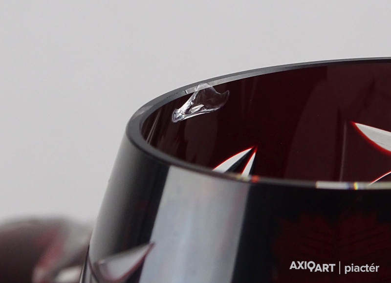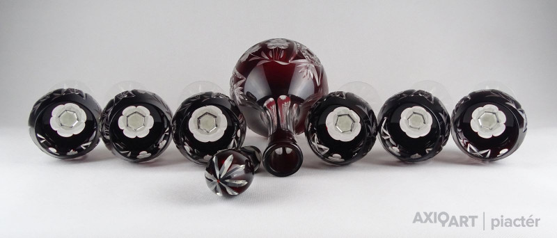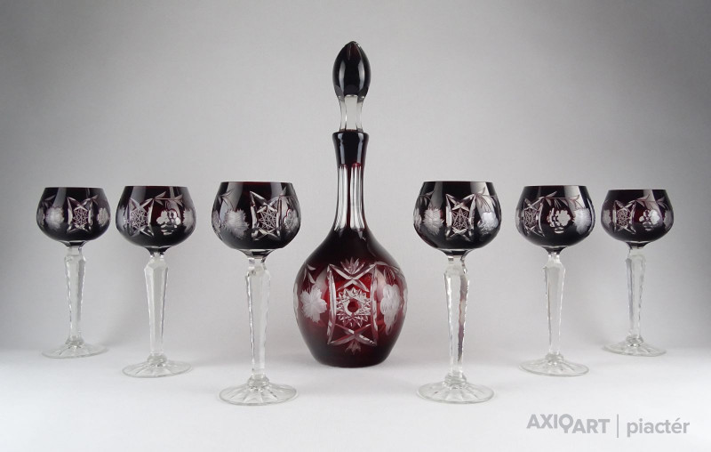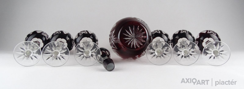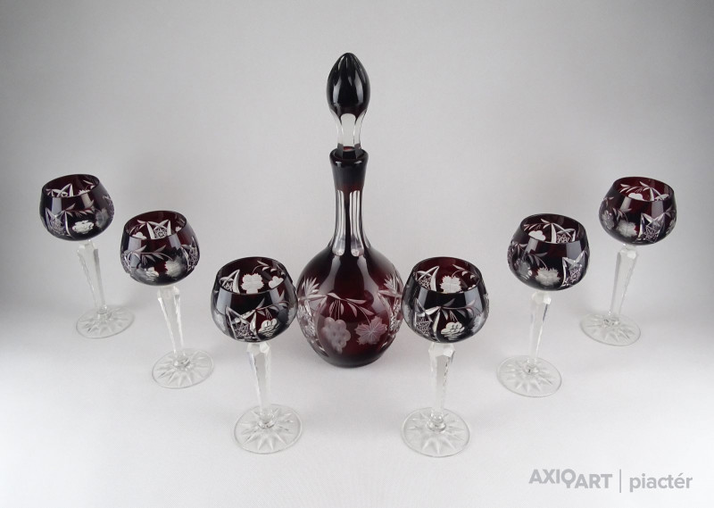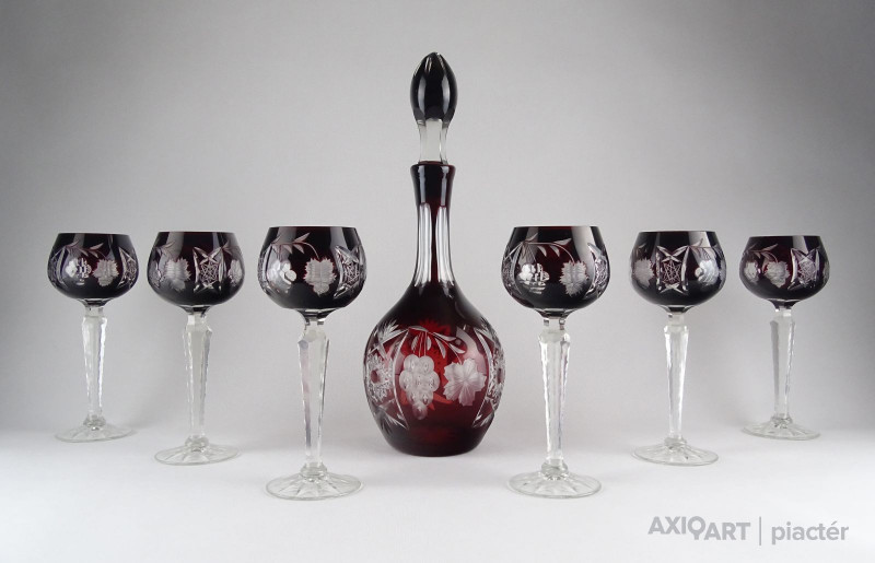 Szép állapotú, bordó színű, csiszolatokkal gazdagon díszített kristály kínáló készlet, nagyméretű dugós üveggel. A darabokon szőlőfürt és szőlőlevél motívumok láthatók. Az egyik pohárnál picike belső lepattanás. Lásd fotó!