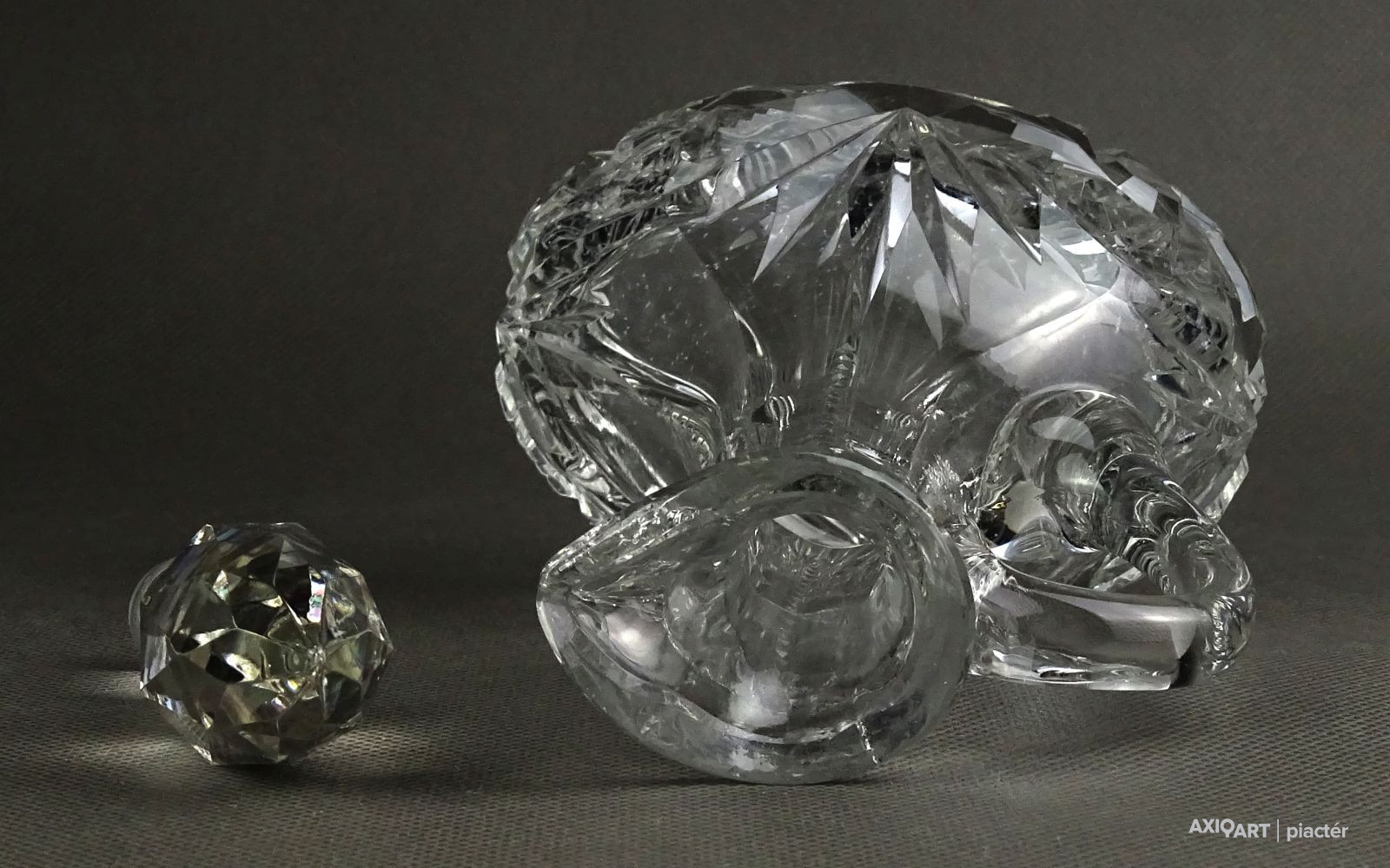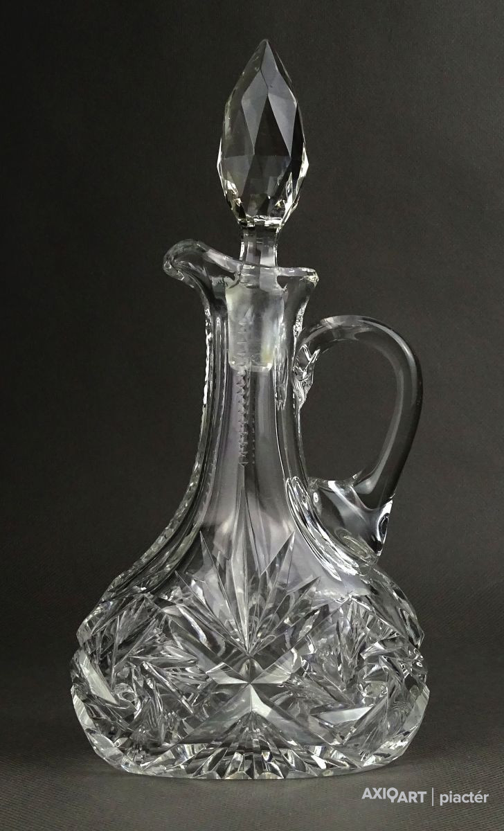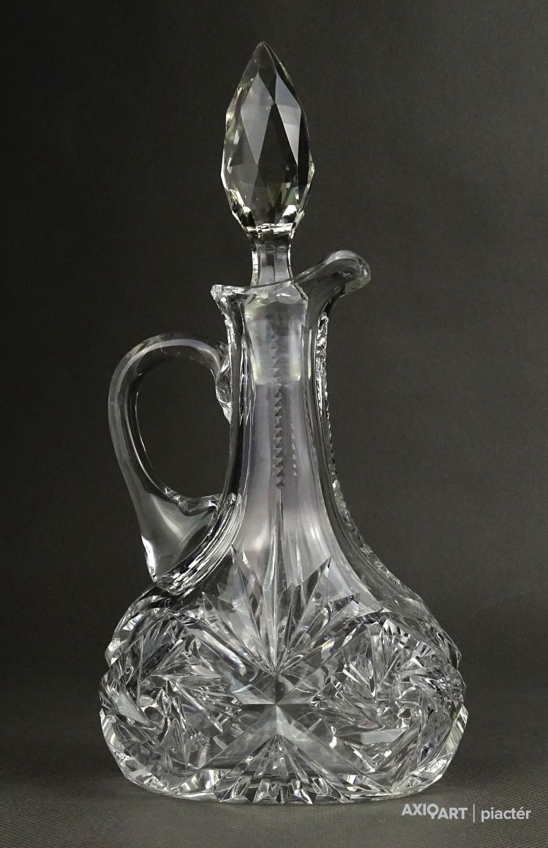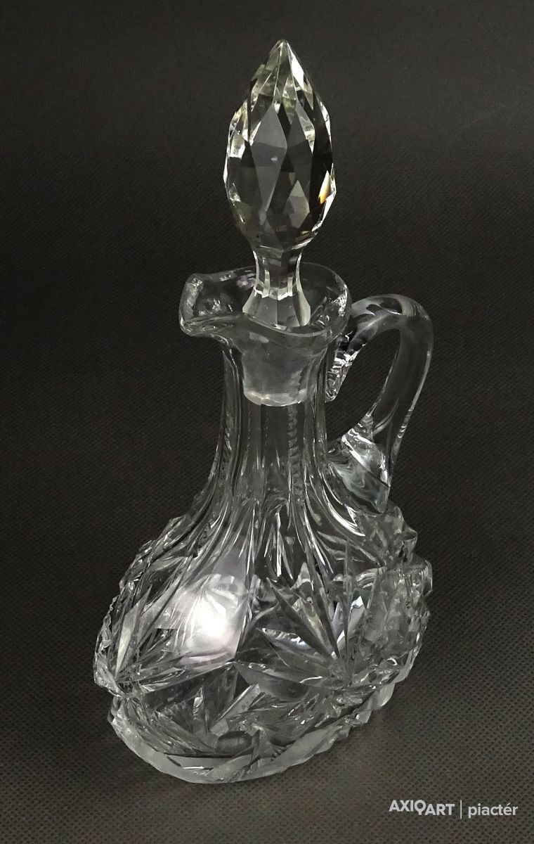 [1Q768/X112] Hibátlan állapotú ecetes vagy olajos üveg kiöntő csiszolt üveg dugóval. A testet gyönyörű kézi csiszolás díszíti. Magasság: 21 cm Szélesség: 10.5 cm Súly: 0.455 kg