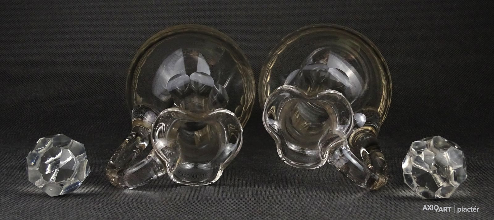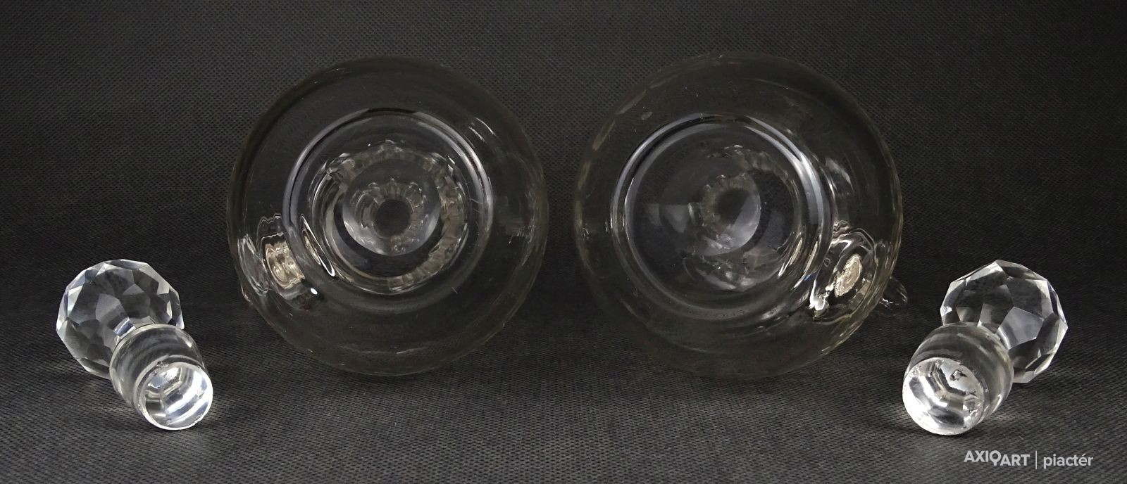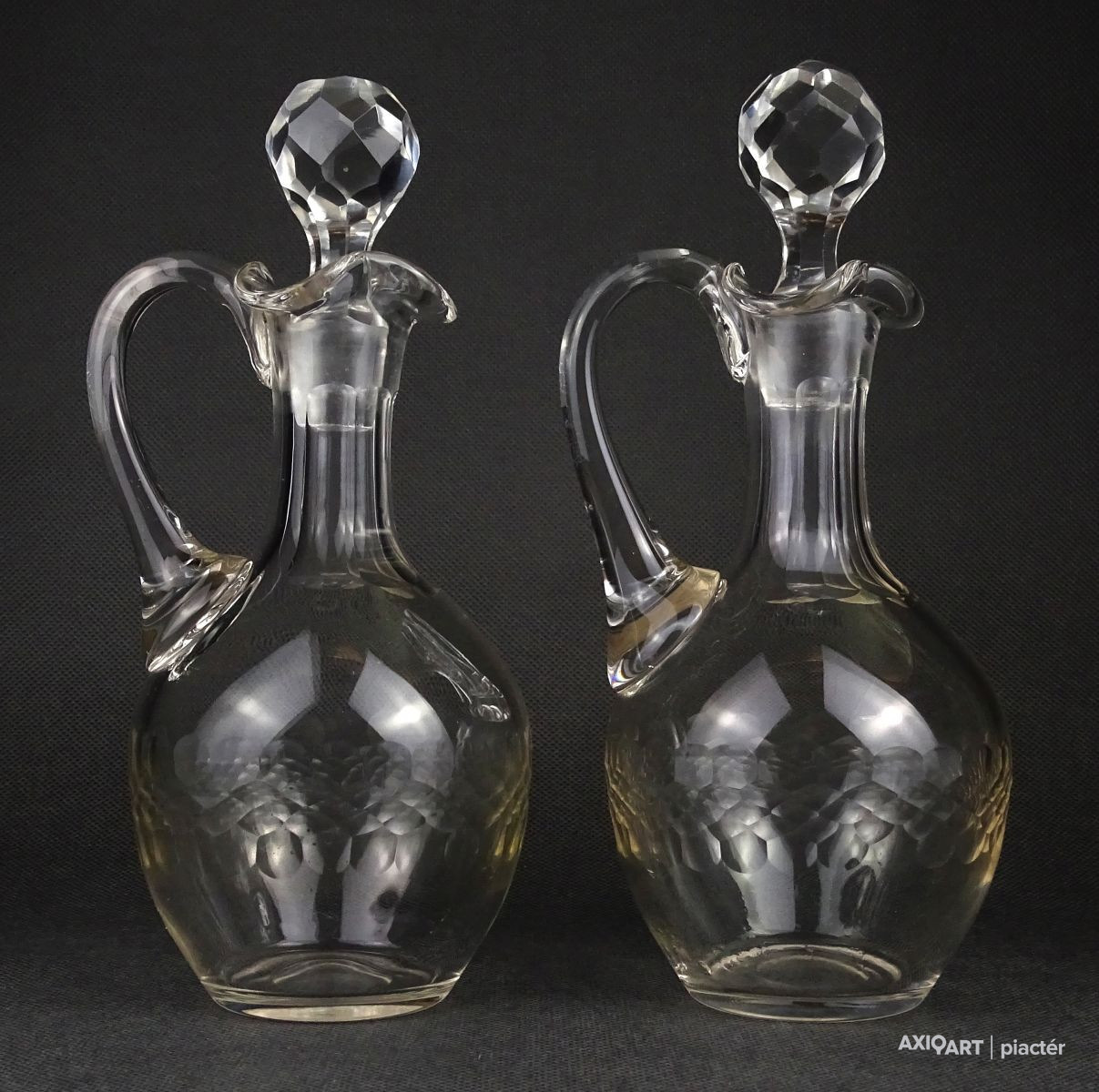Szép állapotú körben csiszolatokkal díszített ecetes és olajos üveg kancsó, kiöntő. A két kiöntő között fél centi különbség van. Talpukon a fúvás, szakítás kicsiszolt nyoma szépen látható.