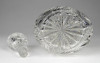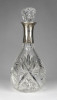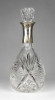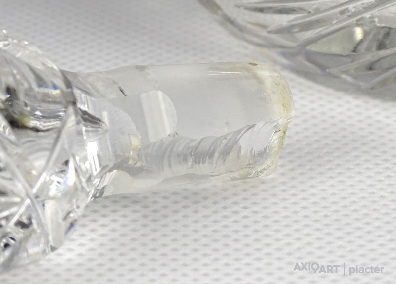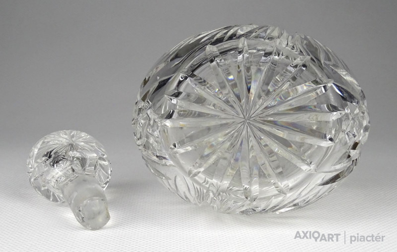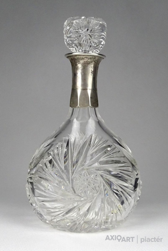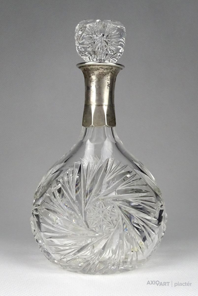 Régi, gyönyörű, mély csiszolatokkal díszített üveg röviditalos, likőrös üveg kínáló, eredeti csiszolt üveg dugójával. Az üveg nyakán ezüstözött rátét található. A dugó üvegben lévő (nem látható) része lepattant, lásd fotó.