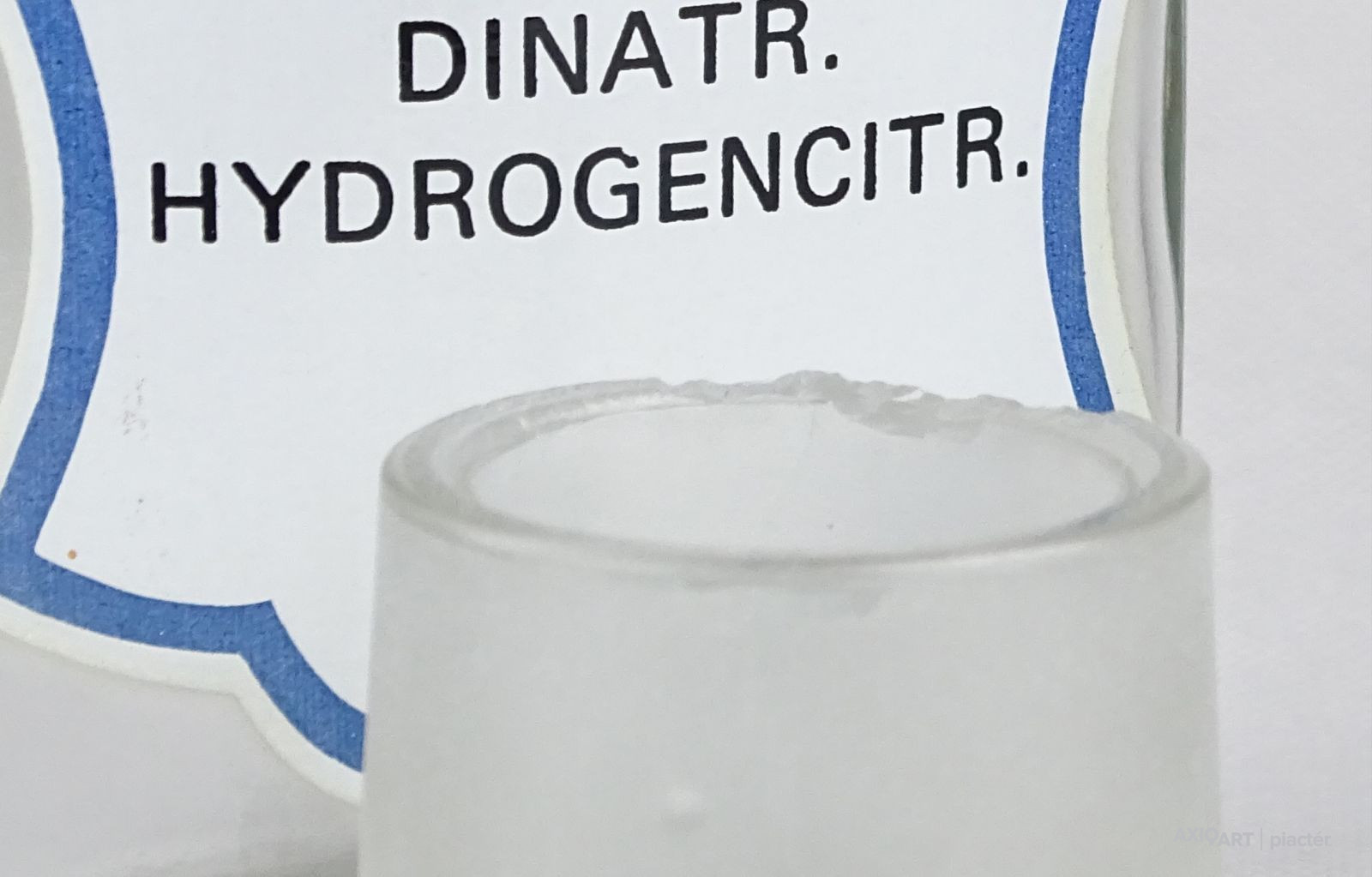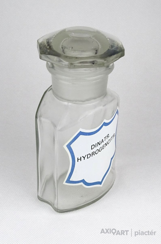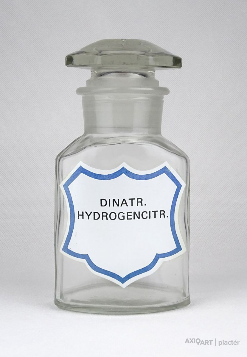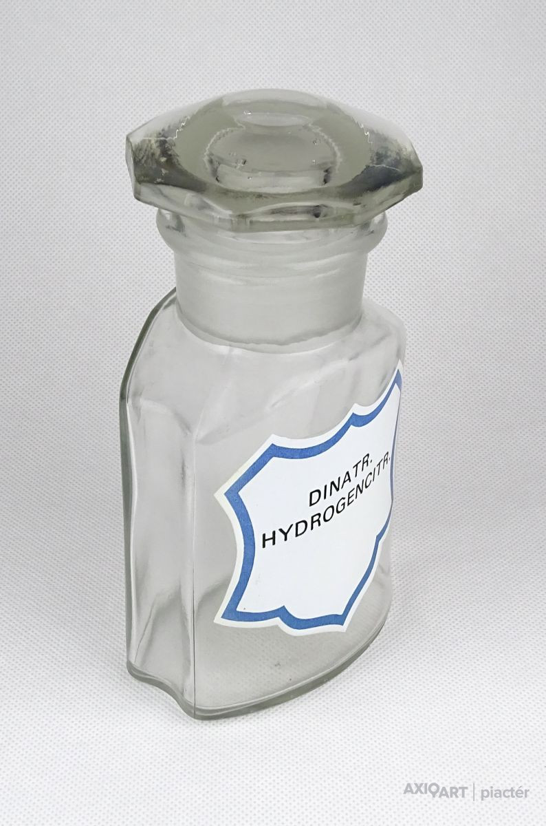 [0Y754/UZ-N] Régi, szép állapotú, áttetsző patika üveg, gyógyszerészeti tároló üveg. Oldalán címke, rajta felirat: DINATR HYDROGENCITR Magasság: 16 cm Szélesség: 8 cm Súly: 0.445 kg