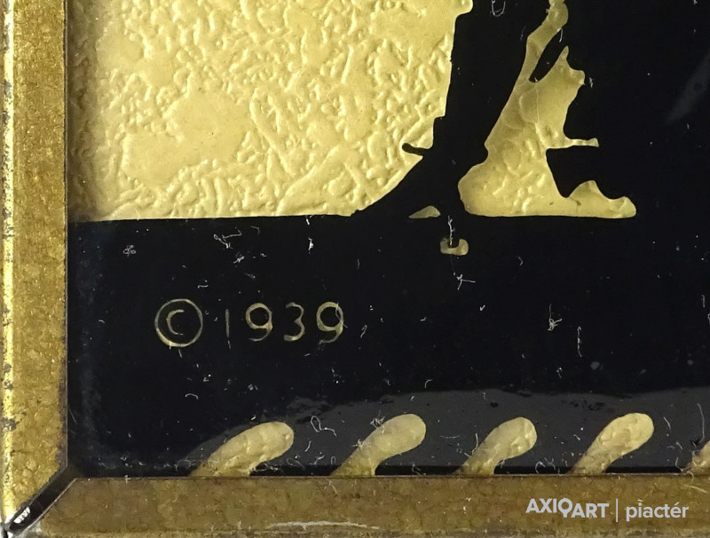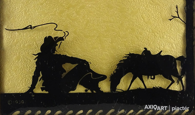 [1A463/X164] Régi, fém keretbe foglalt, domború üvegre festett, datált árnykép. Csikós a lovával ábrázolás. Falra akasztási lehetőséggel rendelkezik. Dátum balra lent: 1939 Magasság: 20.5 cm Szélesség: 15.5 cm Súly: 0.2 kg