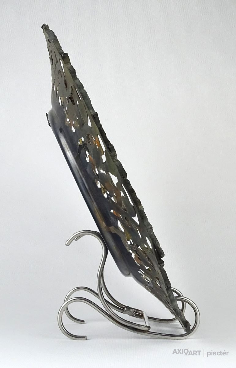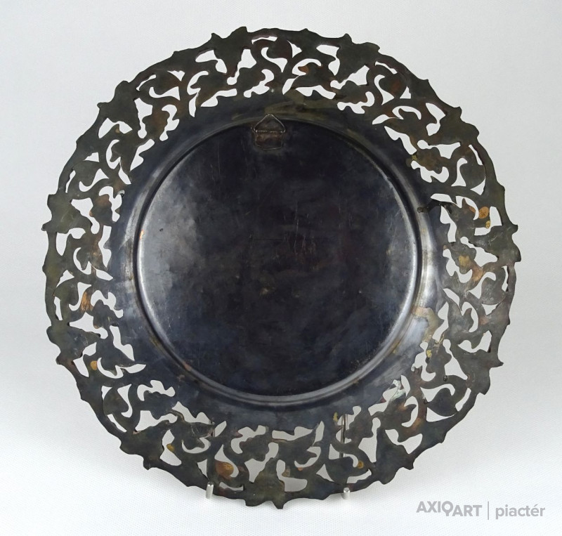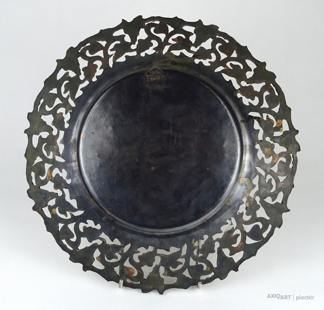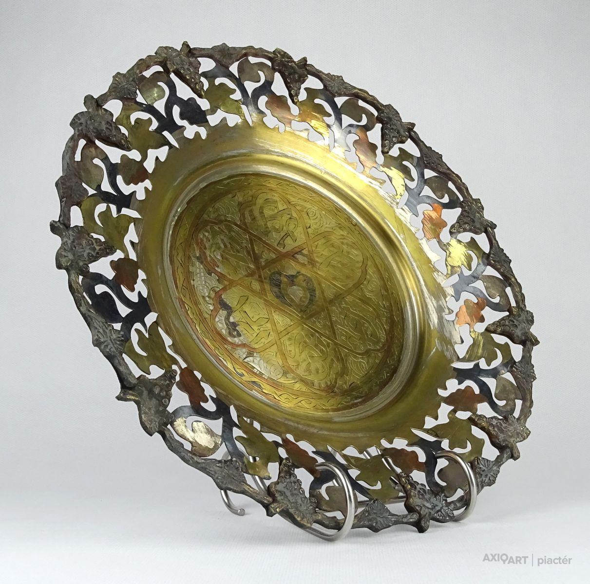 Szép állapotú, díszes réz egyiptomi fali dísz tál. Szélén körben plasztikus szőlő díszítésekkel. Falra akasztási lehetőséggel rendelkezik, de mérete miatt asztalközép kínáló tál, gyümölcskínáló tálként is használható.