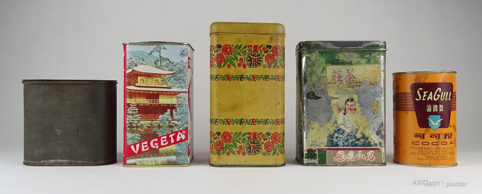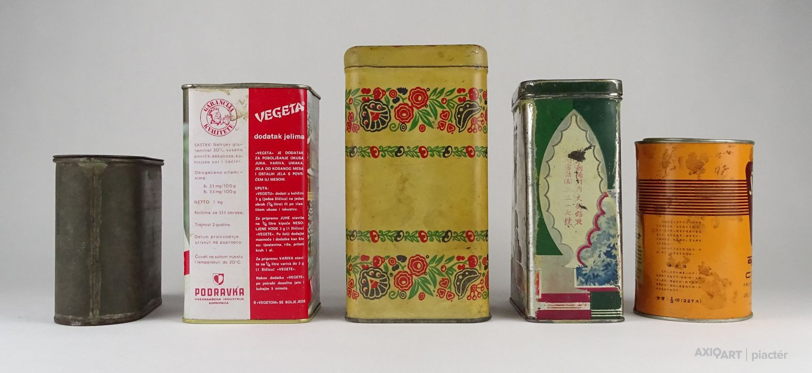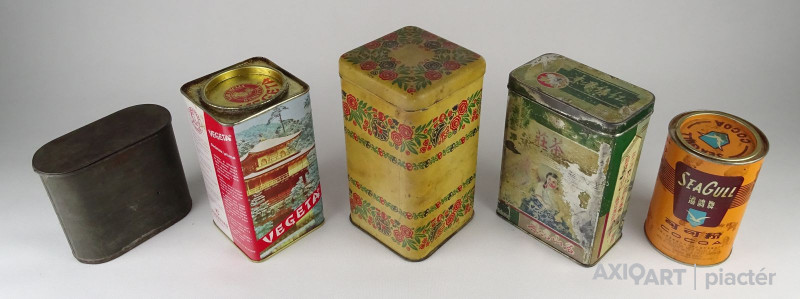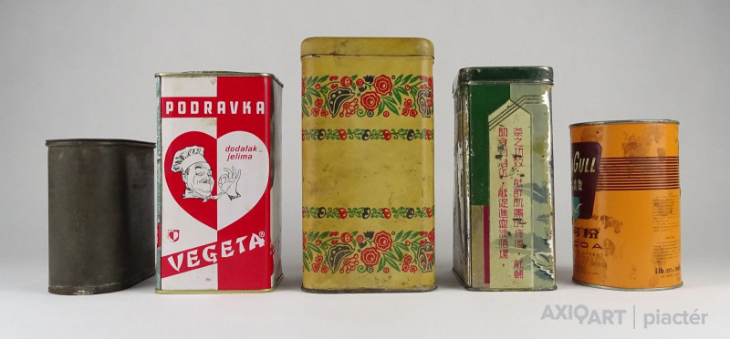 [1N105/X299] Régi fém doboz, pléh doboz, öt darab: - 1 darab nagy méretű népi motívumos doboz (18.7 x 10 x 10 cm) - 1 darab Podravka Vegeta fűszeres, vegetás doboz (16 x 8.5 x 8.5 cm) - 1 darab kínai teás doboz (16.3 x 11.4 x 6.7 cm) - 1 darab Seagull Cocoa kínai kakaós doboz (12.2 x 8 cm) - 1 darab felirat nélküli forrasztott antik bádog doboz (11.2 x 6 x 12.5 cm) Súly: 0.805 kg