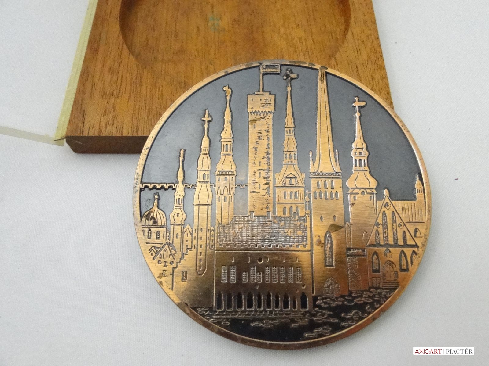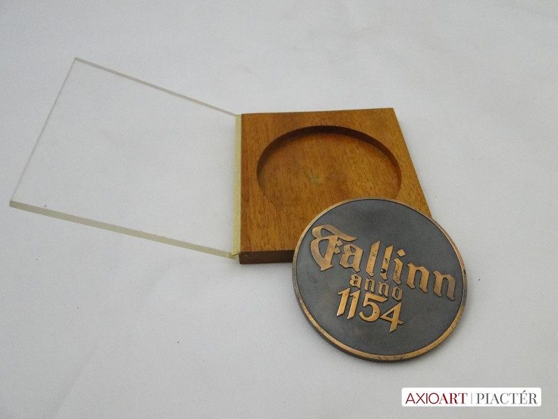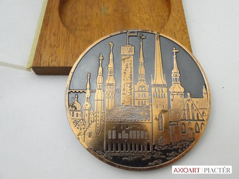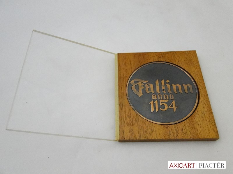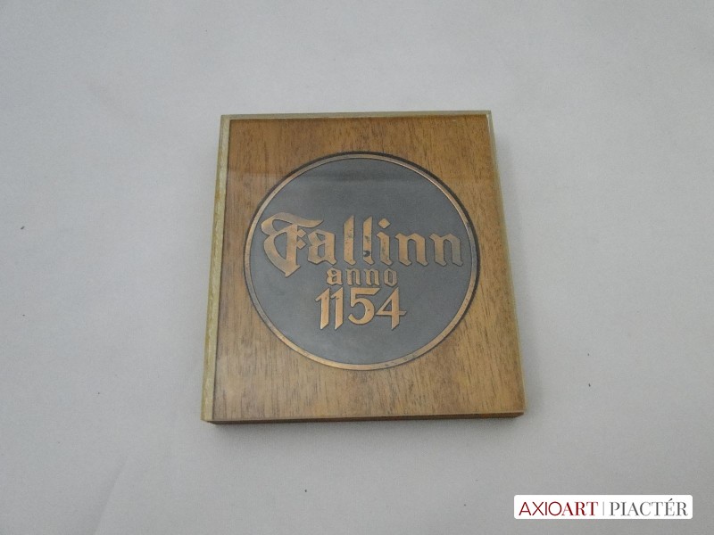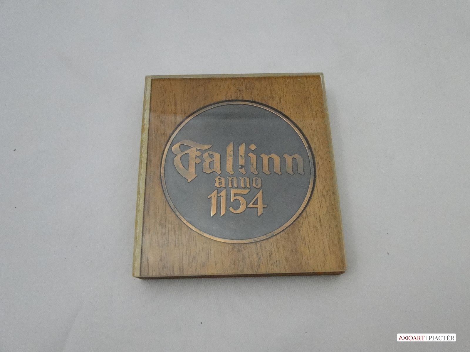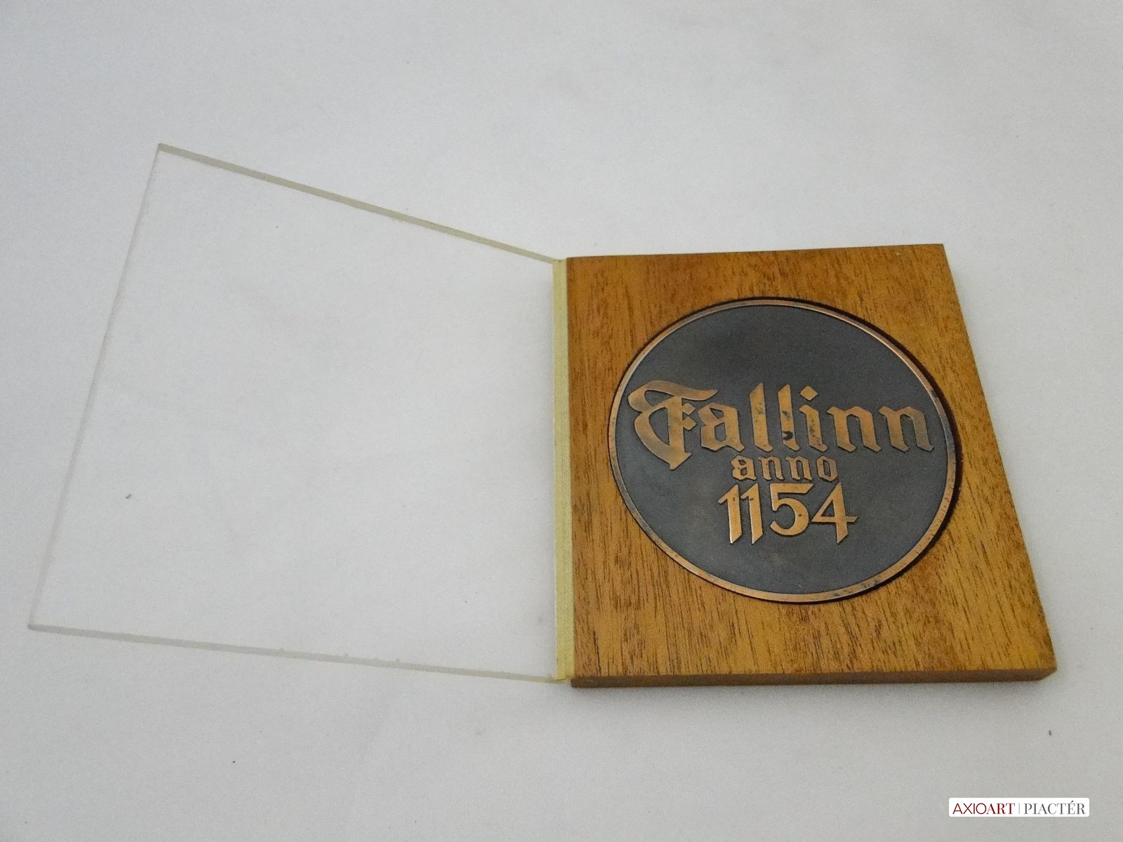 Plexifedeles fa talpba illesztett nagyméretű kétoldalas emlékérem, emlékplakett, díszplakett. Egyik oldalon Tallin városképe látható, másik oldalon felirat: