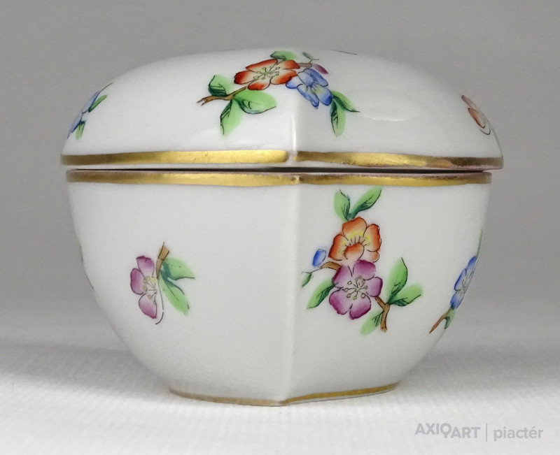 [1P269/Z016] Hibátlan állapotú régi virágmintás szív alakú Herendi porcelán bonbonier. Alján kék Herendi márkajelzés: HEREND HUNGARIA 1941 Mélynyomással: HEREND Formaszám pirossal: 6005 Magasság: 5 cm Szélesség: 6.8 cm Hosszúság: 7.6 cm Súly: 0.09 kg