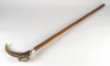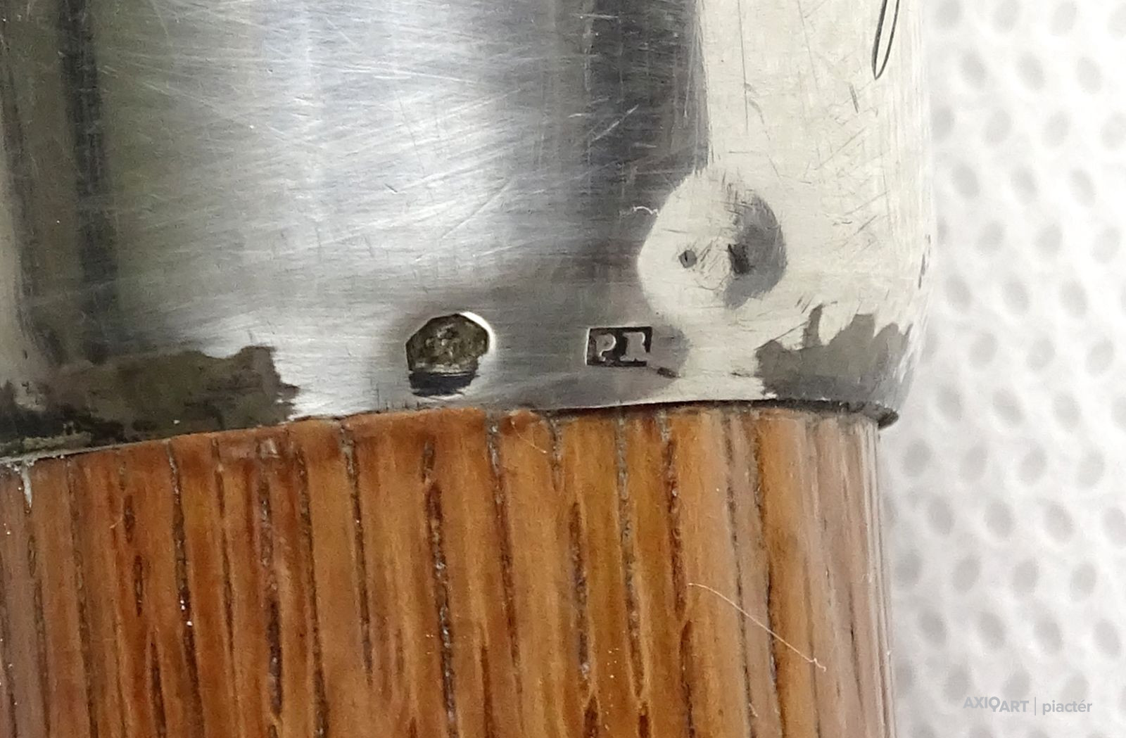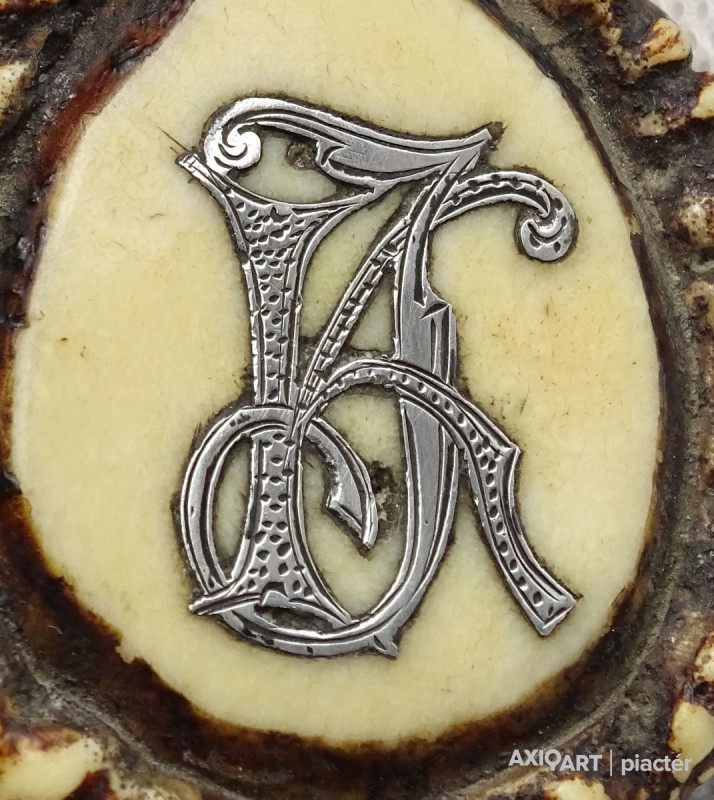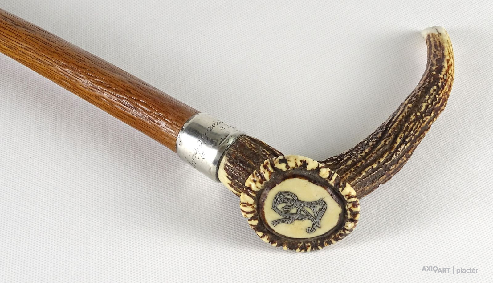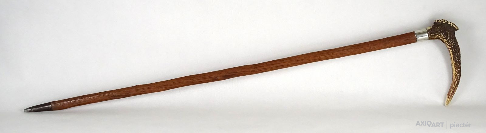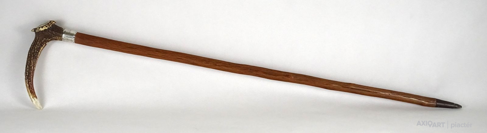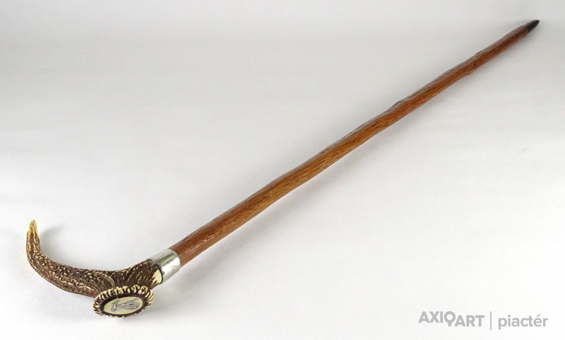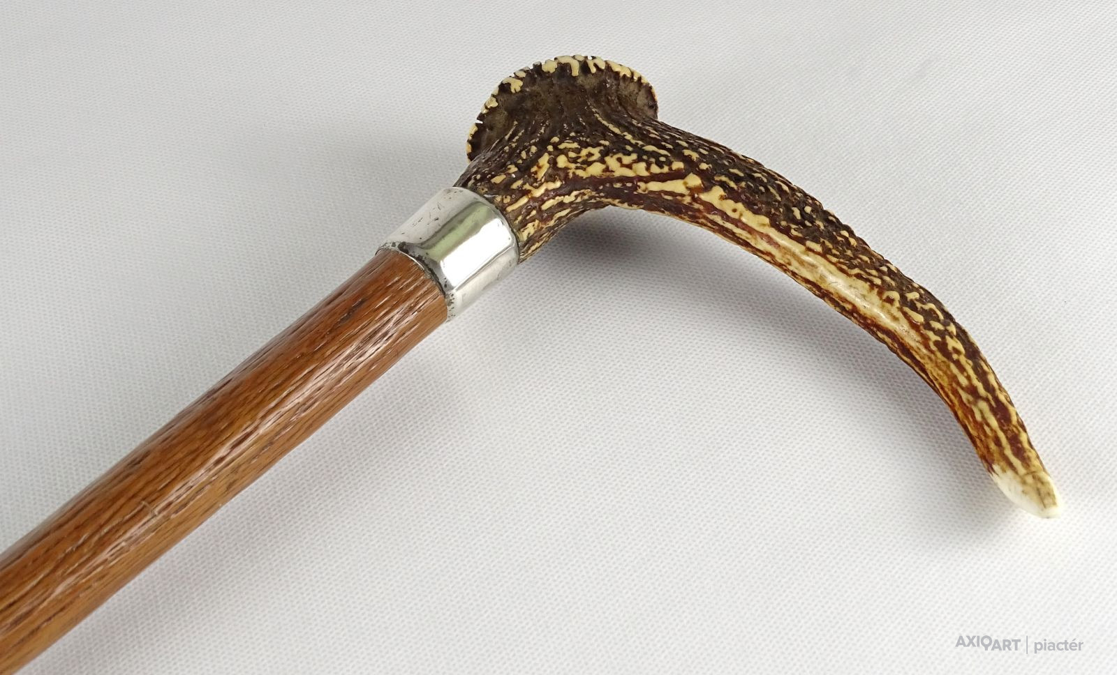[1M987/UZ-N] Régi szögegyenes agancsfejes ágbot, sétabot, túrabot, jelzett ezüst fejjel. Az agancs markolatban ezüst monogram található: K.J. Ezüst gyűrűn beütött ezüst jel és mellette "P.R." mesterjegy található, lásd fotó. A gyűrűn gravírozott név található: KASZÁS JÓZSEF Hosszúság: 91.5 cm Súly: 0.43 kg