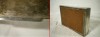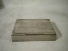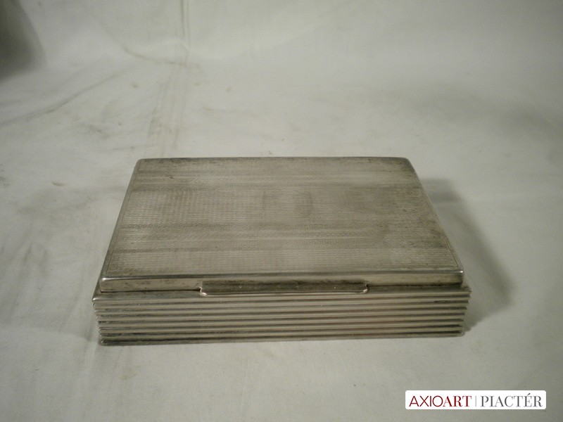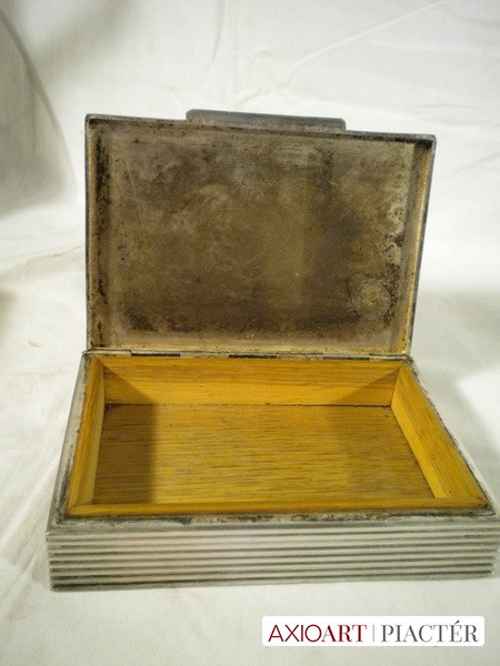 [S714/X012] Fa betétes, fedeles doboz. Szép, ép állapotú darab. Kártyadoboz, szivardoboz, cigaretta doboz. Fül részében mélynyomással PV. ALPAKKA felirat látható. A doboz mintázata az ezüsthöz hasonlatos, szép kígyóbőr szerű kézimunka. Magasság: 3 cm Szélesség: 13.5 cm Hosszúság: 9 cm