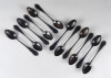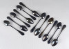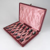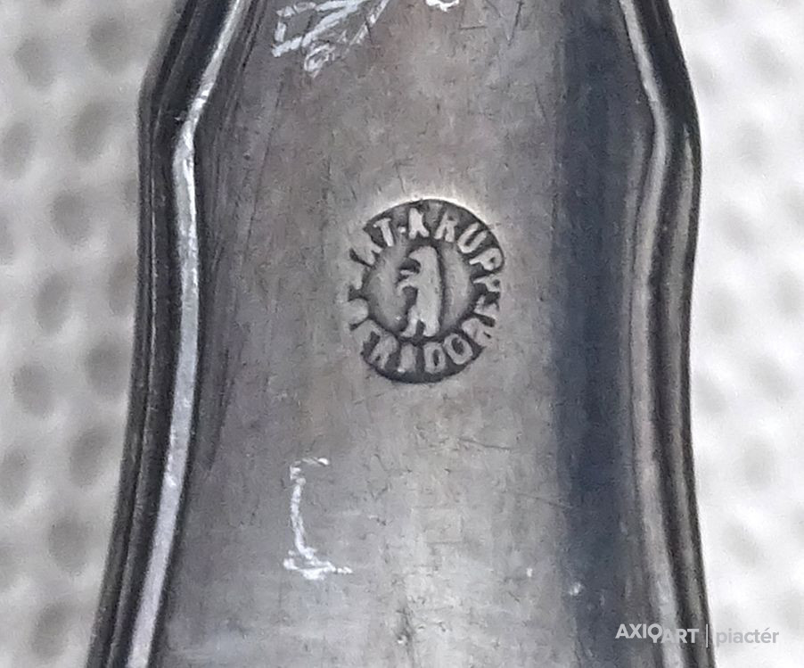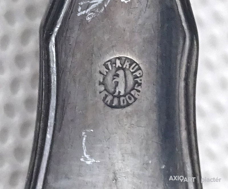 [1R851/X326] Régi, szép állapotú jelzett 12 darabos alpakka kiskanál, mokkáskanál készlet eredeti díszdobozában. A kanalakon medvés jelzés: ART KRUPP BERNDORF A dobozon felirat: ART KRUPP BERNDORF Súly: 0.435 kg
