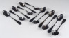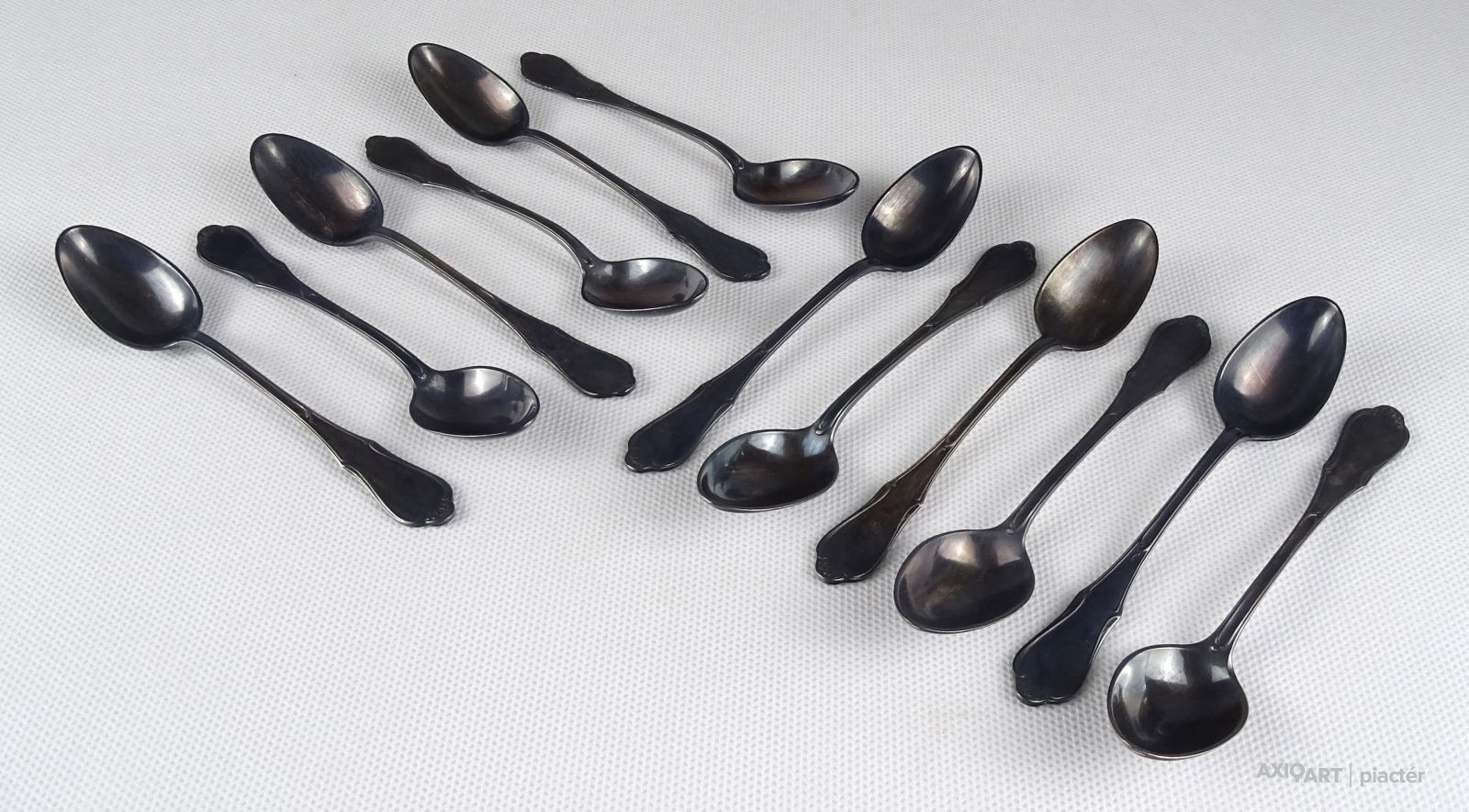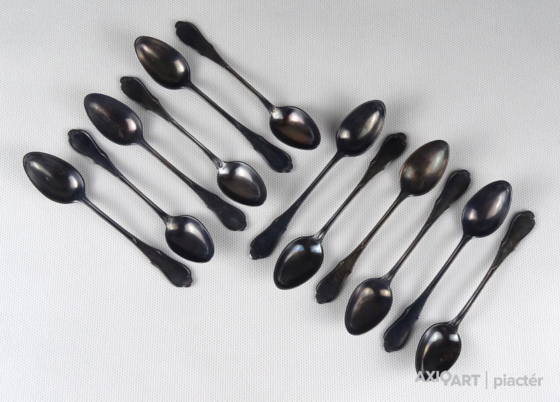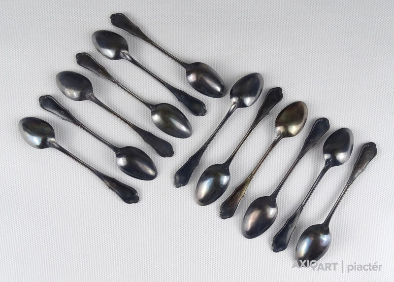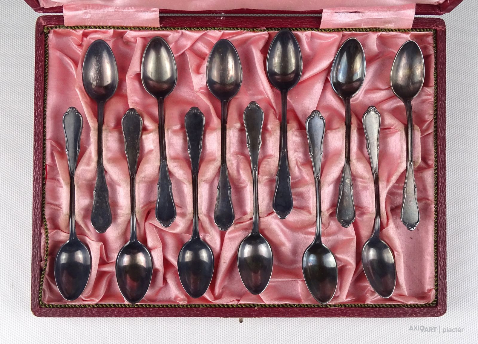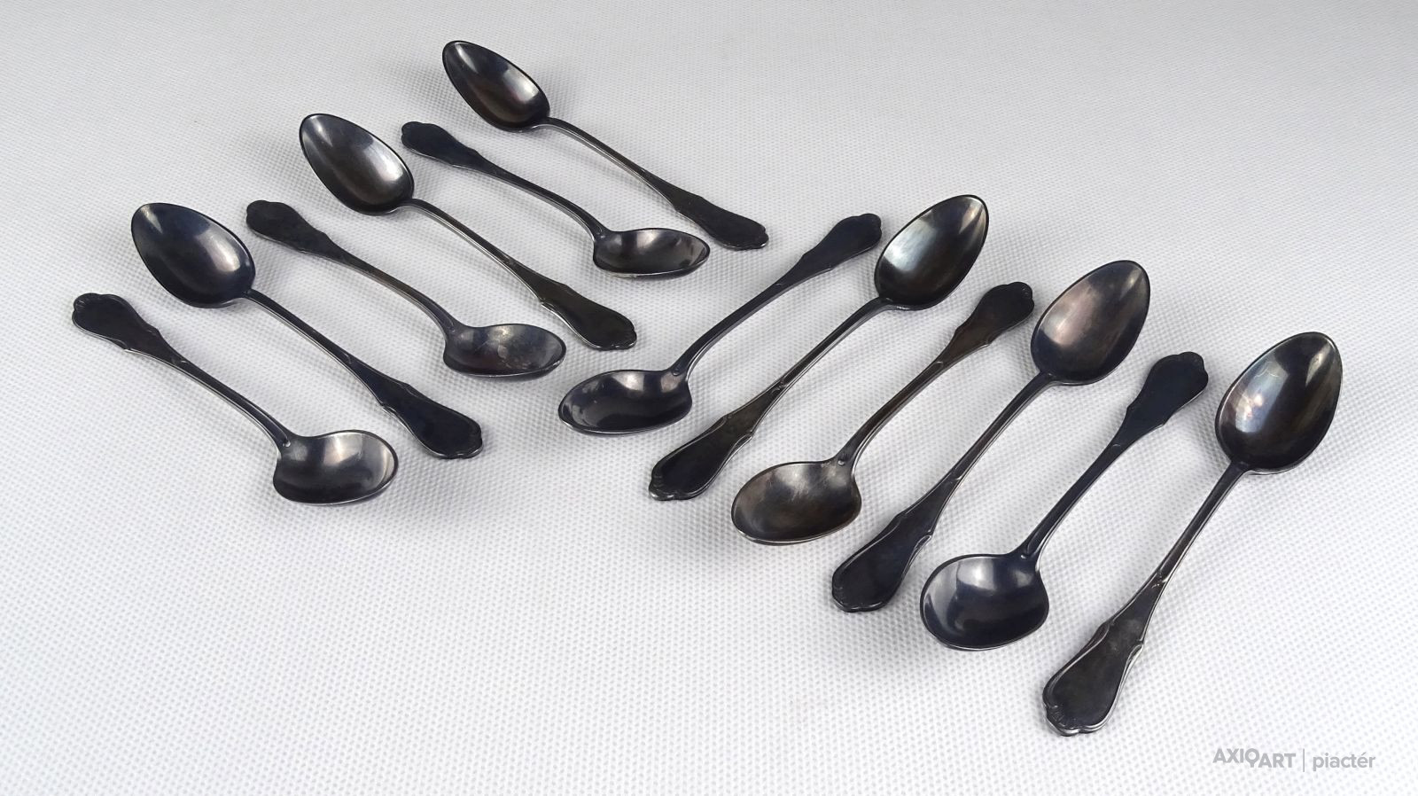 Régi, szép állapotú jelzett 12 darabos alpakka kiskanál, mokkáskanál készlet eredeti díszdobozában.