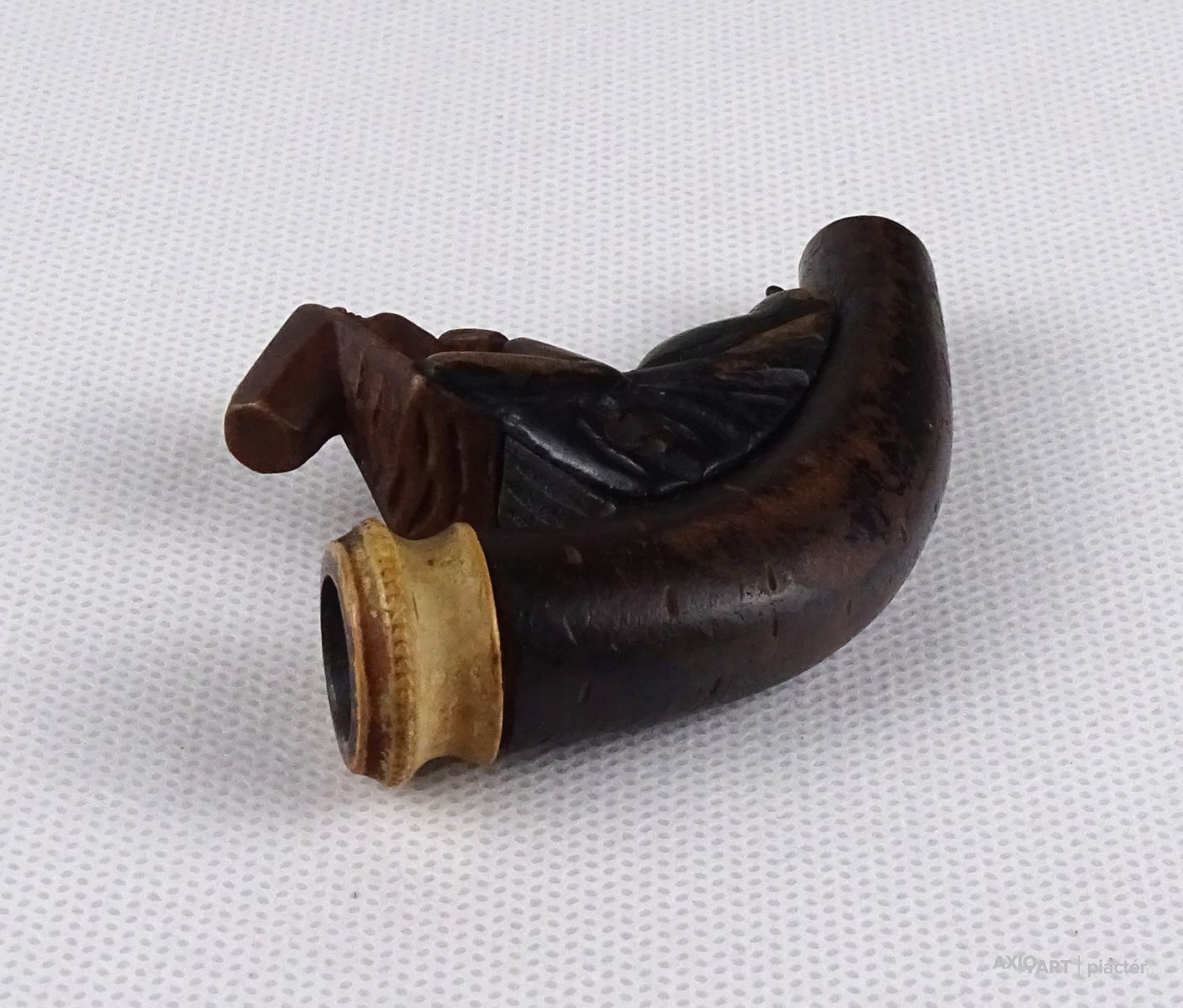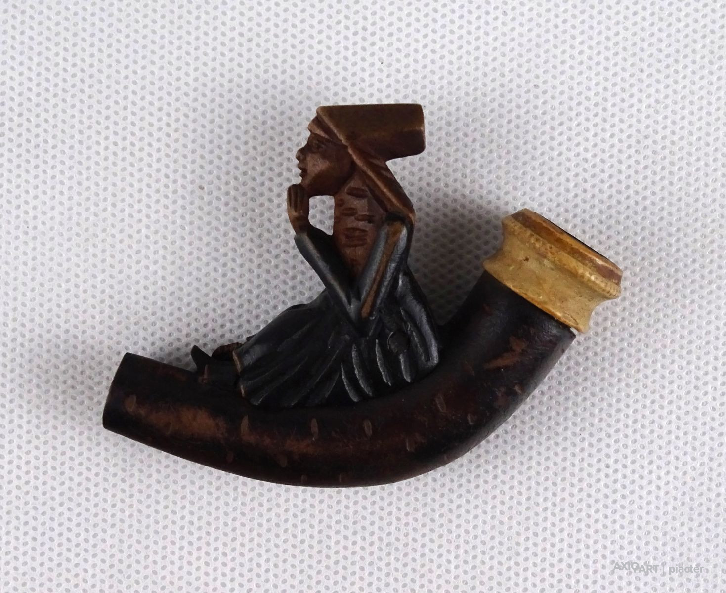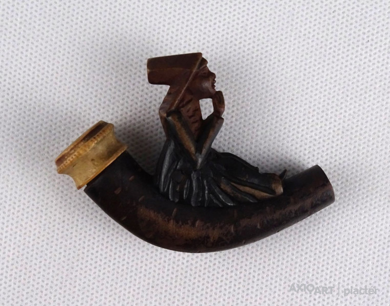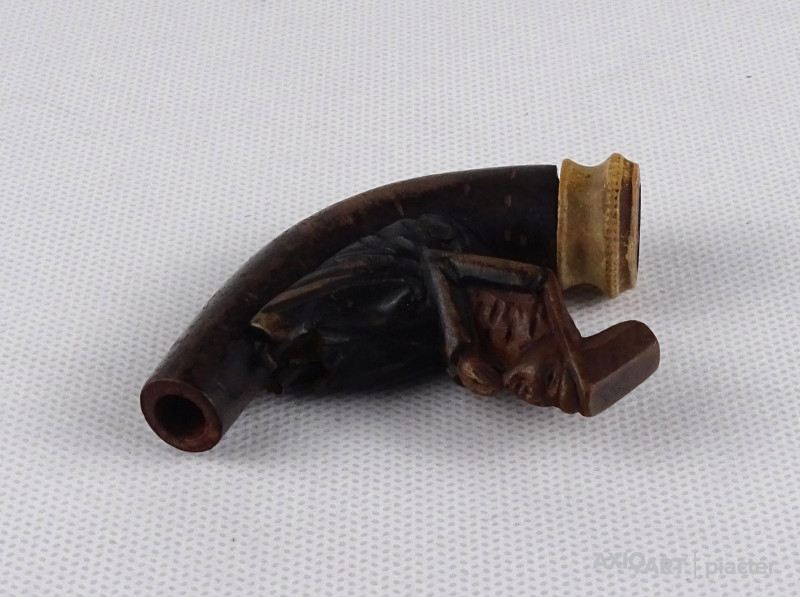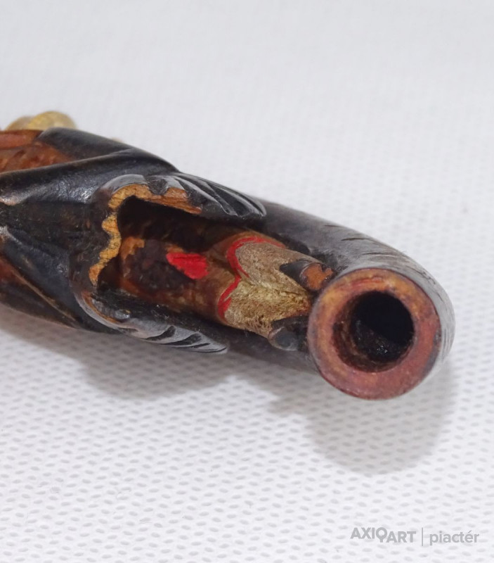 [1T056/FSZ] Régi meggyfa ágból, meggyfa vesszőből faragott pipa. Végén tajték gyűrű díszítés található. A pipafejen egy apáca ül. Az apáca hátra hajtható, szoknyája alá betekinthetünk. A szoknya vége és az egyik lábfeje sérült, lásd fotó. Ritka, gyűjteménybe illő darab. Magasság: 6 cm Szélesség: 2 cm Hosszúság: 7.7 cm Súly: 0.01 kg   A pipa mérete a kupaktól a faragás aljáig 13 cm, az aljától a szárig 11,5 cm, a szár hossza 50 cm