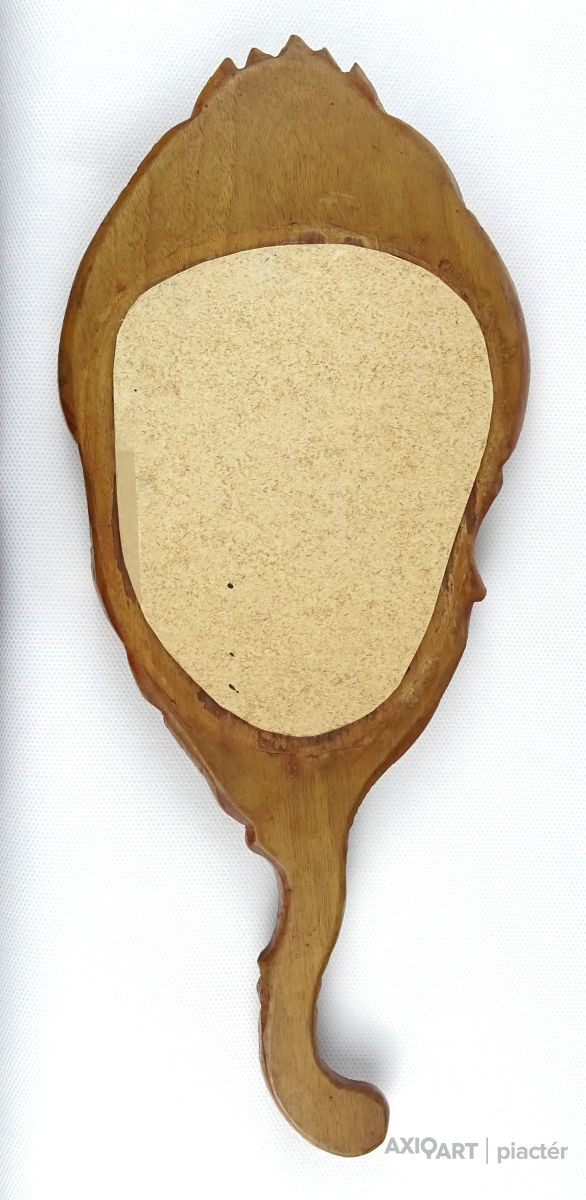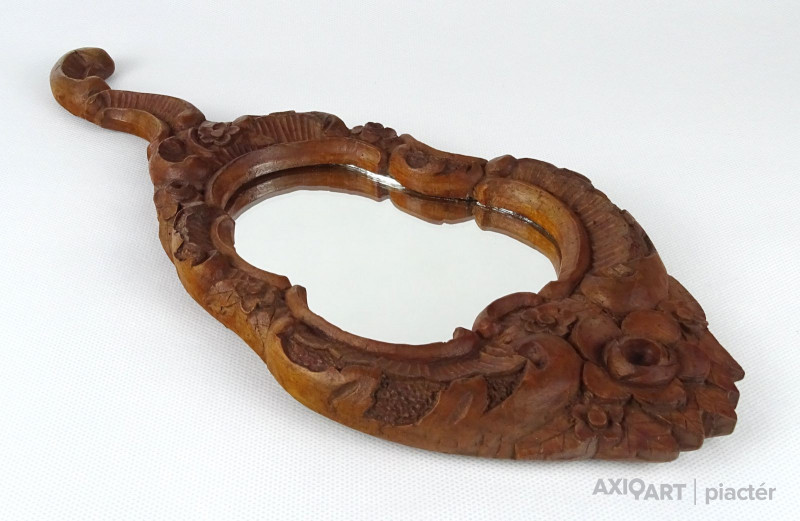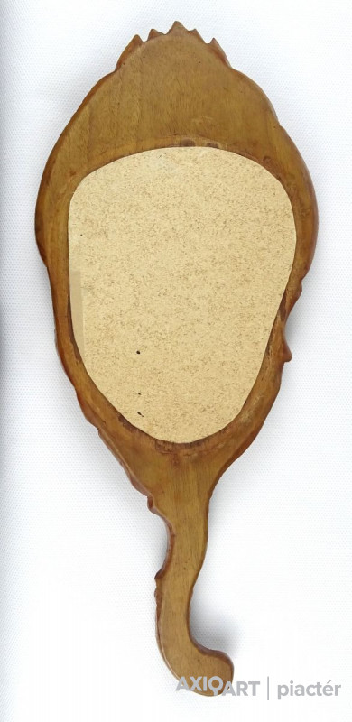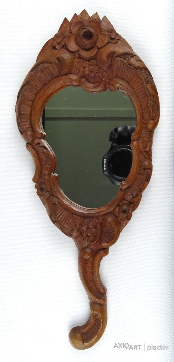 [1M616/X051] Régi, faragott kézitükör, pipere tükör, sminktükör. Benne szép állapotú, vakfolt mentes tükör. Szélesség: 14 cm Hosszúság: 33.5 cm Súly: 0.215 kg