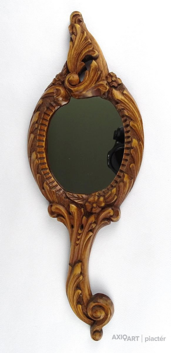 [1L737/UZ-N] Régi, faragott, áttört kézitükör, pipere tükör, sminktükör. Benne szép állapotú, vakfolt mentes tükör. Szélesség: 13.5 cm Hosszúság: 37.5 cm Súly: 0.215 kg