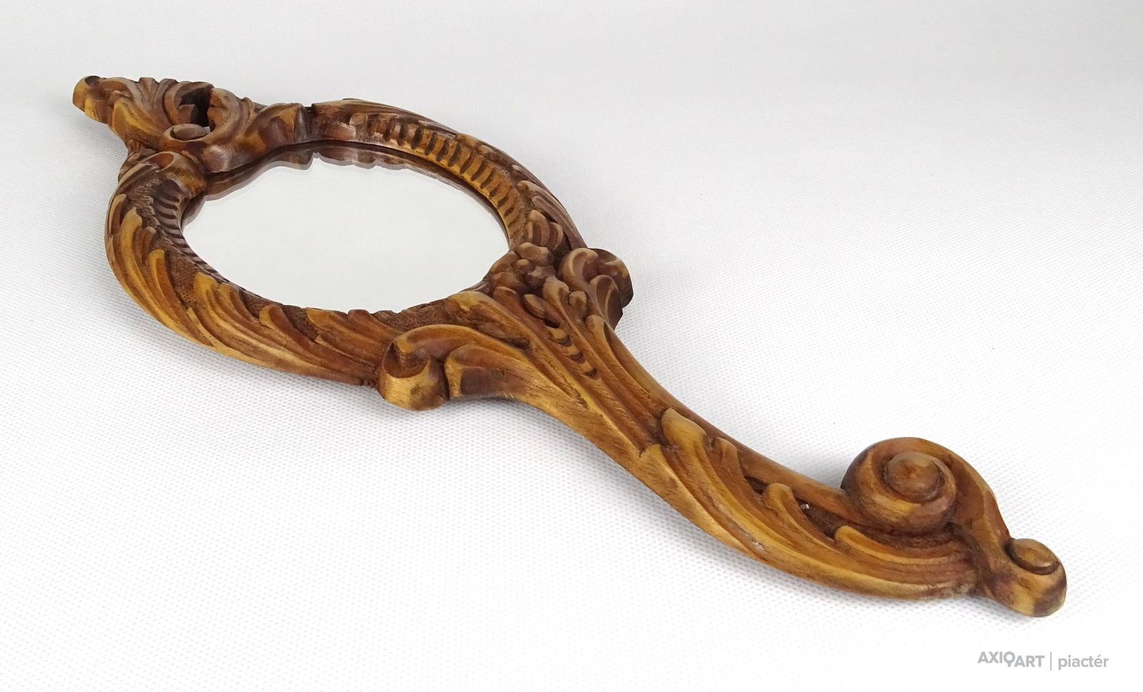 Régi, faragott, áttört kézitükör, pipere tükör, sminktükör. Benne szép állapotú, vakfolt mentes tükör.
