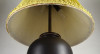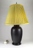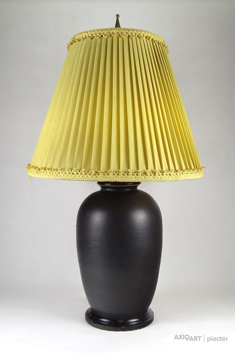 [1K881/UZ-K] Régi, szép, működő állapotban lévő kétégős asztali lámpa. Kis méretű (E14) izzó való bele. A test matt fekete kerámia, alatta fa talp. Rajta sárga bura szintén szép állapotban. Tetején gyönyörű csúcsdísz található. Magasság: 70 cm Szélesség: 40 cm Súly: 3.005 kg