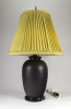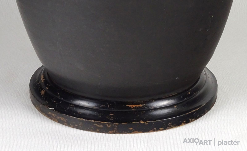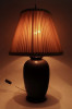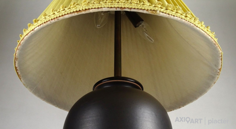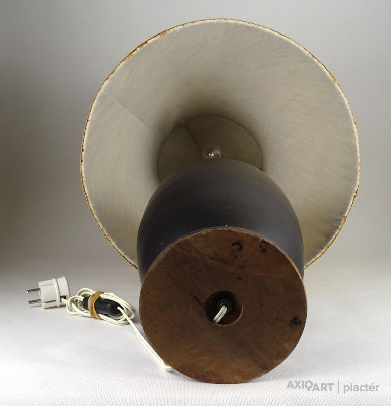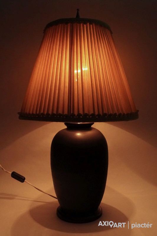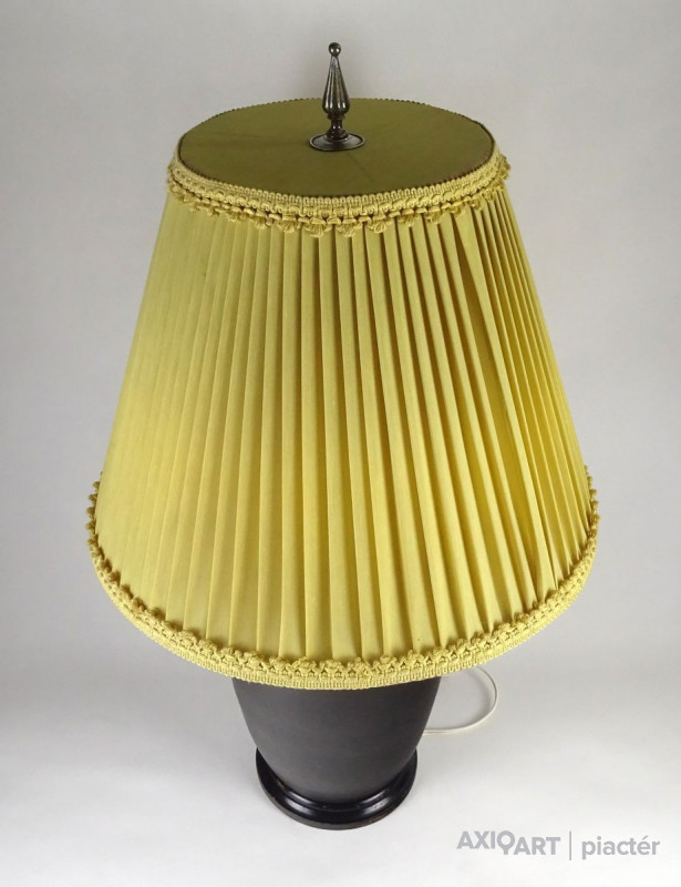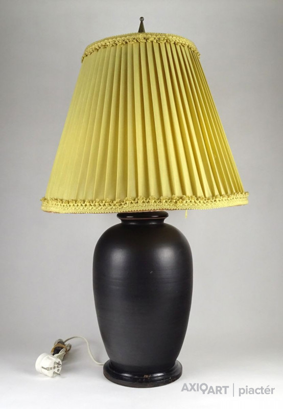Régi, szép, működő állapotban lévő kétégős asztali lámpa. Kis méretű (E14) izzó való bele. A test matt fekete kerámia, alatta fa talp. Rajta sárga bura szintén szép állapotban. Tetején gyönyörű csúcsdísz található.