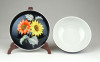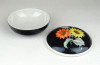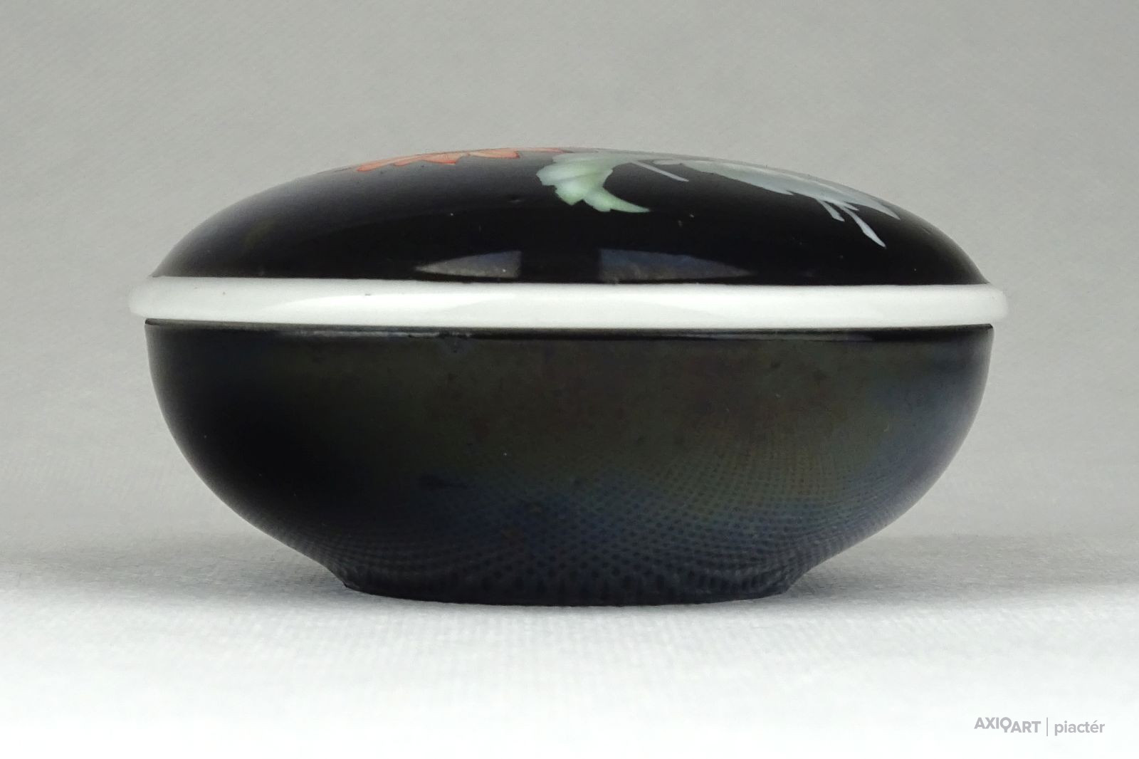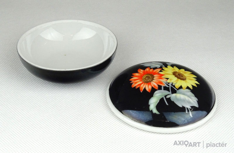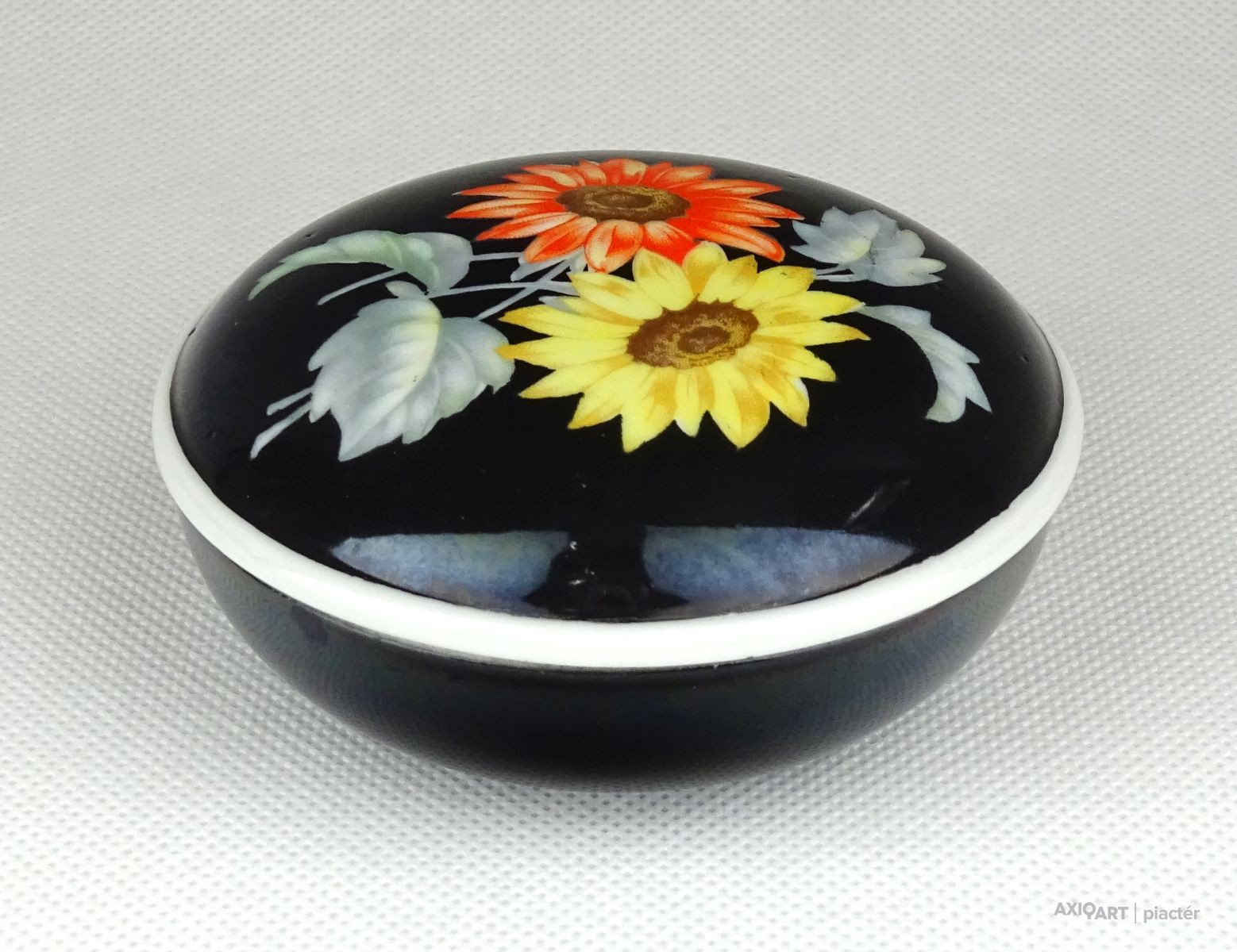 Régi, hibátlan állapotú, jelzett, fekete alapon virágmintás, fedeles porcelán bonbonier, gyűrűtartó, ékszertartó.