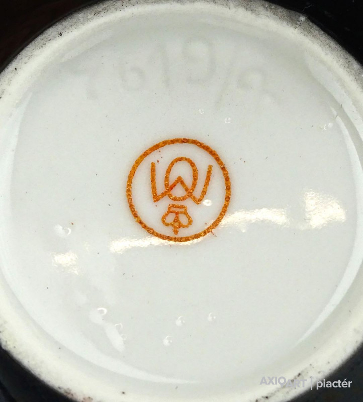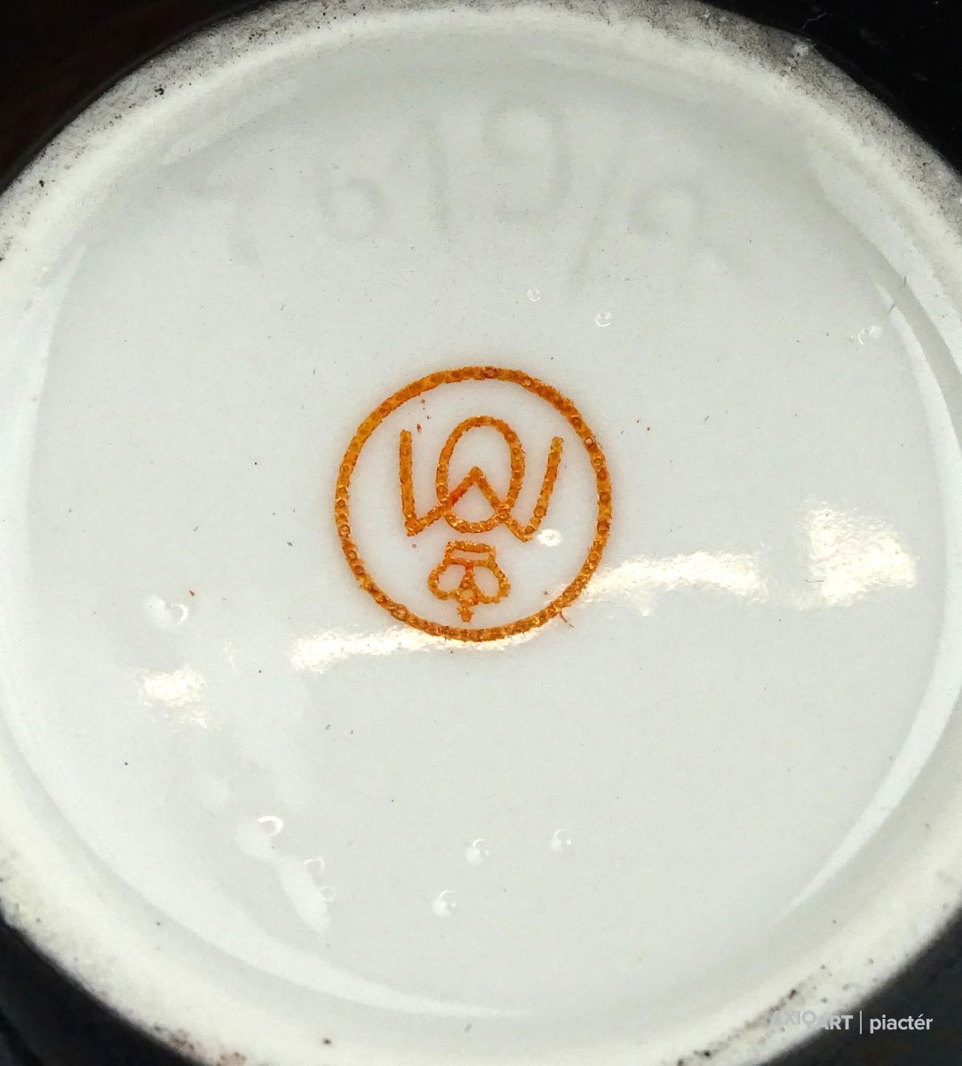 [1C583/X108] Régi, hibátlan állapotú, jelzett, fekete alapon virágmintás, fedeles porcelán bonbonier, gyűrűtartó, ékszertartó. Alján piros koronás márkajelzés: MO (Metzler & Ortloff) Formaszám mélynyomással: 7619/9 Magasság: 4 cm Szélesség: 8.2 cm Súly: 0.13 kg