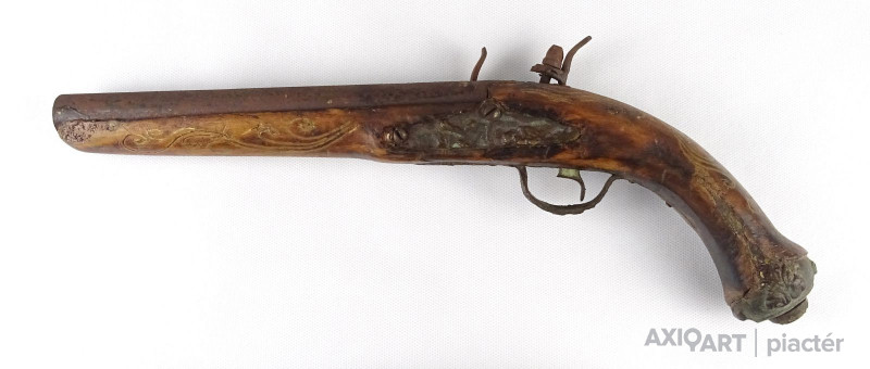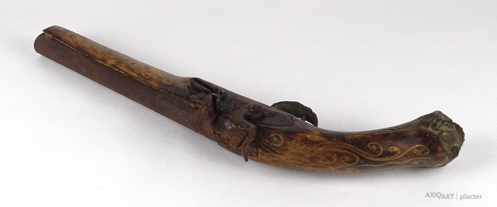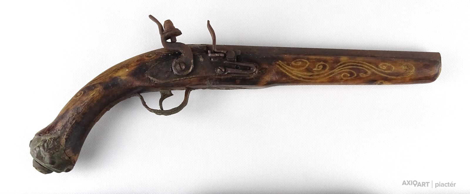 Fa párbajpisztoly replika. Nem használható, dísz pisztoly. Fém veretes elsütőszerkezettel rendelkezik. A fa részek réz fonalintarziával díszített.