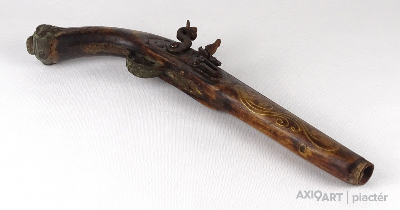 [1P664/X311] Fa párbajpisztoly replika. Nem használható, dísz pisztoly. Fém veretes elsütőszerkezettel rendelkezik. A fa részek réz fonalintarziával díszített. Hosszúság: 39.5 cm Súly: 0.66 kg