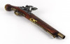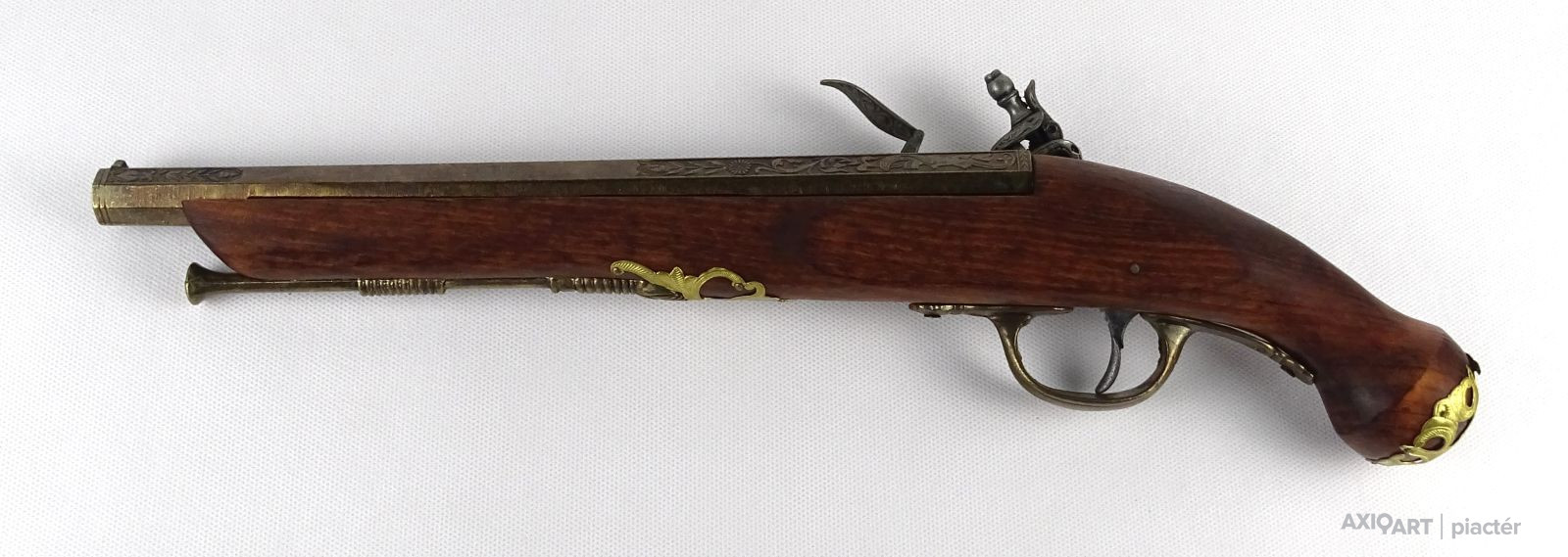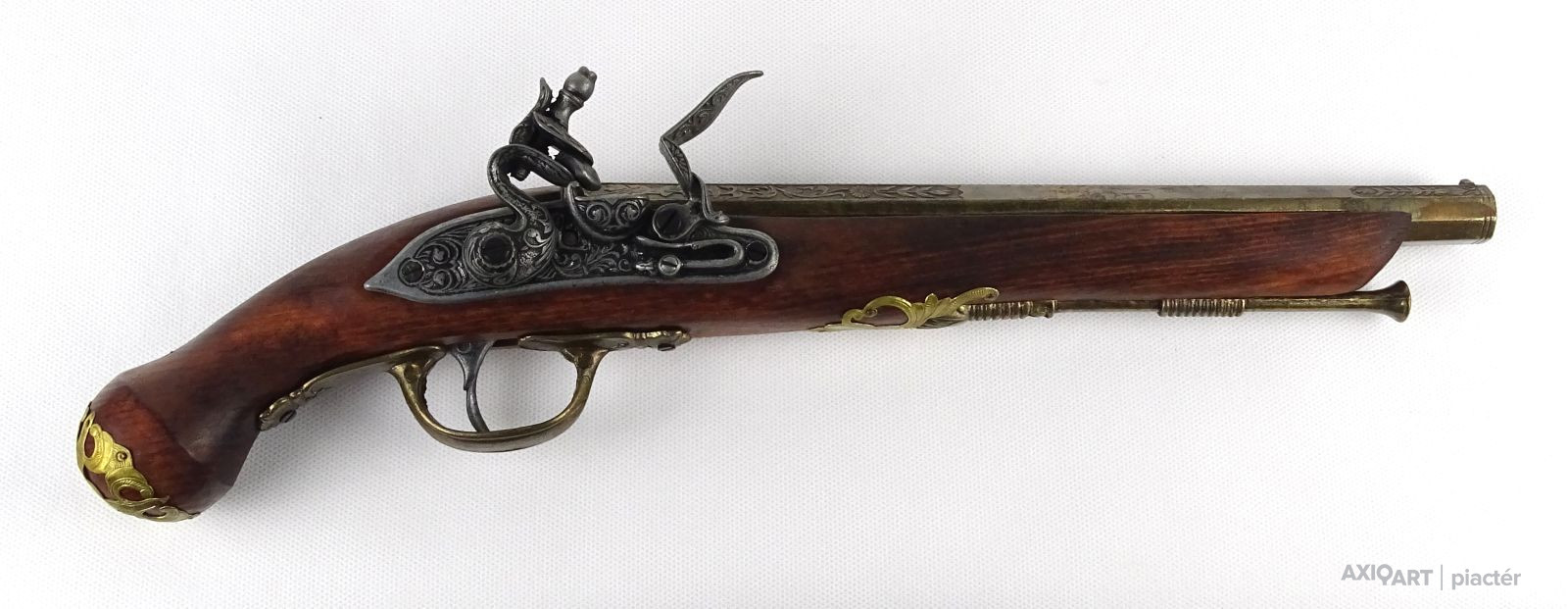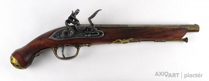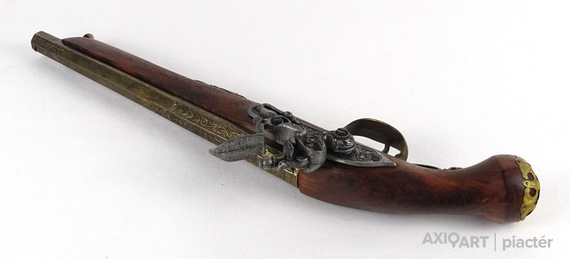 Fa párbajpisztoly replika. Nem használható, dísz pisztoly. Fém veretes kovaköves elsütőszerkezettel rendelkezik.