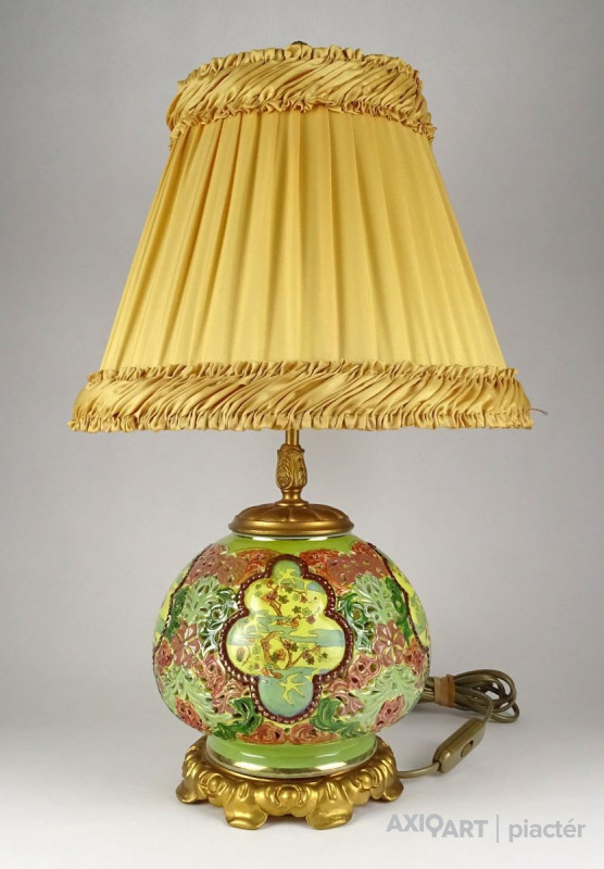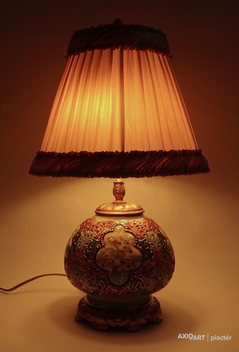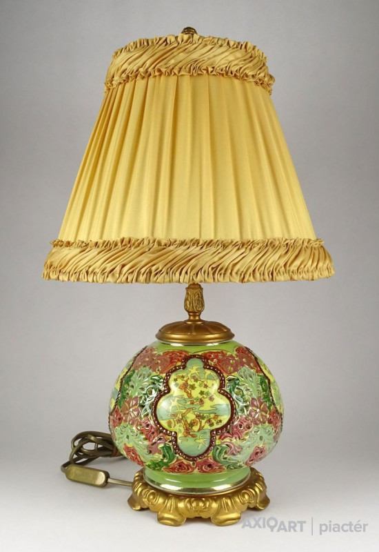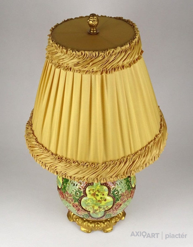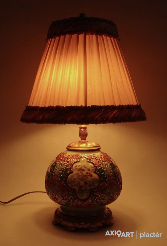 Hibátlan állapotú, áttört Fischer majolika lámpa. Faragott aranyozott fa talpon áll. Rajta szép állapotú bura. Működőképes, újravezetékelt, azonnal használható állapotban van. Kettő darab nagy méretű (E27) izzó való bele.