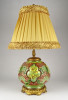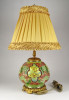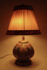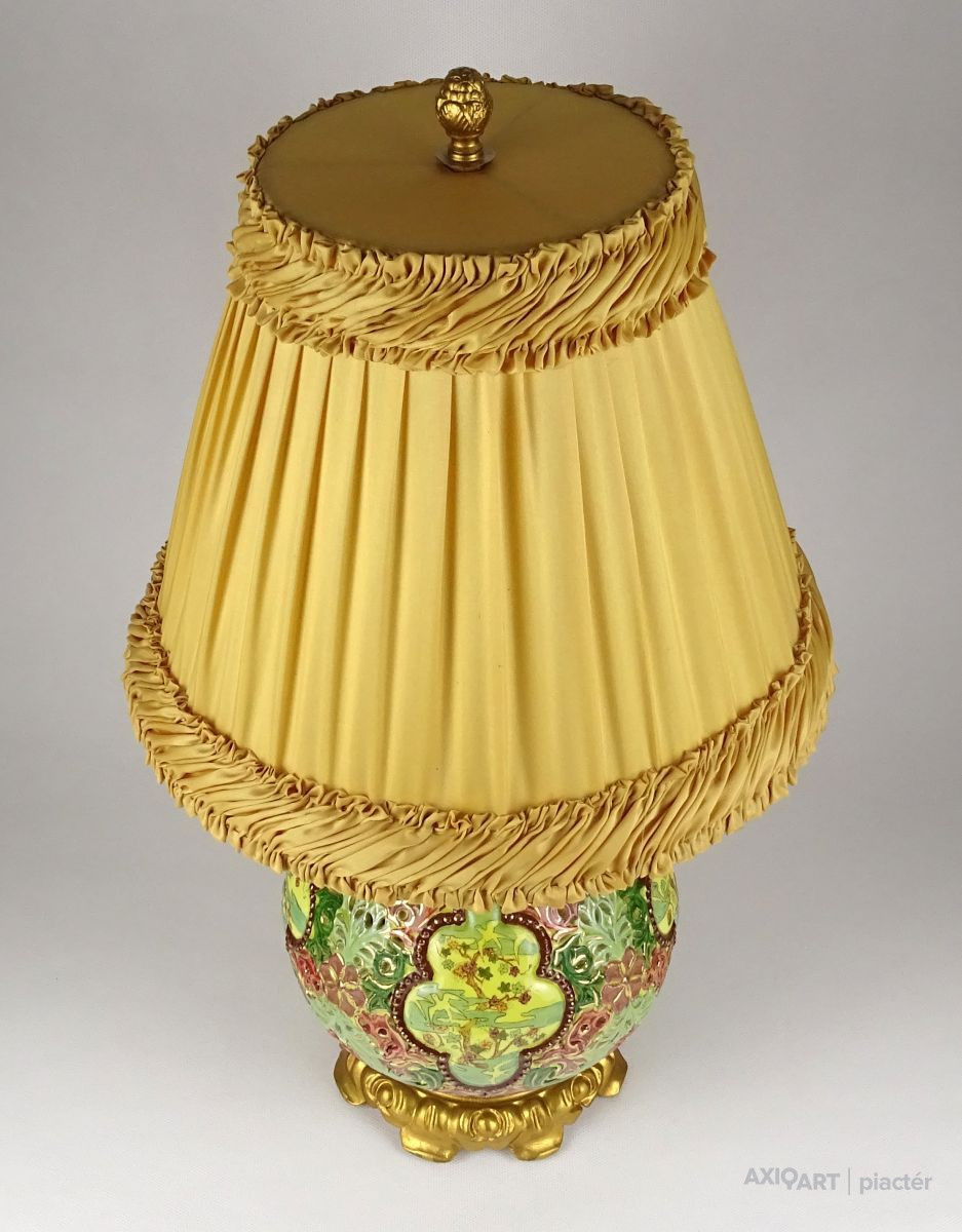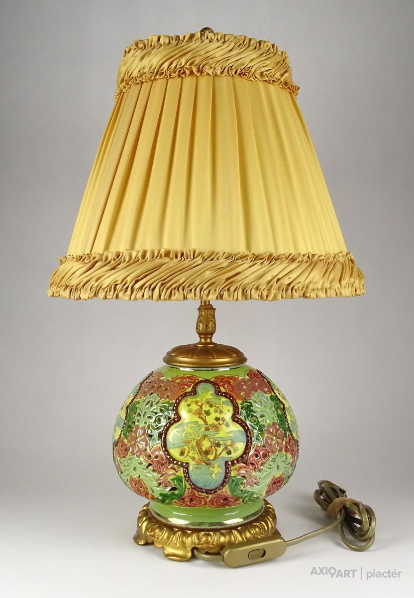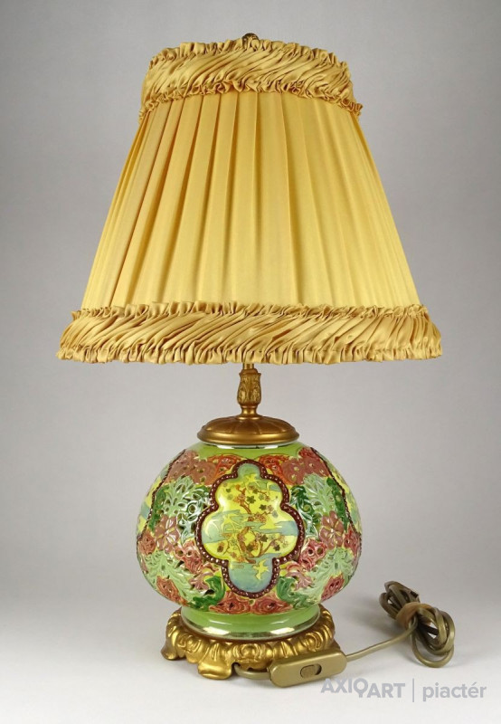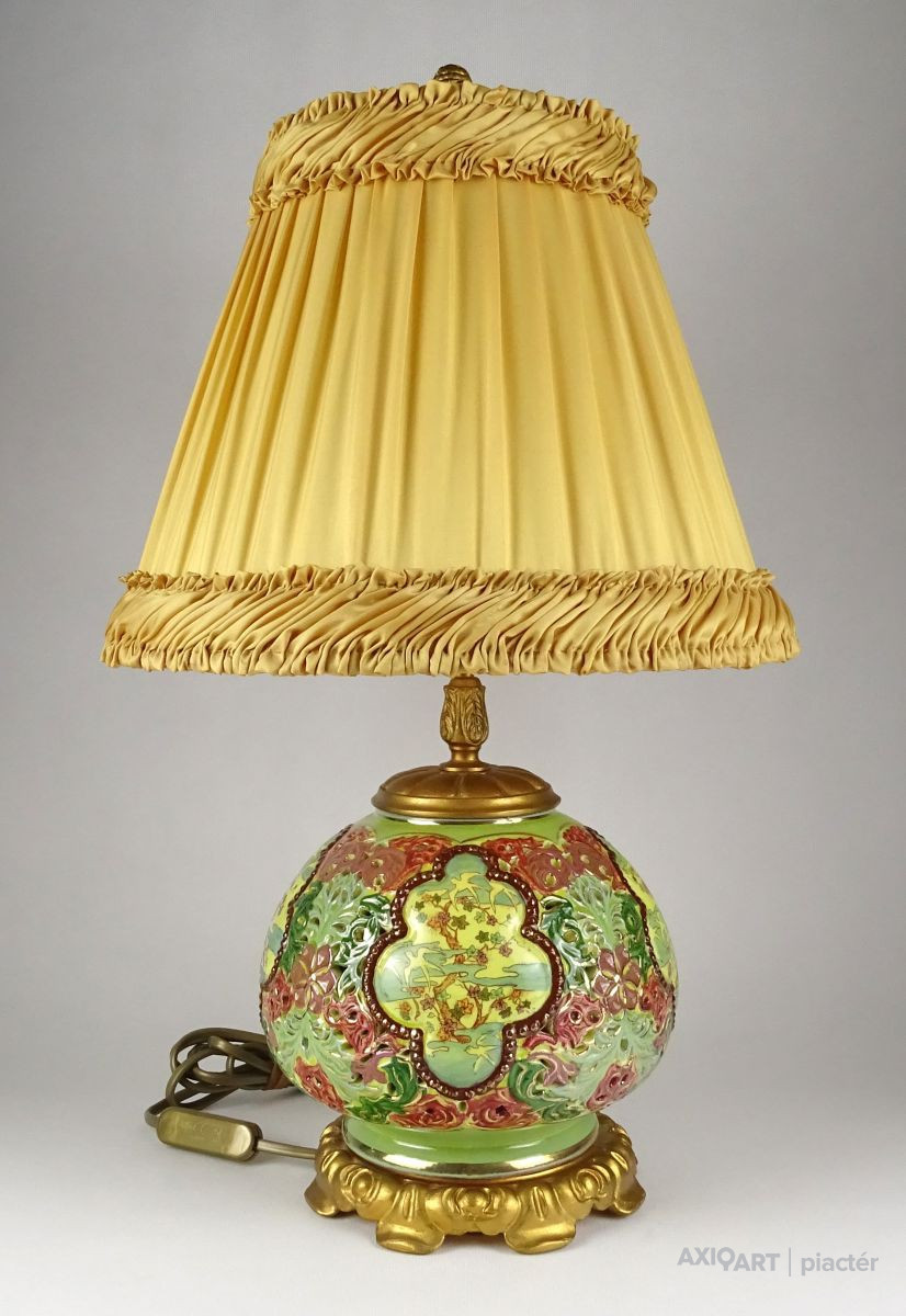 Hibátlan állapotú, áttört Fischer majolika lámpa. Faragott aranyozott fa talpon áll. Rajta szép állapotú bura. Működőképes, újravezetékelt, azonnal használható állapotban van. Kettő darab nagy méretű (E27) izzó való bele.
