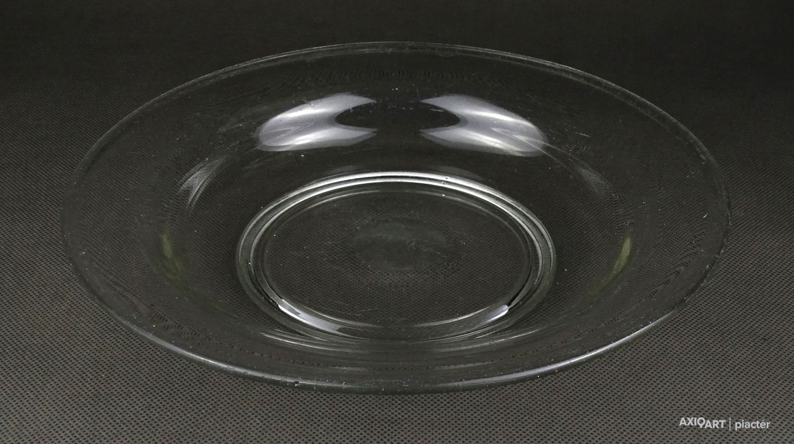 Régi hibátlan állapotú üveg tányér, mélytányér, leveses tányér. Alján a fújás, szakítás kicsiszolt nyoma látható.