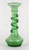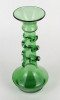 [1O202/UZ-N] Hibátlan állapotú, zöld színű üveg váza, fújt üveg szálváza, díszváza. A váza nyakán csavart plasztikus díszítés fut végig. A váza talpán a fúvás, szakítás nyoma szépen kivehető. Magasság: 18 cm Szélesség: 8 cm Súly: 0.18 kg