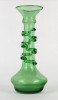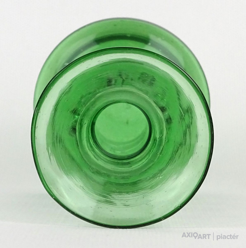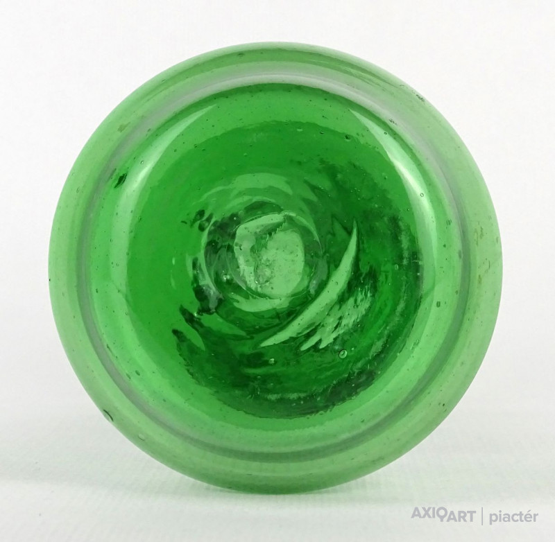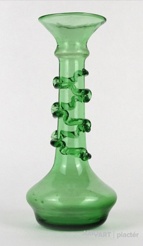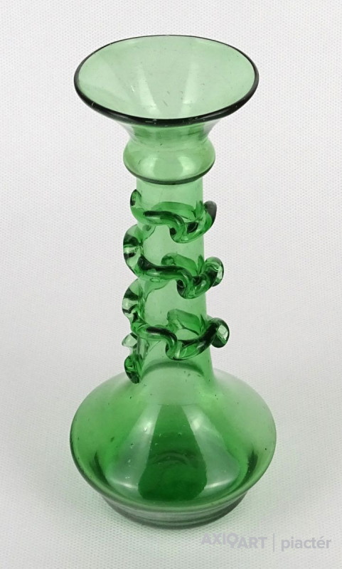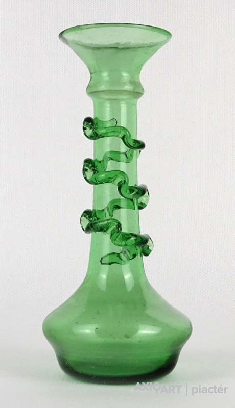 Hibátlan állapotú, zöld színű üveg váza, fújt üveg szálváza, díszváza. A váza nyakán csavart plasztikus díszítés fut végig. A váza talpán a fúvás, szakítás nyoma szépen kivehető.