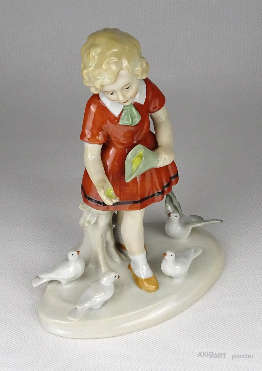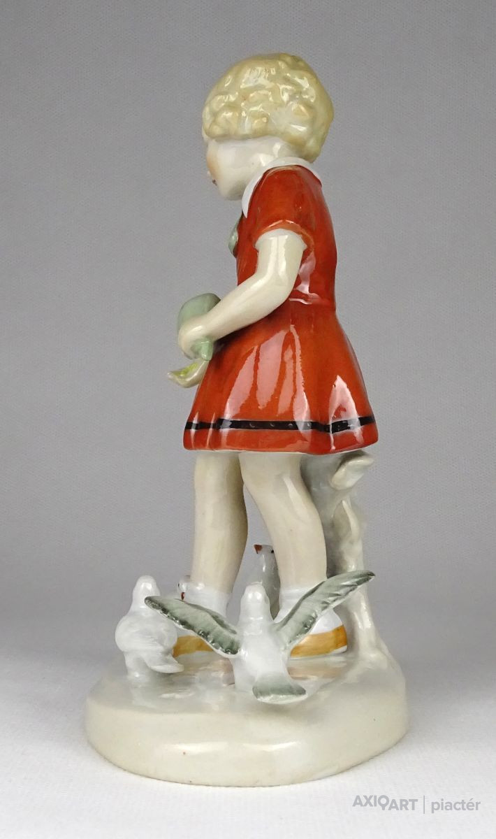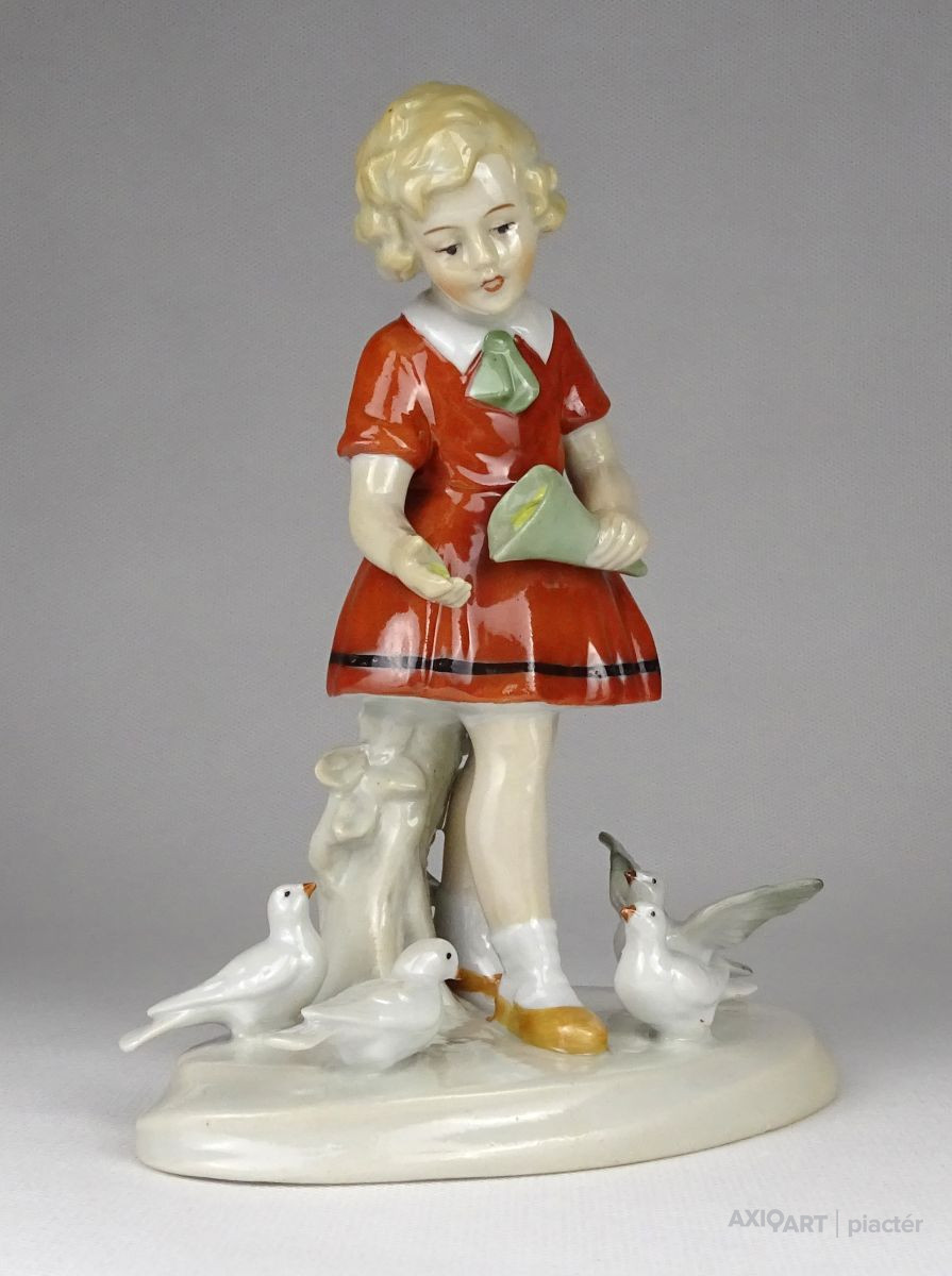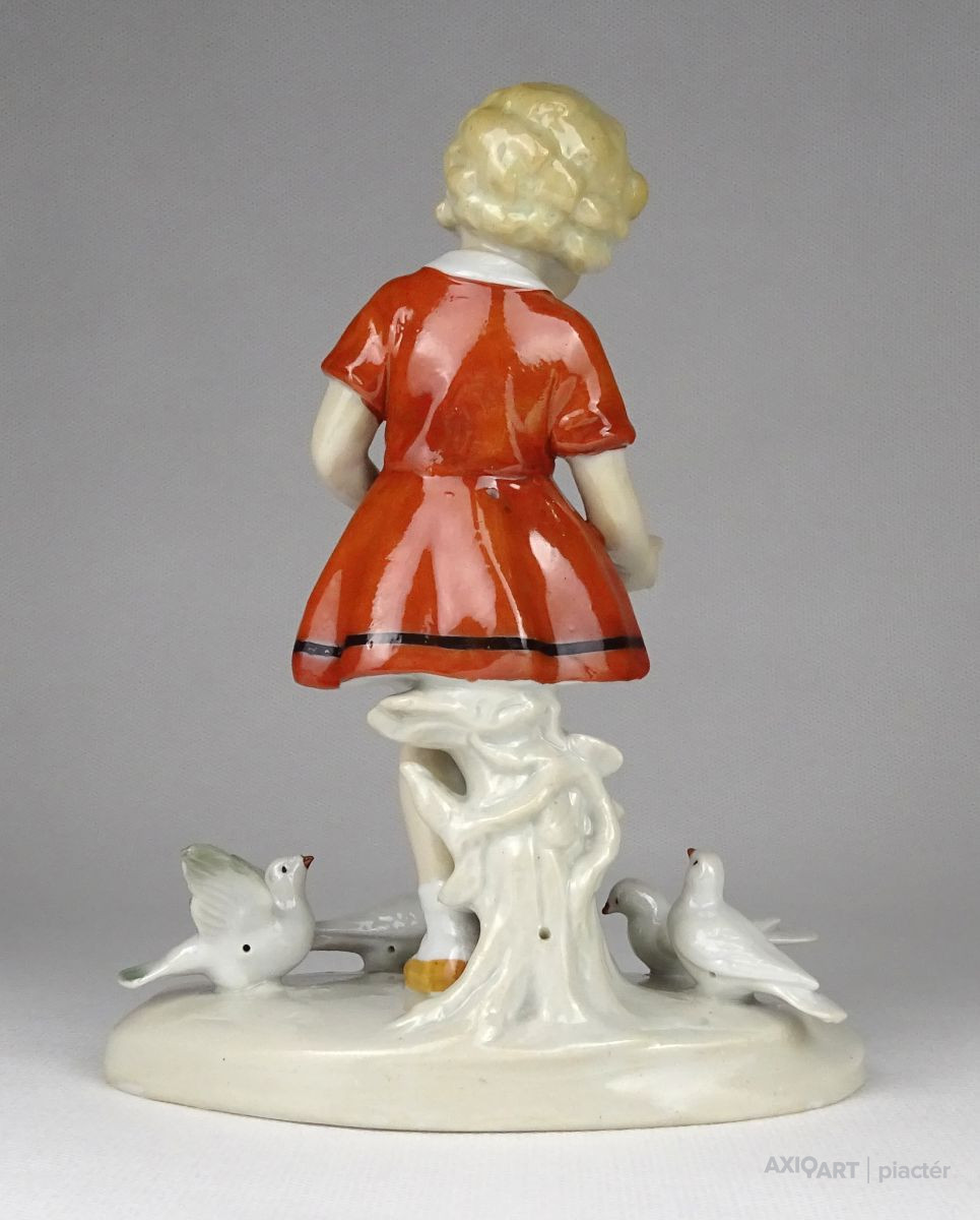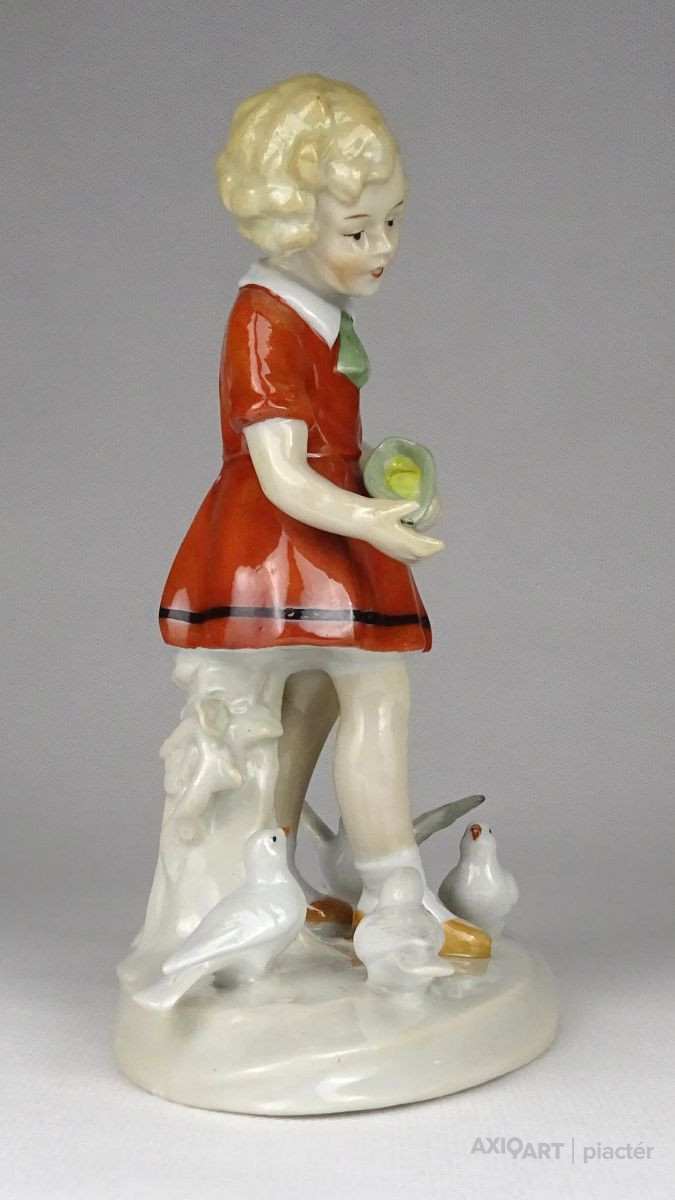 Hibátlan állapotú, jelzett német porcelán figura. Galambokat etető kislány szobor talapzaton.