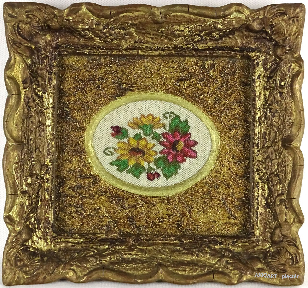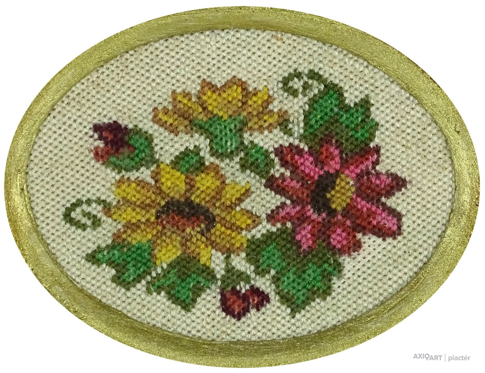 Régi aranyozott keretben található kis méretű ovális alakú virágos kézimunka. Akasztási lehetőséggel rendelkezik.