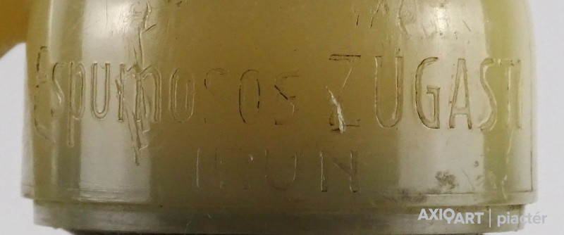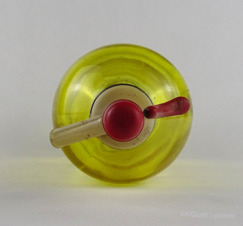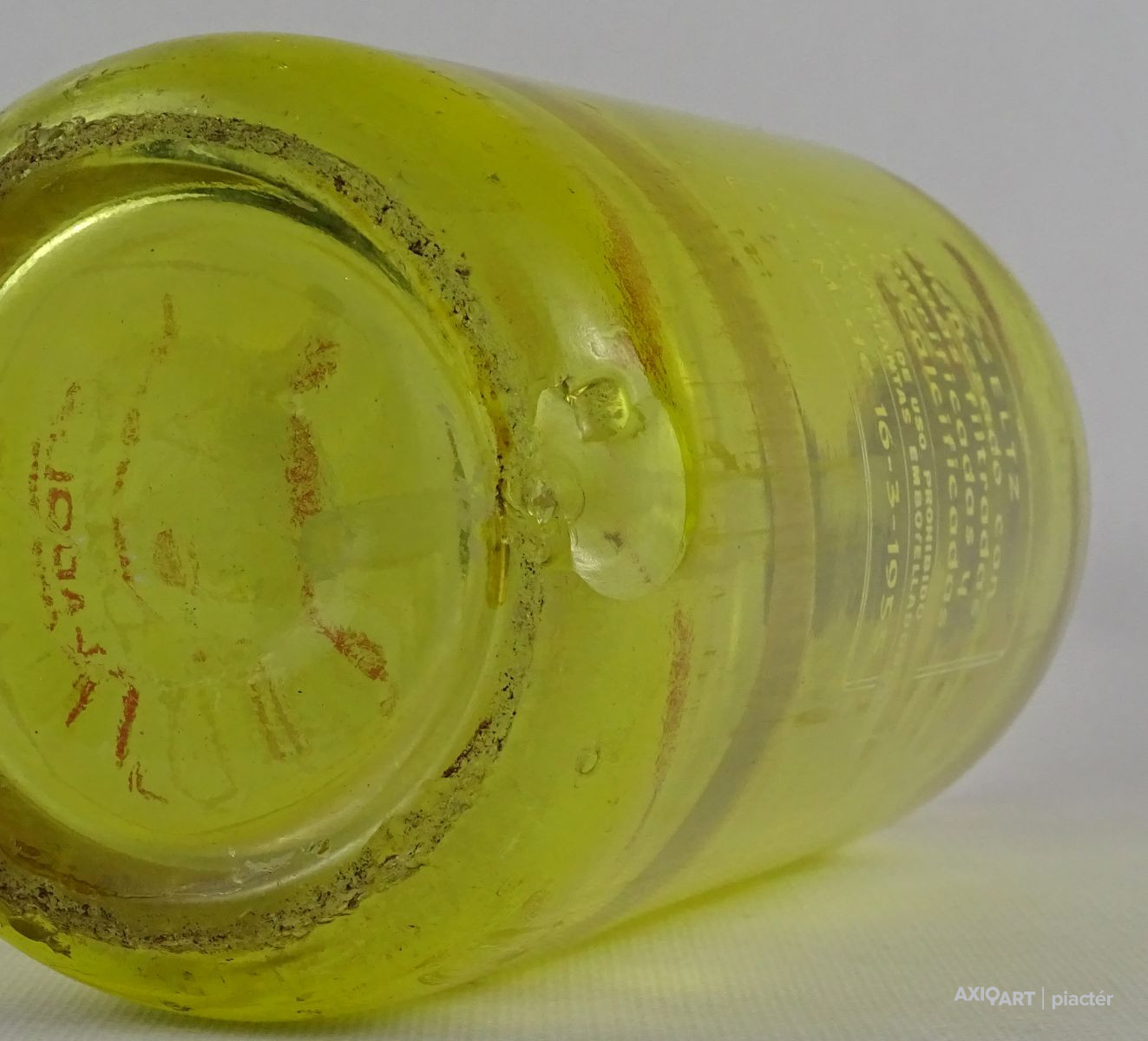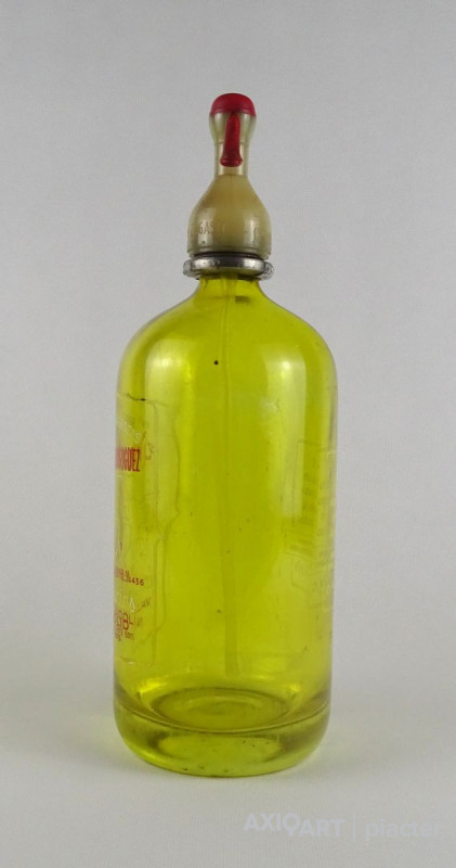 Régi szép állapotú citromsárga színű szódásüveg, szódáspalack. Műanyag fejjel rendelkezik. Talpán egy sérülés található, lásd fotó.