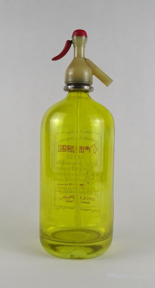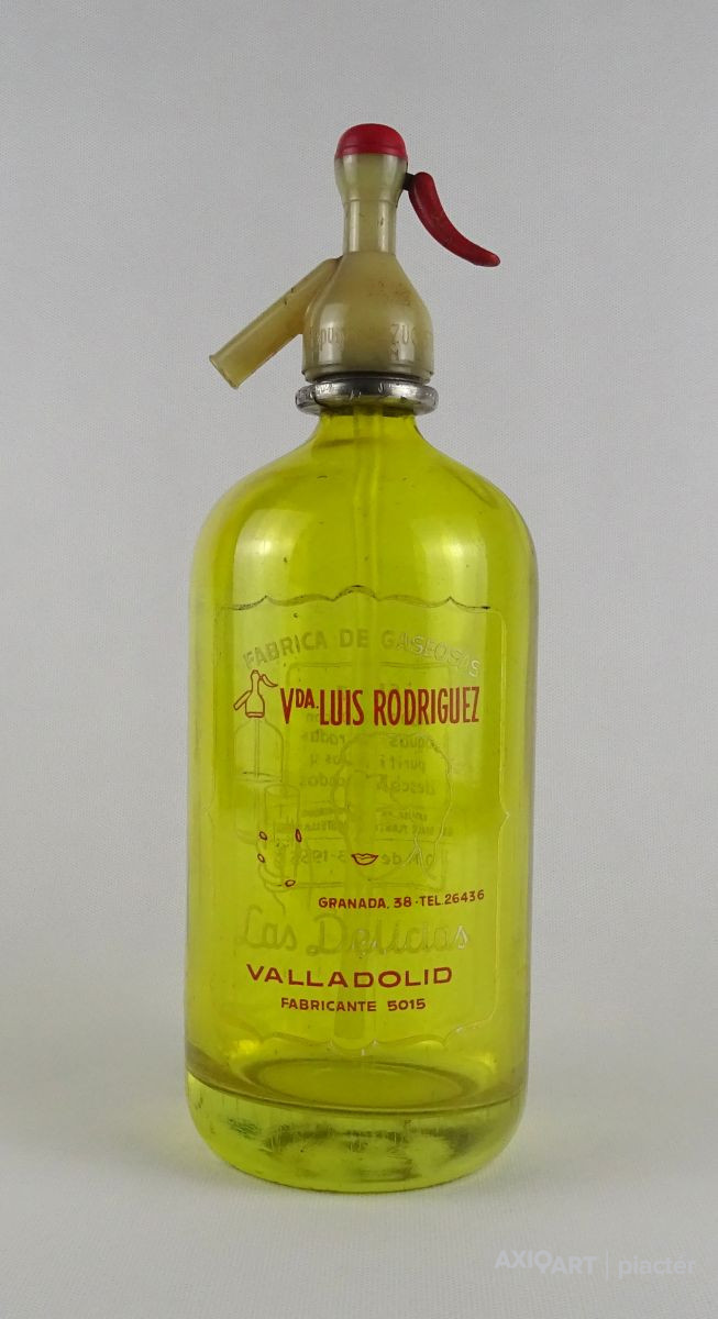 [1A118/Z034] Régi szép állapotú citromsárga színű szódásüveg, szódáspalack. Műanyag fejjel rendelkezik. Talpán egy sérülés található, lásd fotó. A fejen jelzés, felirat: ESPUMOSOS ZUGASTI IRUN PATENTACO AECMESA R.S. 12-409 FABRICANTE No 2862 Oldalán felirat: FABRICA DE GASEOSAS VDA. LOUIS RODRIGUEZ GRANADA LAS DELICIAS VALLADOLID FABRICANTE 5015 SELTZ Magasság: 31 cm Szélesség: 10.3 cm Súly: 1.555 kg