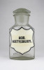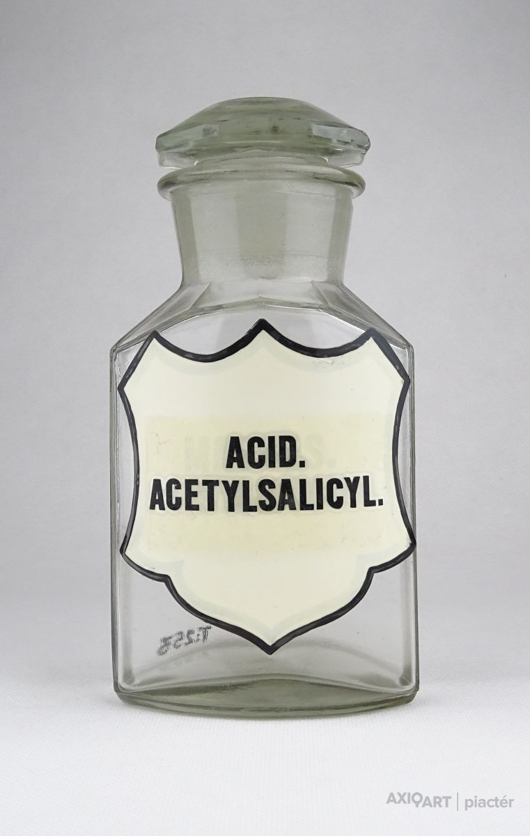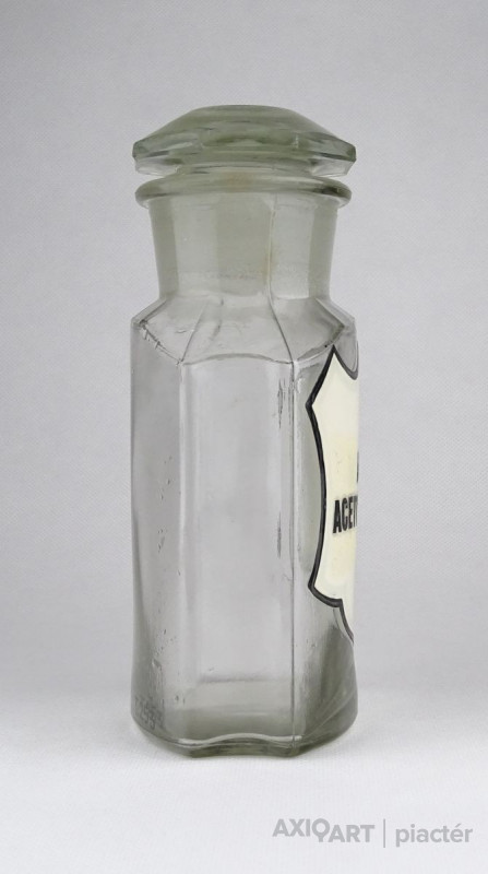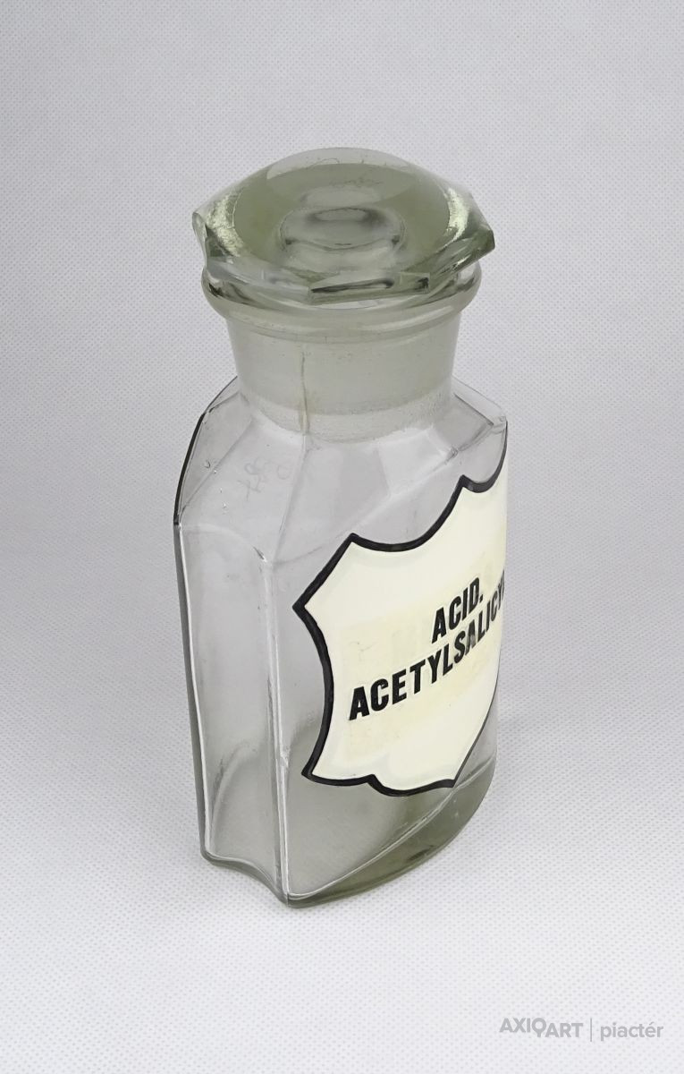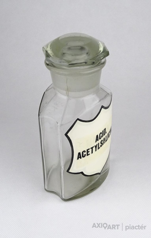 [0Y780/Z047] Régi, szép állapotú, áttetsző gyógyszertári üveg, patikaüveg. Dugóján kisebb sérülés található. Oldalán felirat: ACID. ACETYLSALICYL. Magasság: 16 cm Szélesség: 8 cm Súly: 0.385 kg   Magassága 19 cm, átmérője 7 cm. Súlya 437 g.