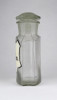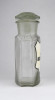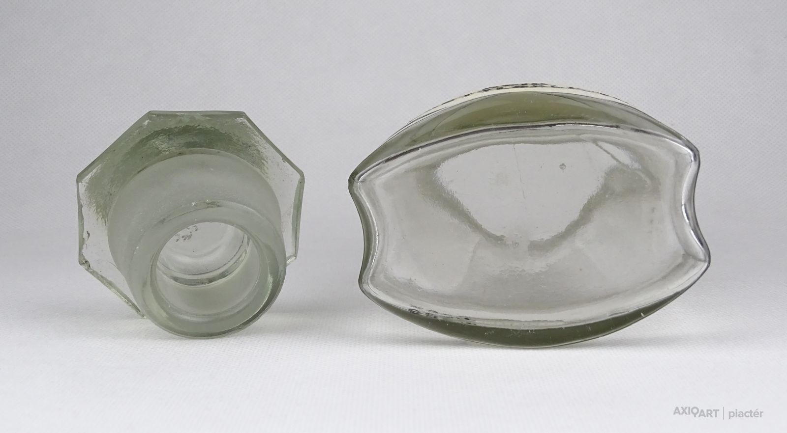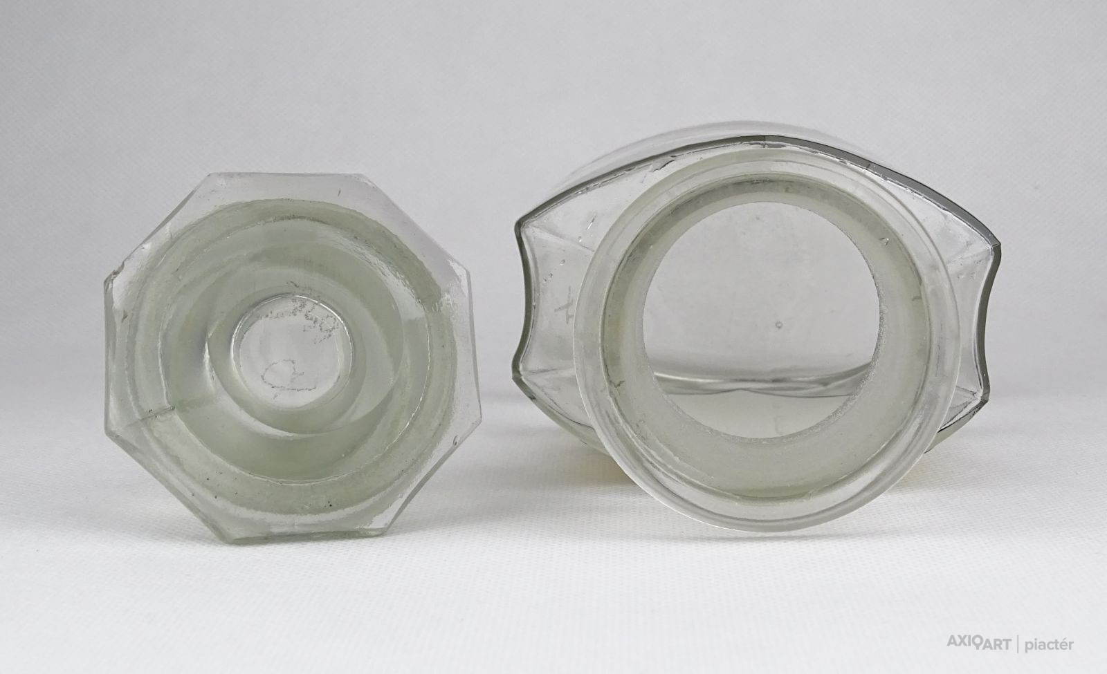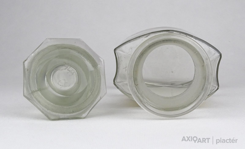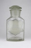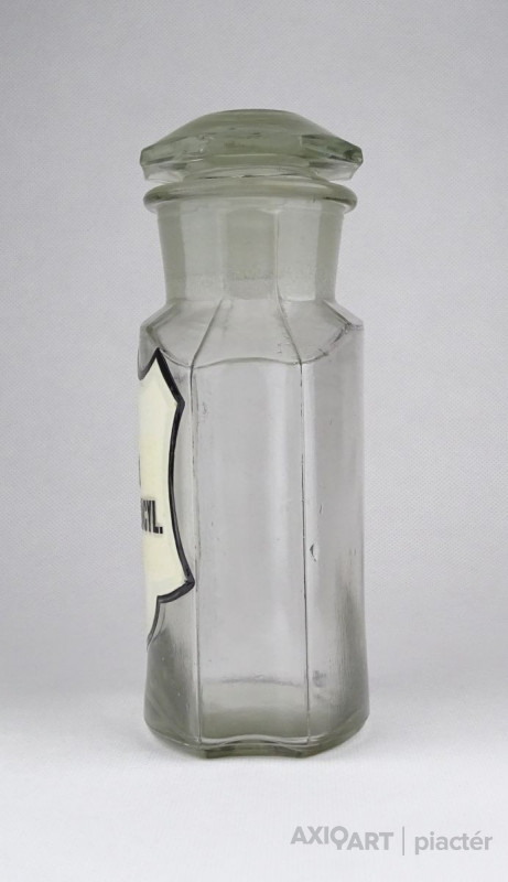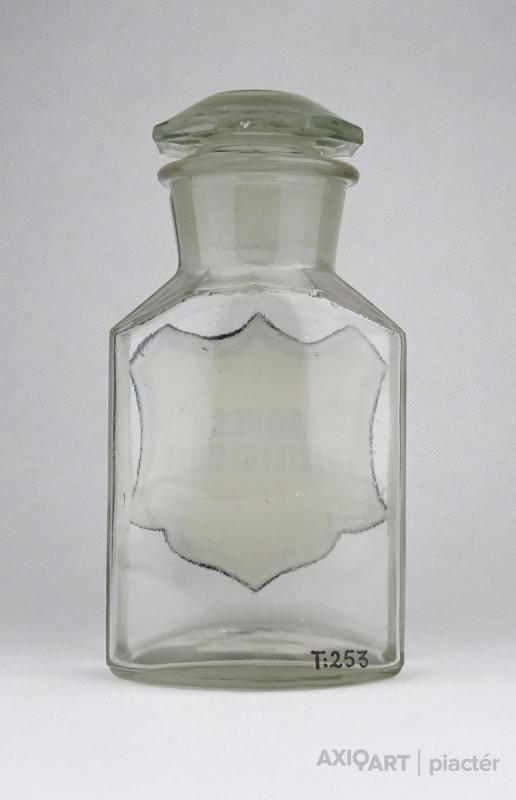 Régi, szép állapotú, áttetsző gyógyszertári üveg, patikaüveg. Dugóján kisebb sérülés található.