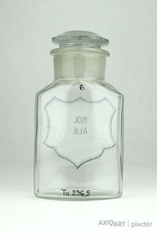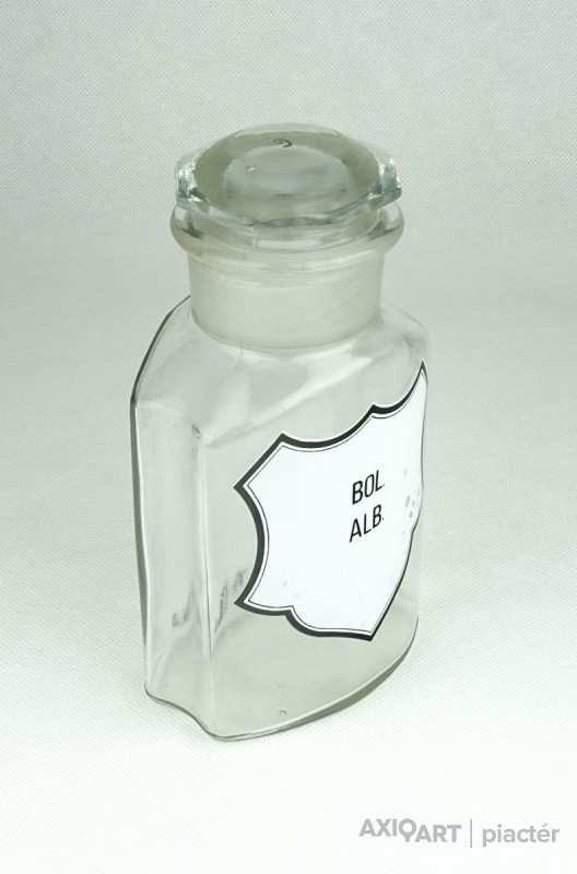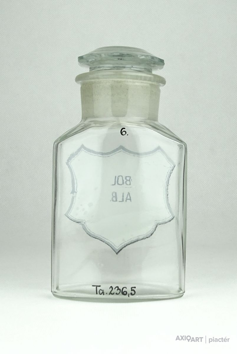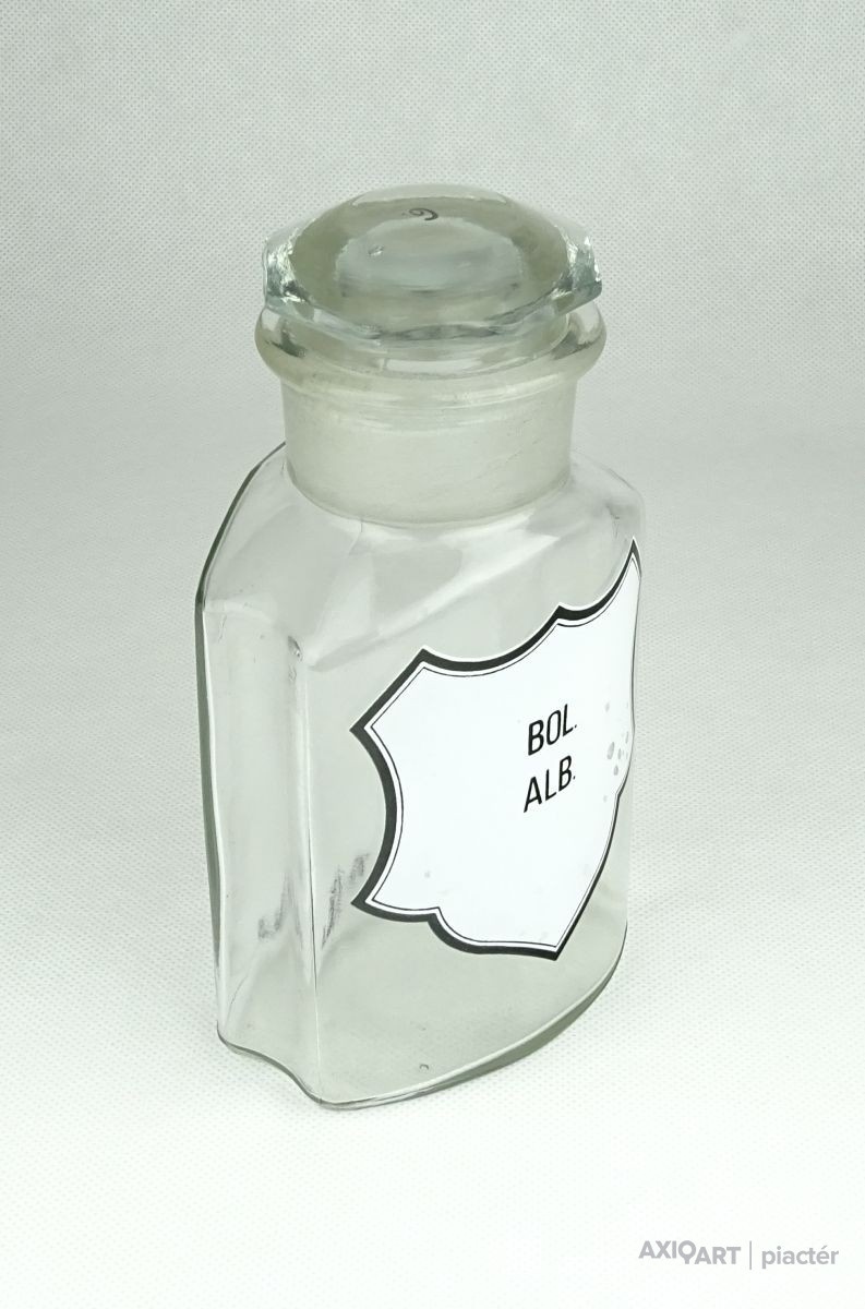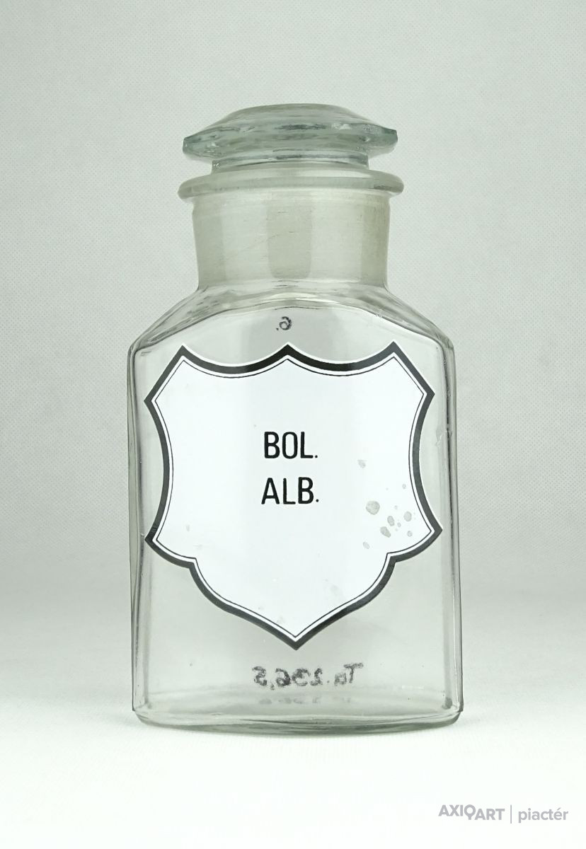 [0Y769/Z047] Régi, szép állapotú, áttetsző gyógyszertári üveg, patikaüveg. Oldalán felirat: BOL. ALB. Magasság: 15 cm Szélesség: 8 cm Súly: 0.35 kg   Magassága 19 cm, átmérője 7 cm. Súlya 437 g.