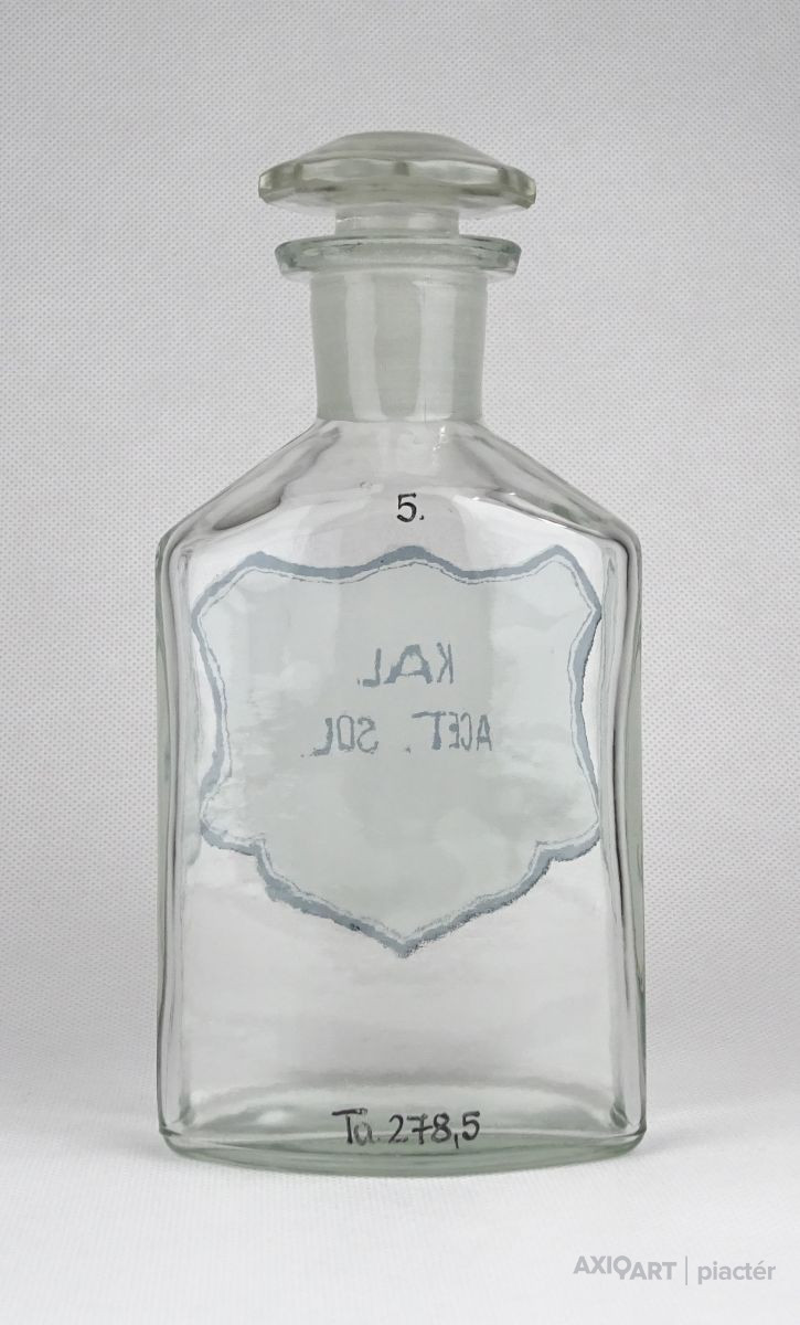 [0Y765/Z052] Régi, szép állapotú, áttetsző gyógyszertári üveg, patikaüveg. Oldalán felirat: KAL. ACET. SOL. Magasság: 16.5 cm Szélesség: 7.5 cm Súly: 0.345 kg   Magassága 19 cm, átmérője 7 cm. Súlya 437 g.