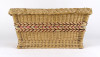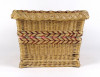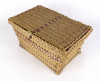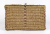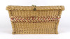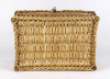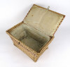 [1R546/X319] Régi, kis méretű fonott kosár. Míves, díszes fonási technikával készült, részletgazdag darab. Pici réz zár füllel rendelkezik. Belseje csipke szélű, varrott selyemmel bélelt. 1920-30-as évekbeli darab. Magasság: 15.5 cm Szélesség: 19.5 cm Hosszúság: 31 cm Súly: 0.485 kg
