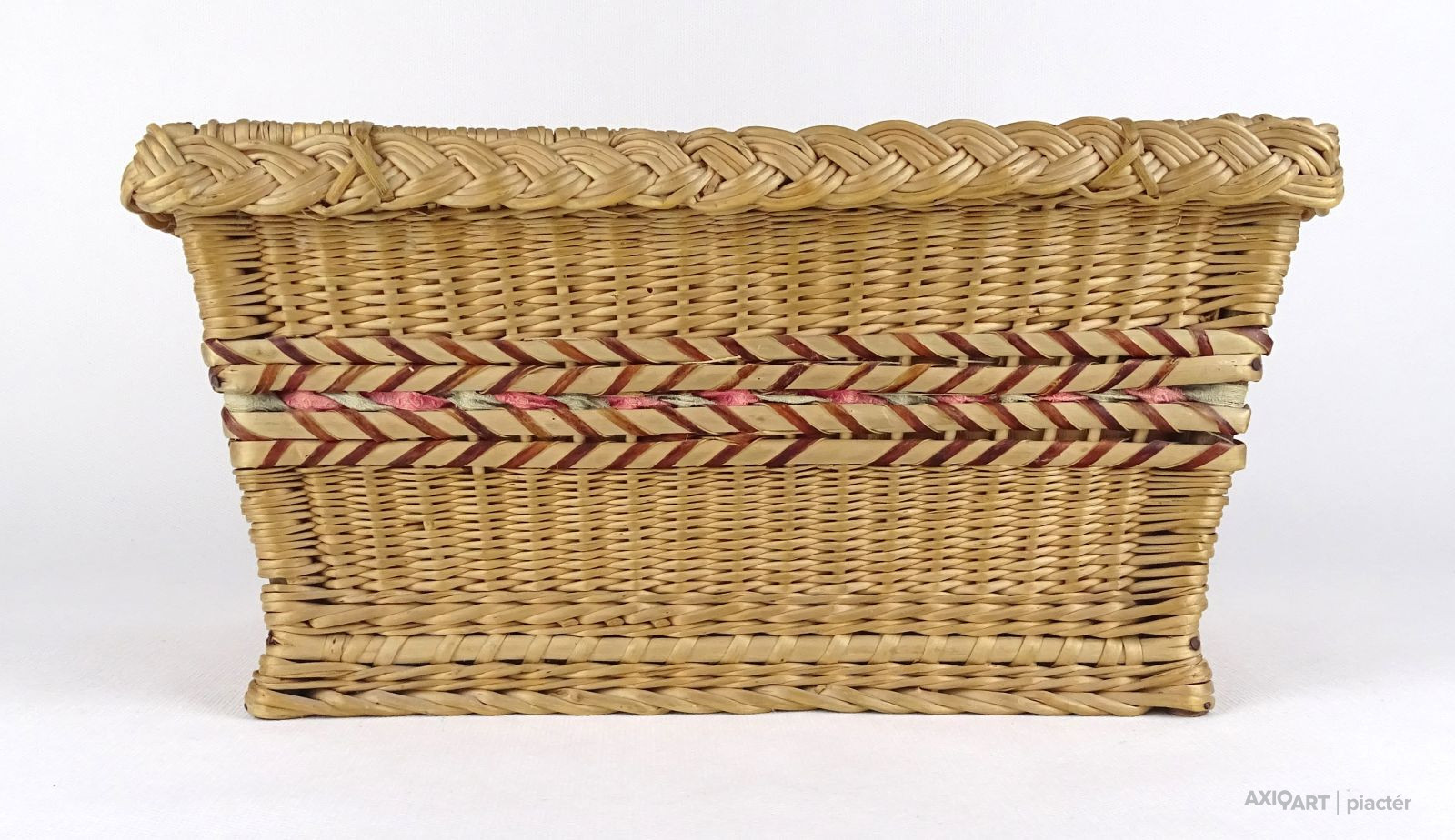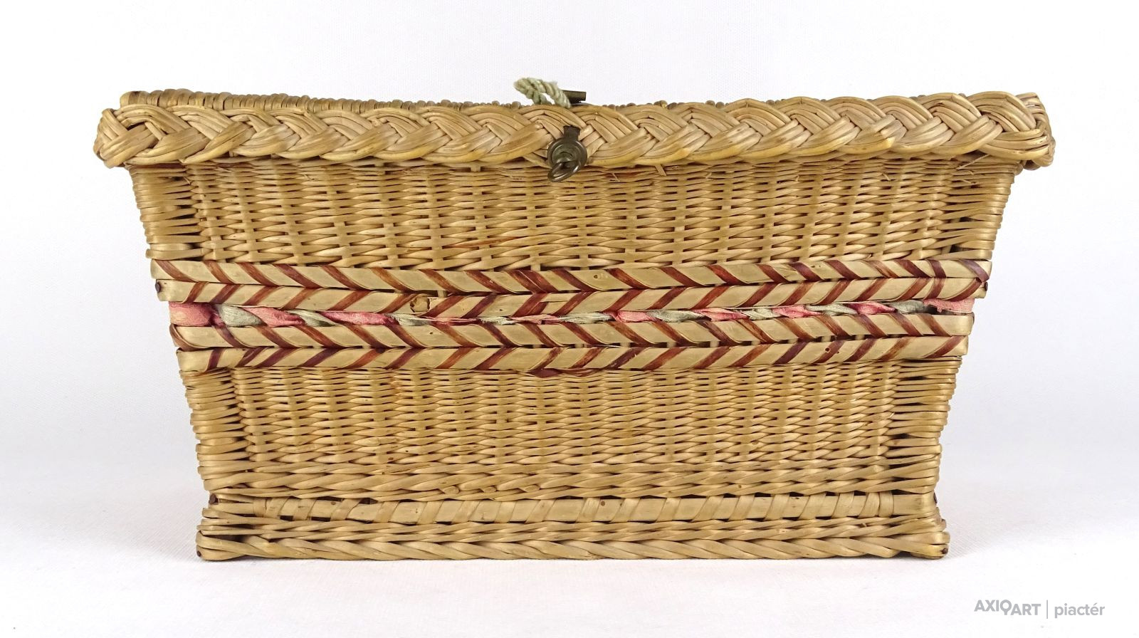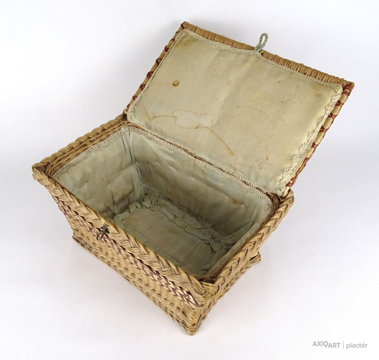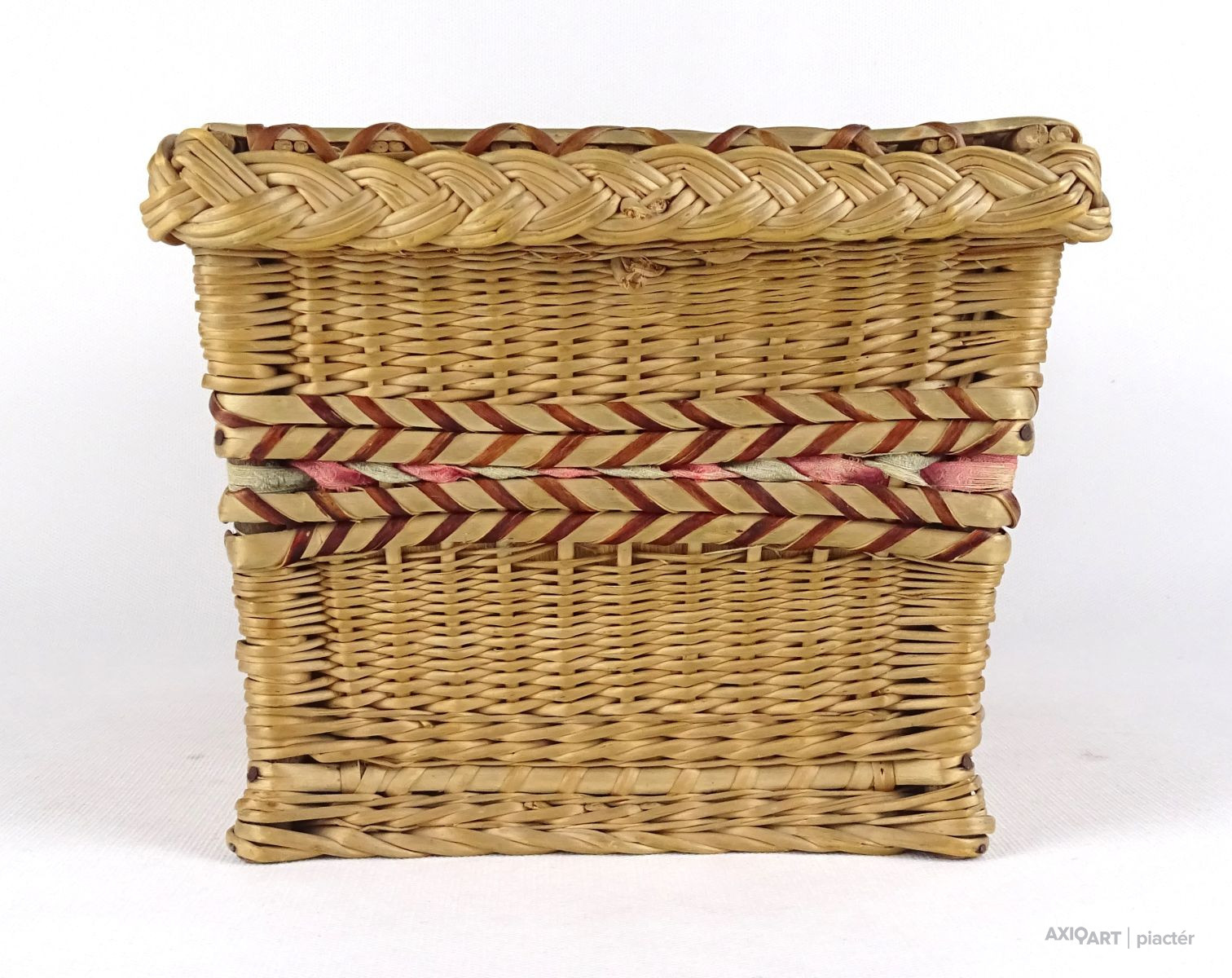 Régi, kis méretű fonott kosár. Míves, díszes fonási technikával készült, részletgazdag darab. Pici réz zár füllel rendelkezik. Belseje csipke szélű, varrott selyemmel bélelt. 1920-30-as évekbeli darab.