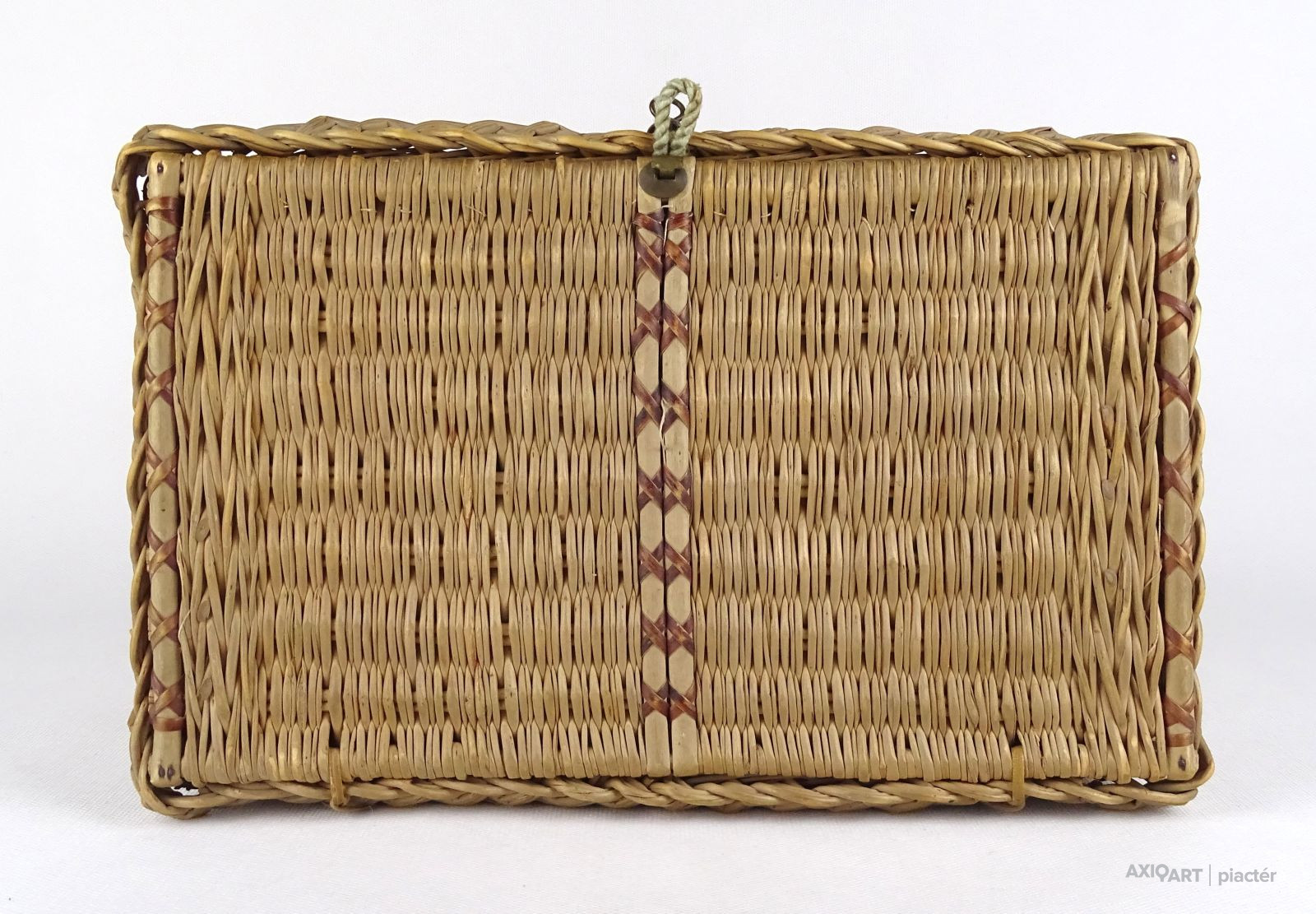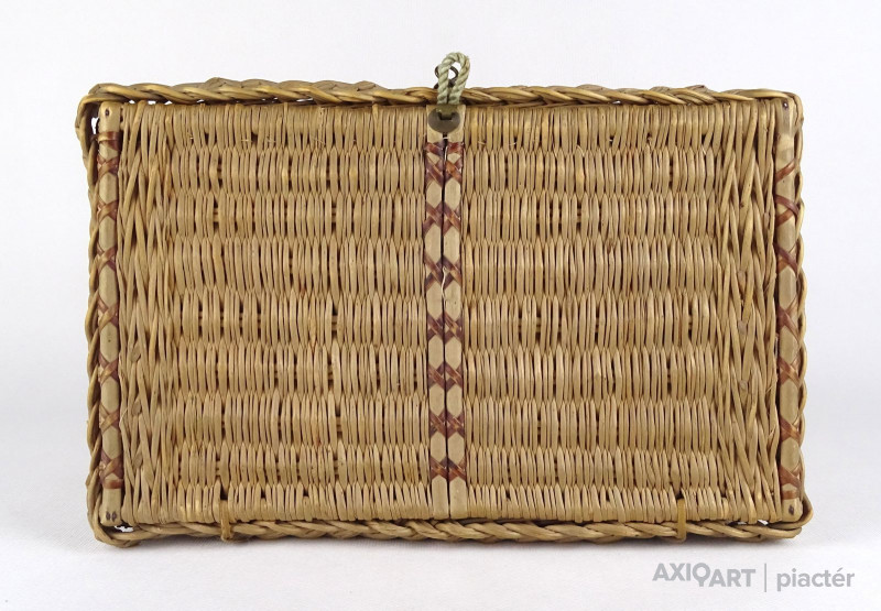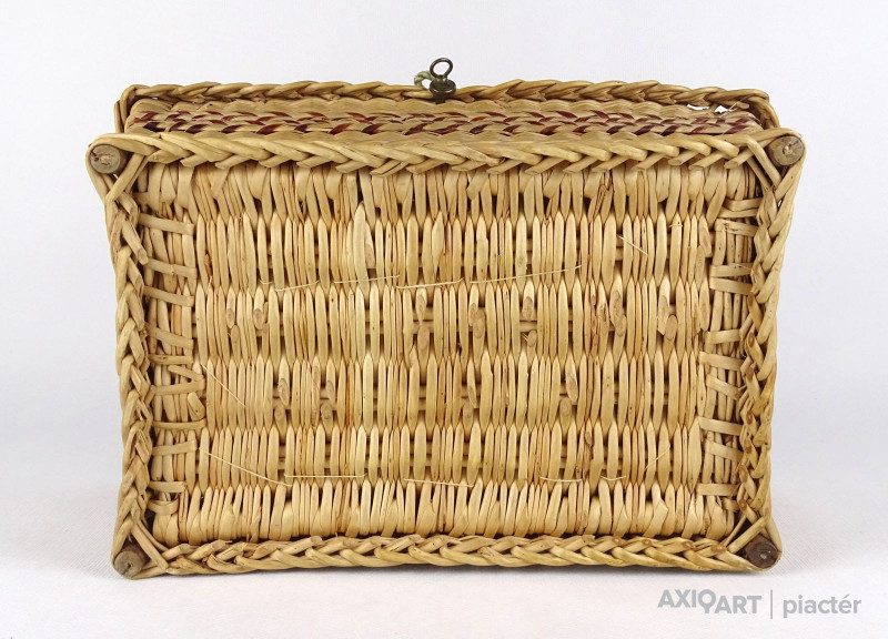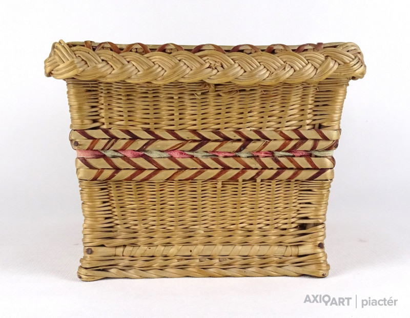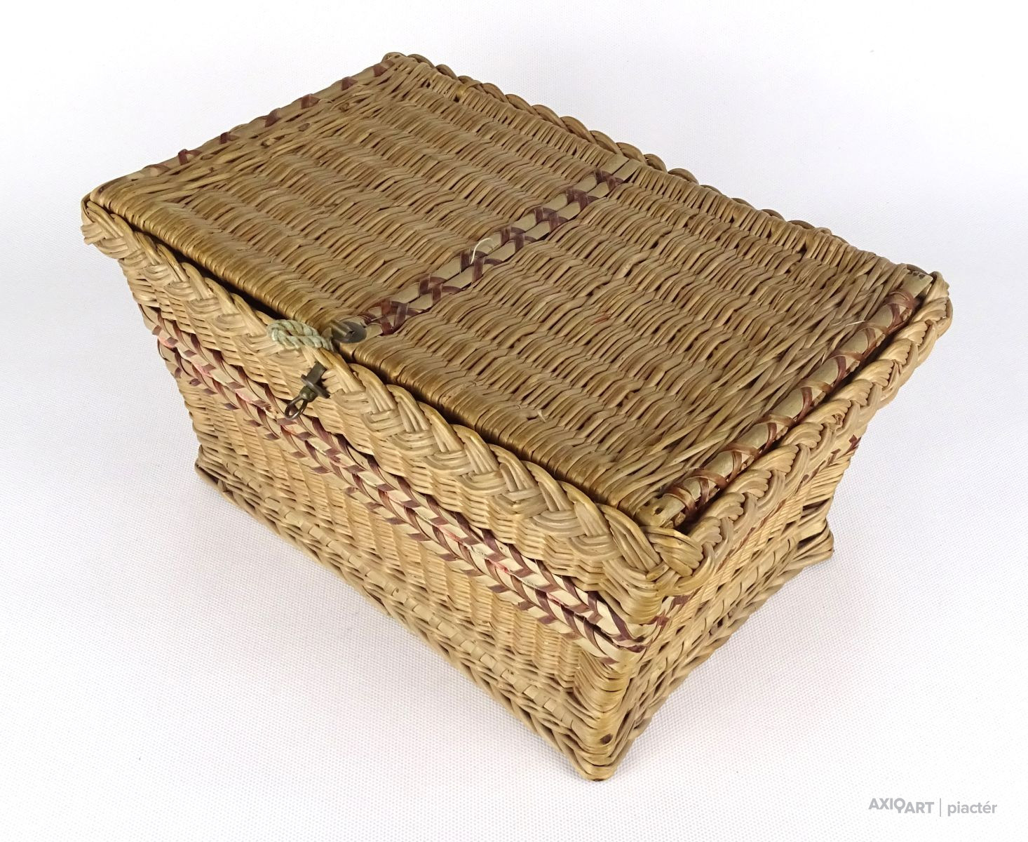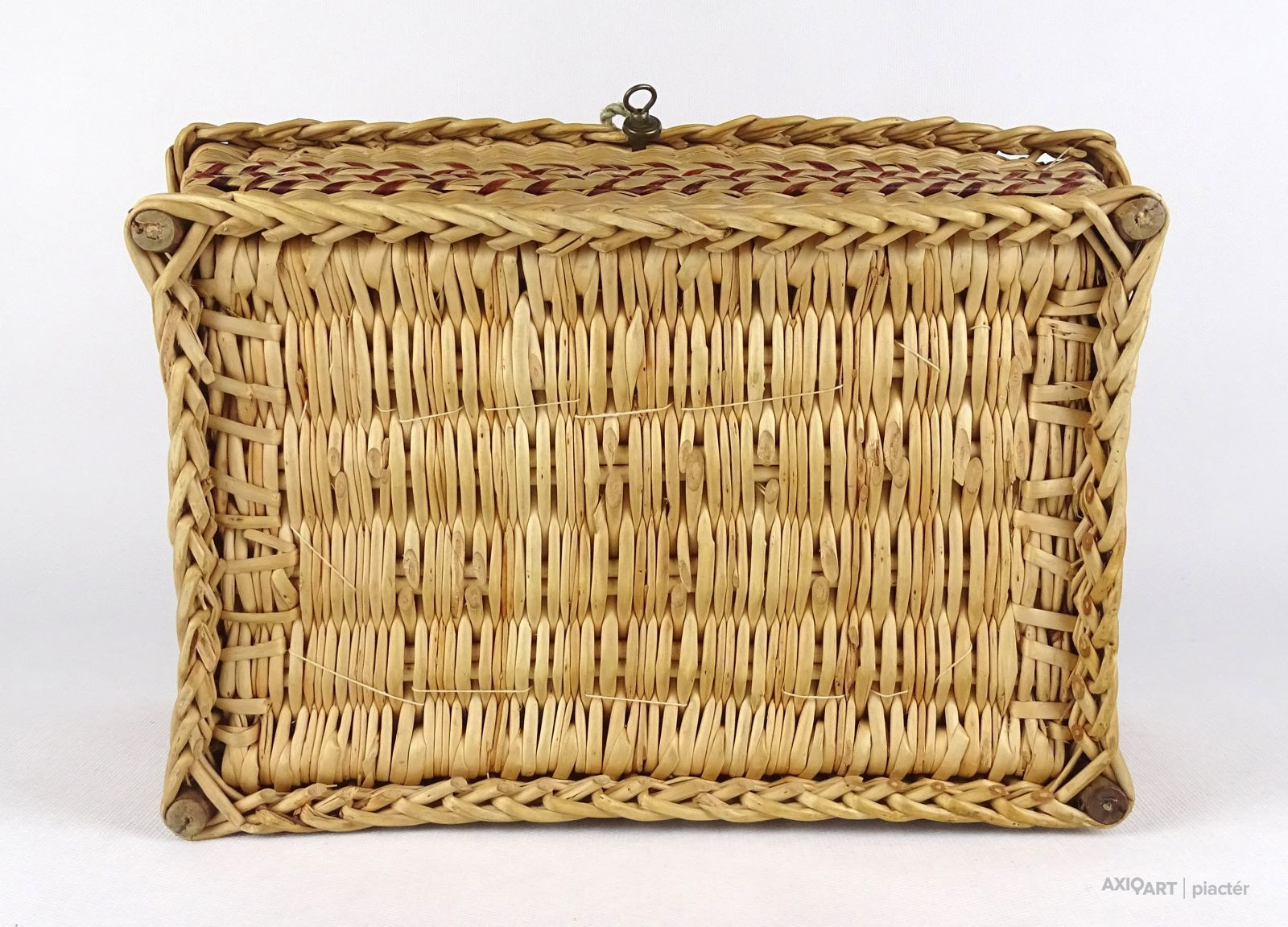 Régi, kis méretű fonott kosár. Míves, díszes fonási technikával készült, részletgazdag darab. Pici réz zár füllel rendelkezik. Belseje csipke szélű, varrott selyemmel bélelt. 1920-30-as évekbeli darab.