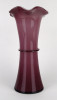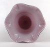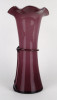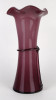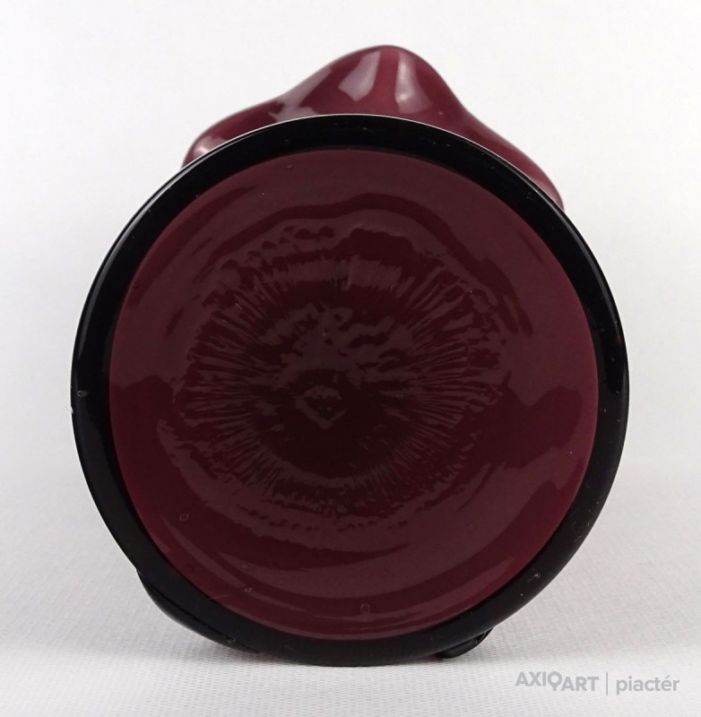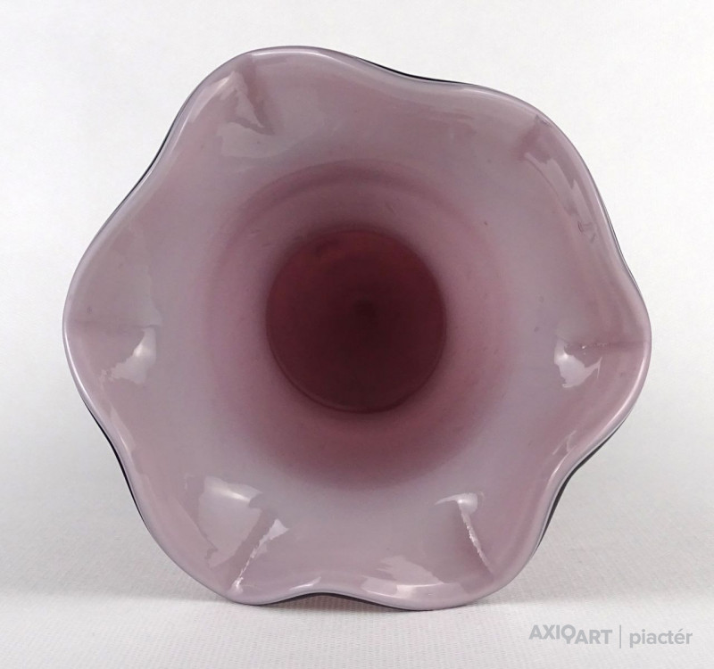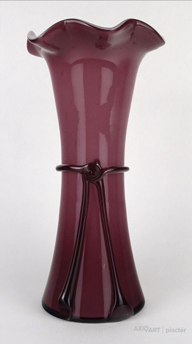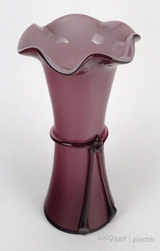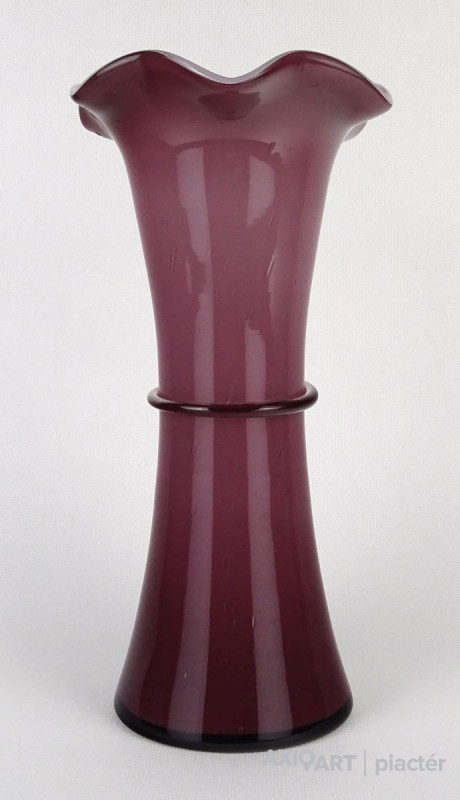 Hibátlan állapotú, lila színű színezett művészi üveg, fújt üveg váza fodros széllel és masnis díszítéssel. Talpán a fúvás, szakítás nyoma szépen kivehető.