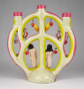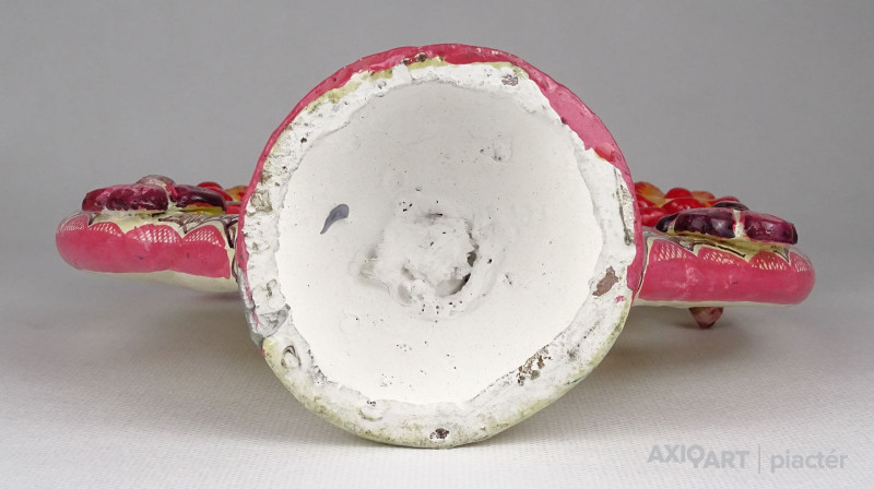 [1R938/X275] Hibátlan állapotú, kézzel festett, gazdagon díszített háromágú gipsz gyertyatartó. Naivista művészeti alkotás. Plasztikus Ádám és Éva díszítés mellett virágok, gyümölcsök, madarak és középen egy kígyó látható. Keletkezés helye és alkotója ismeretlen. 1/1-es egyedi darab! Magasság: 21.5 cm Szélesség: 20 cm Súly: 0.65 kg