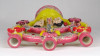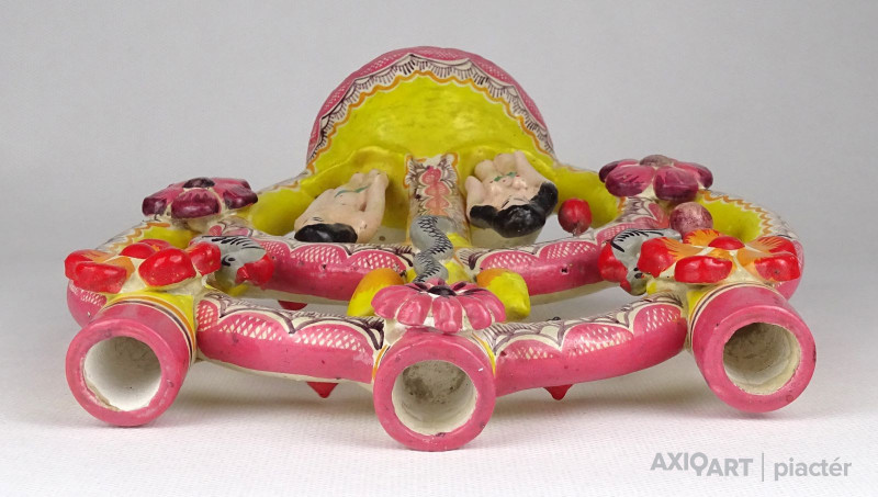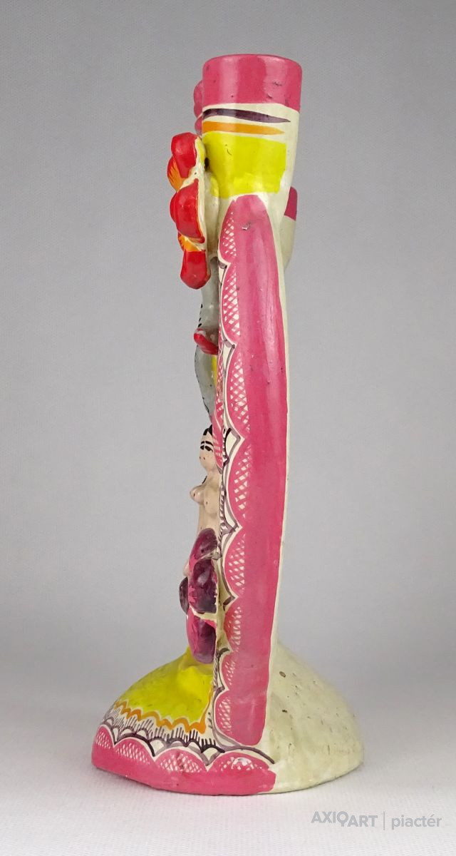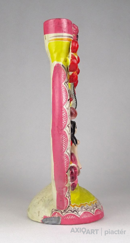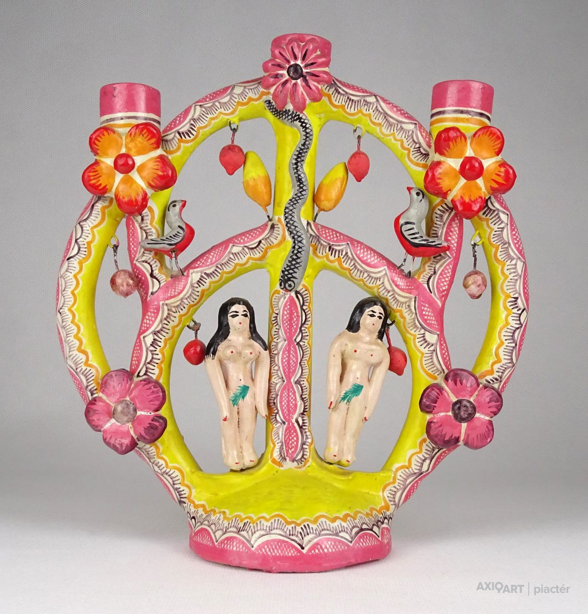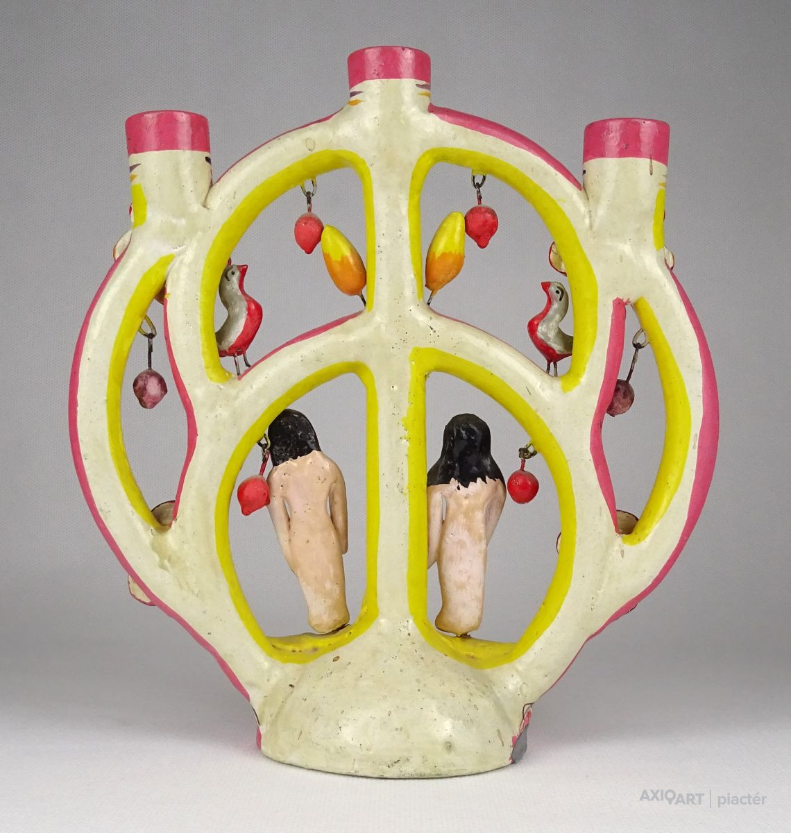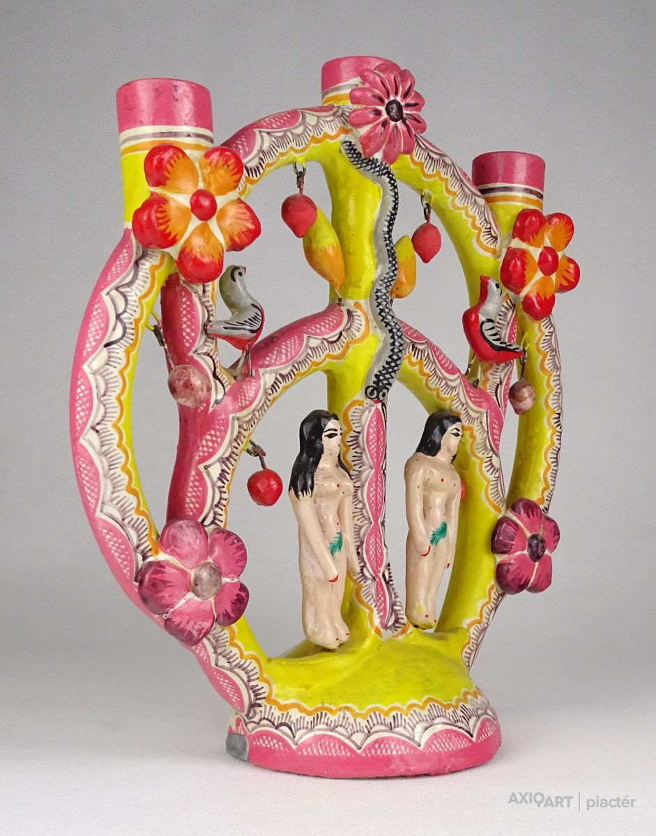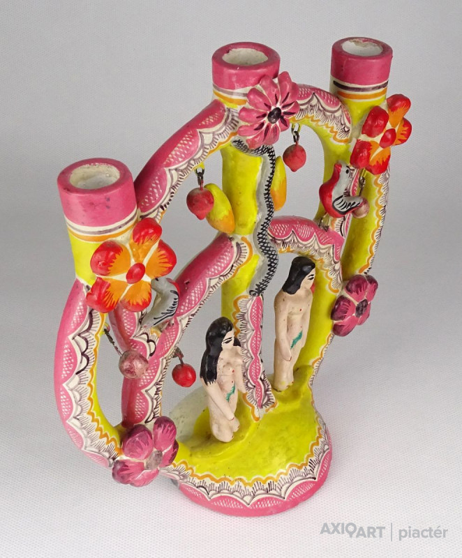 Hibátlan állapotú, kézzel festett, gazdagon díszített háromágú gipsz gyertyatartó. Naivista művészeti alkotás. Plasztikus Ádám és Éva díszítés mellett virágok, gyümölcsök, madarak és középen egy kígyó látható. Keletkezés helye és alkotója ismeretlen. 1/1-es egyedi darab!
