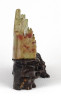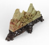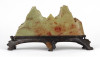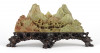 [1P265/Z017] Kézi faragású, régi zsírkő dísztárgy, szintén faragott kőzet talapzaton. Hegyvidéki tájat, hegyeket, fákat és egy házat ábrázoló faragás. Gyönyörű keleti dísztárgy. Magasság: 11 cm Szélesség: 21.5 cm Súly: 0.695 kg